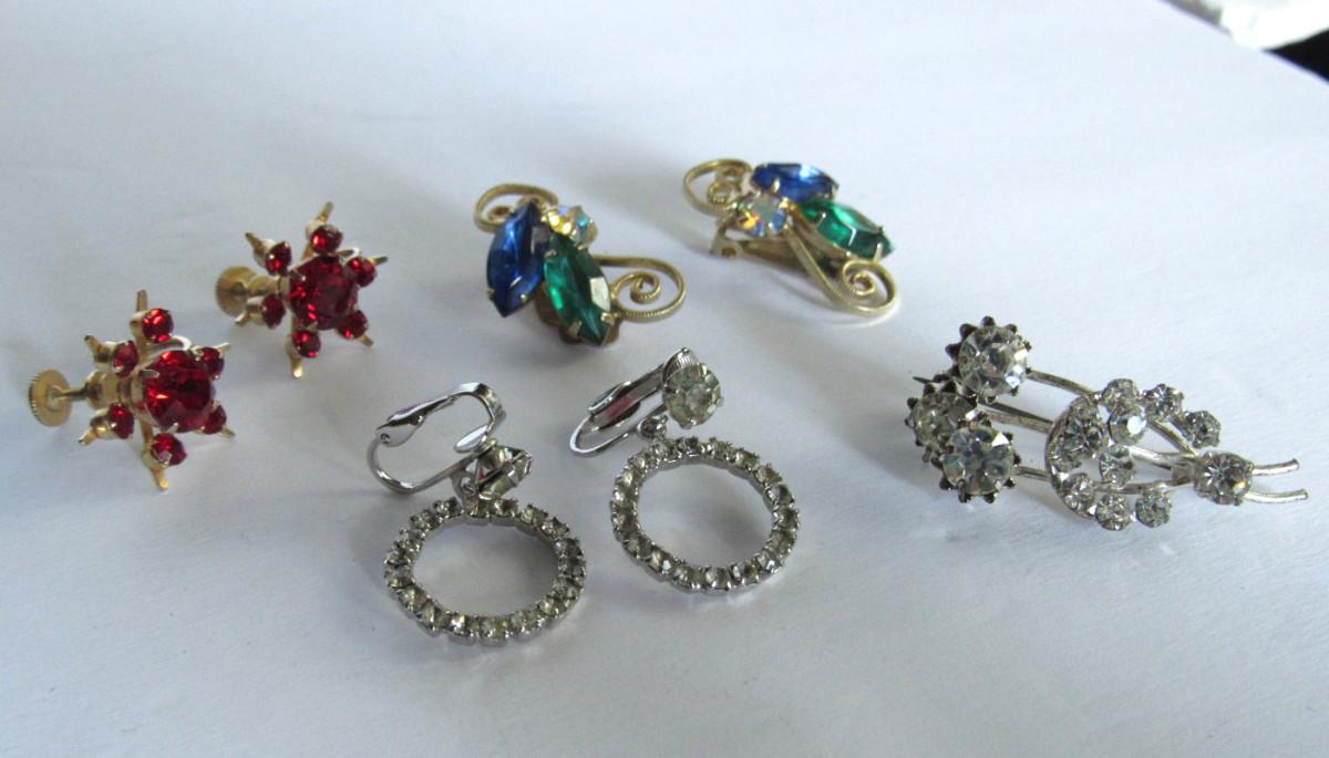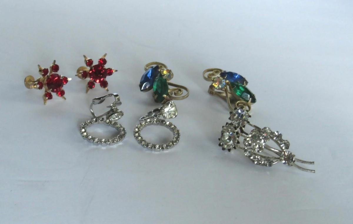 Nice shape. Only ones marked are the red rhinestone earrings marked Coro. Shipping is available at actual shipping cost plus $5.00 handling fee per box for supplies/labor. See our terms for details. All sales are final. Condition notes may not be all inclusive, we may miss some issues as most vintage items are not in mint condition and have some degree of wear, paint loss, etc, but we always try to note obvious damage.
