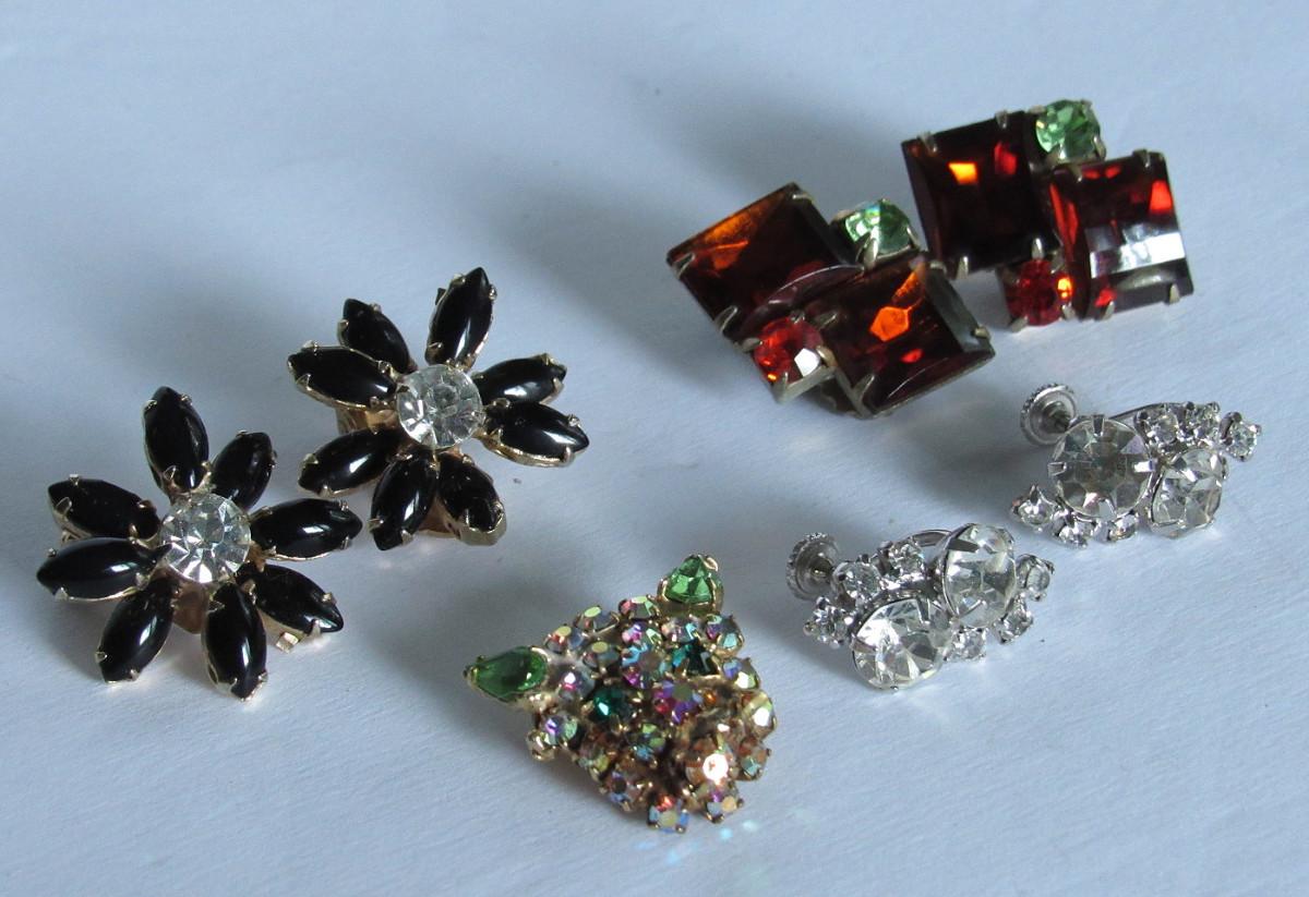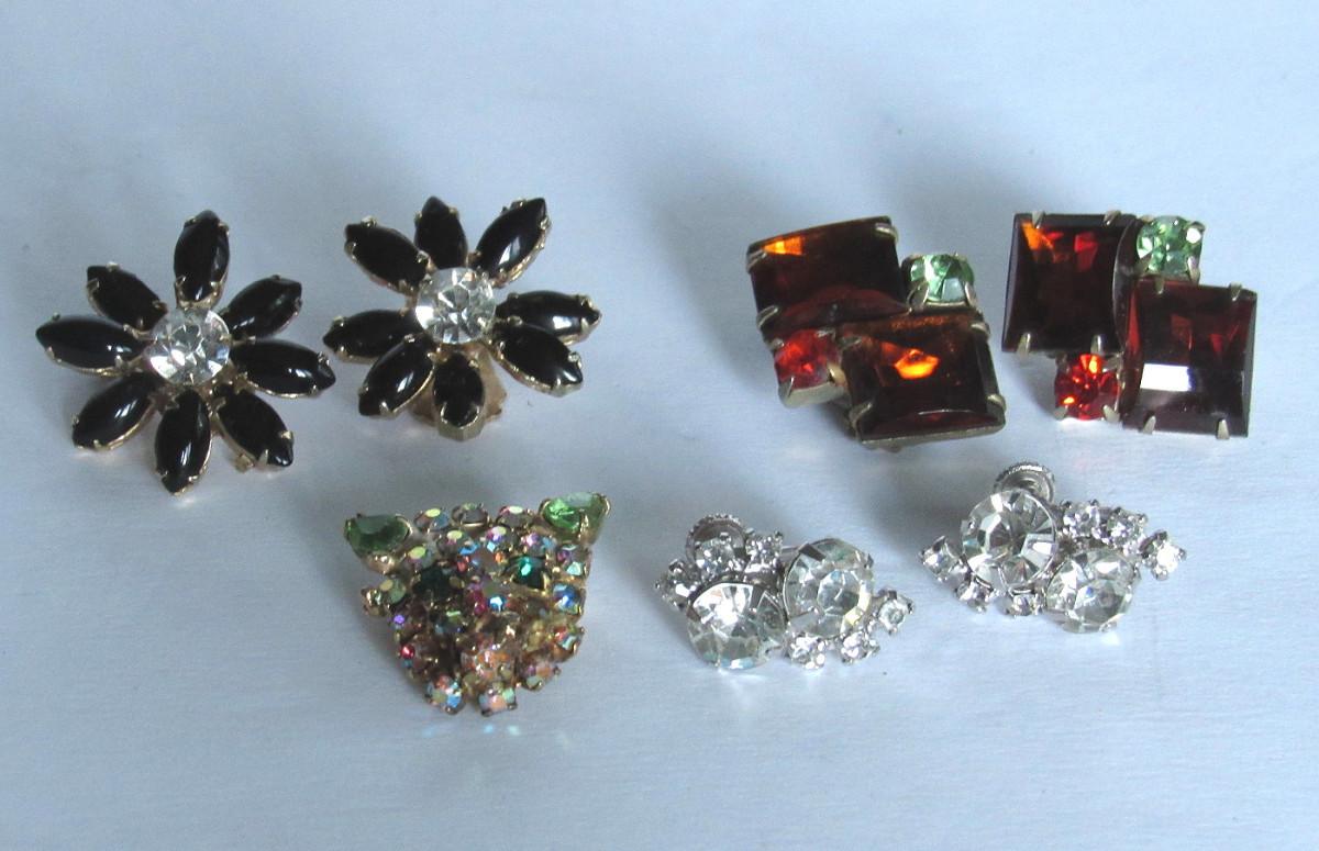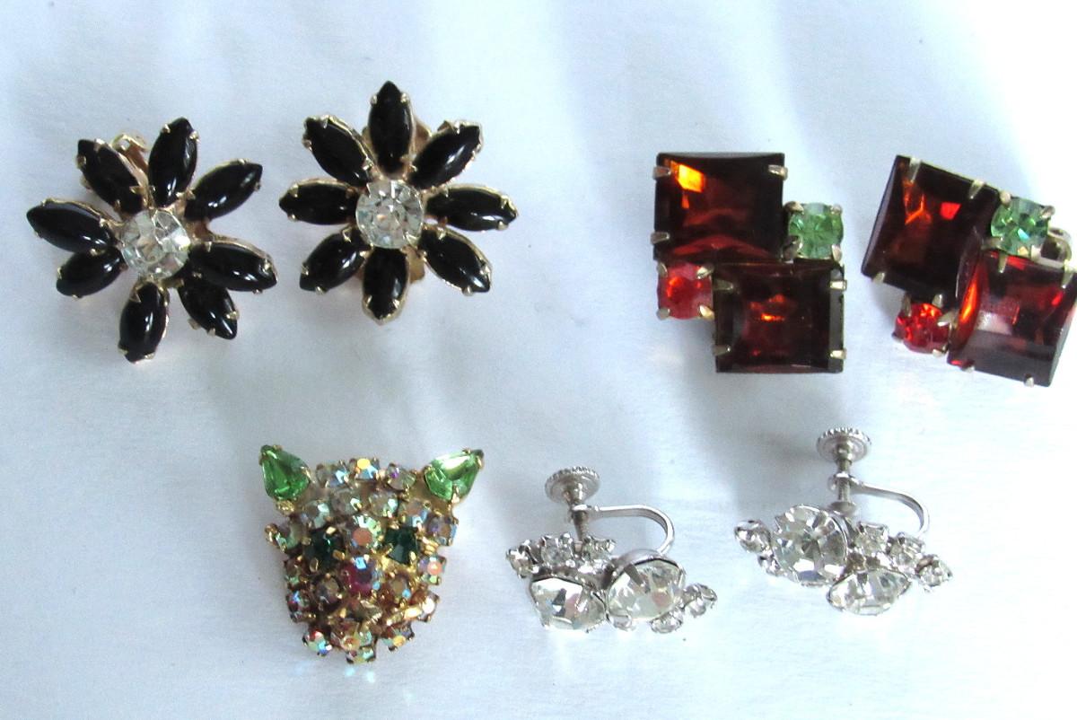 All in nice shape. None of the earrings are marked, look so much nicer in person than in my photos. The cat head is nice, but you really can't make it out in my crappy pics. Note, it does have some of that creamy jewelry cleaner in between some of the stones and needs to be brushed clean. Otherwise very nice but unmarked. Shipping is available at actual shipping cost plus $5.00 handling fee per box for supplies/labor. See our terms for details. All sales are final. Condition notes may not be all inclusive, we may miss some issues as most vintage items are not in mint condition and have some degree of wear, paint loss, etc, but we always try to note obvious damage.