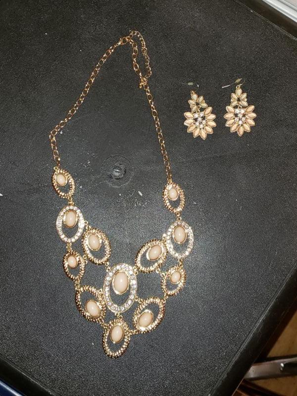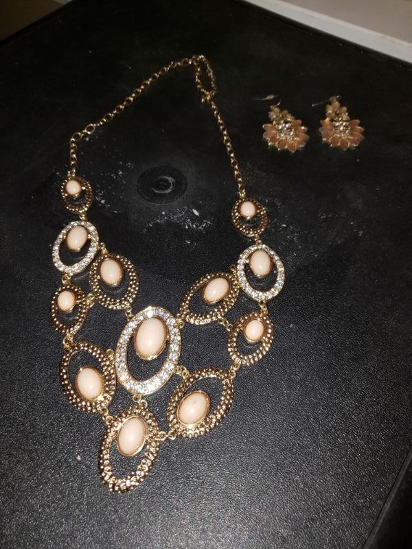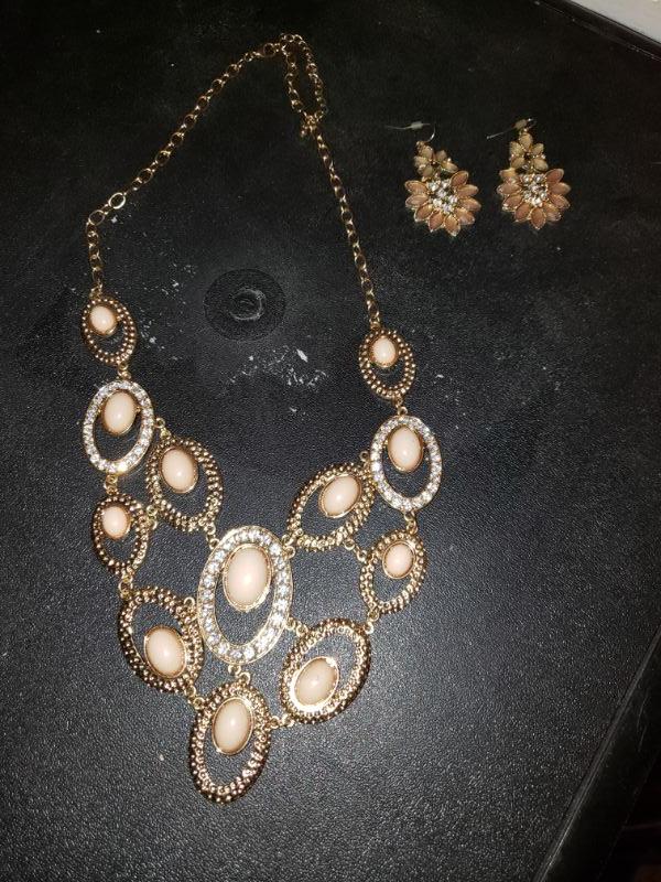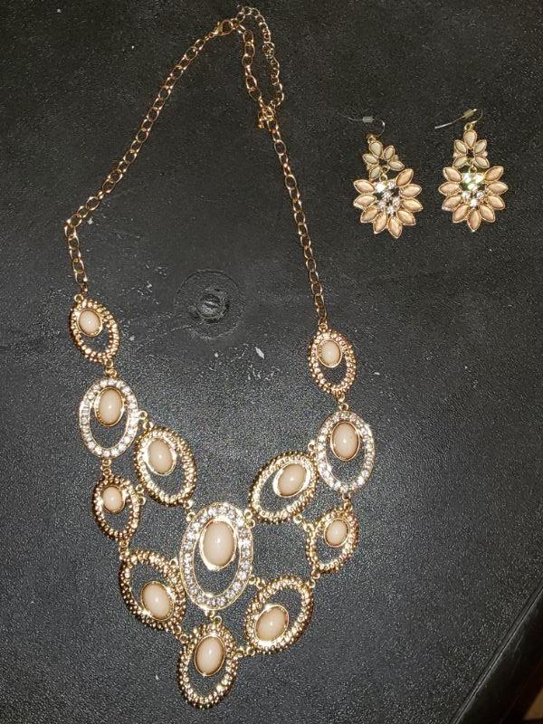 Rhinestone Gold Tone Statement Bib Necklace Pink White Plastic Chunky Cascading