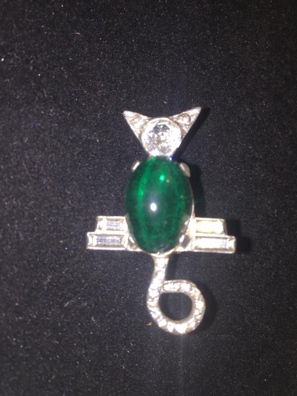 This is perfect little kitty to put on your scarf or coat. Very vibrant green stone surrounded by rhinestones