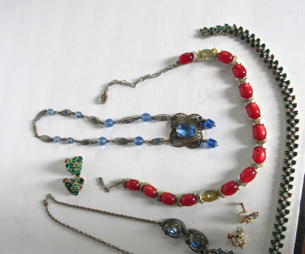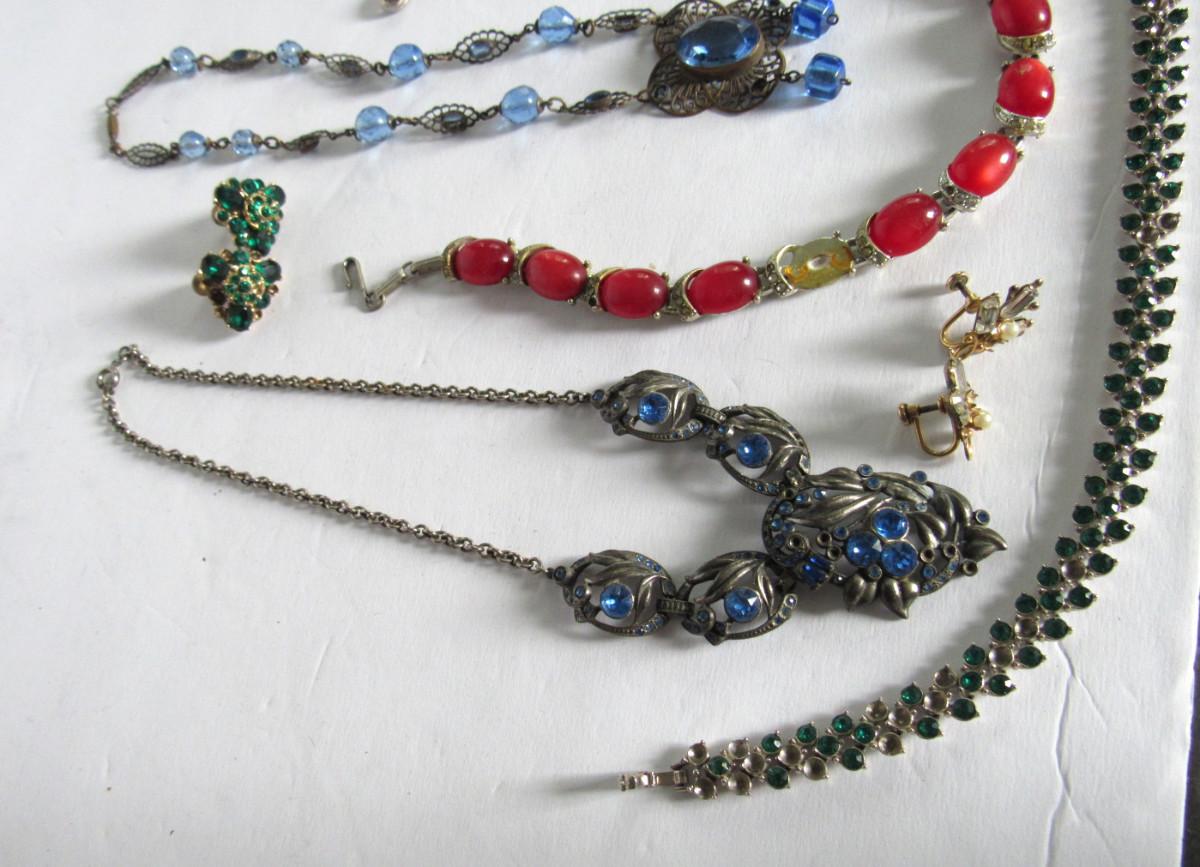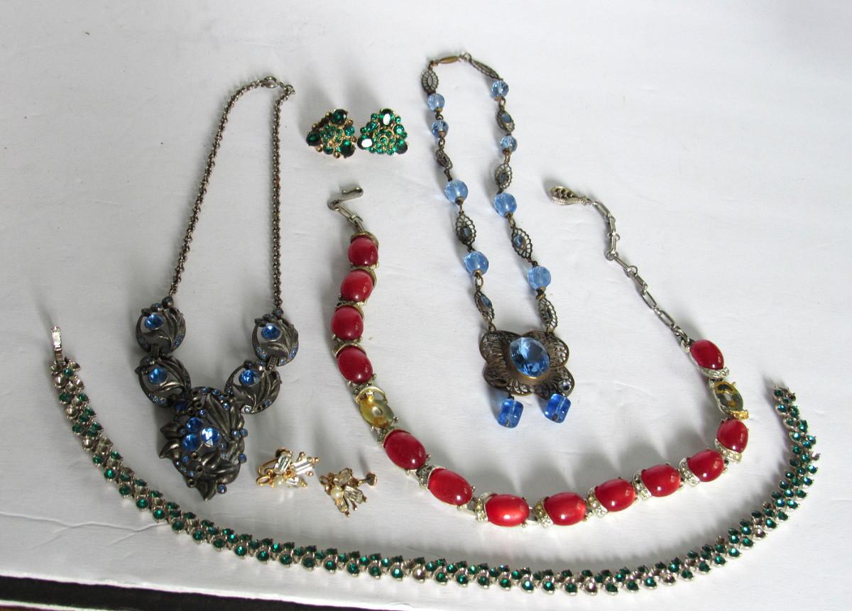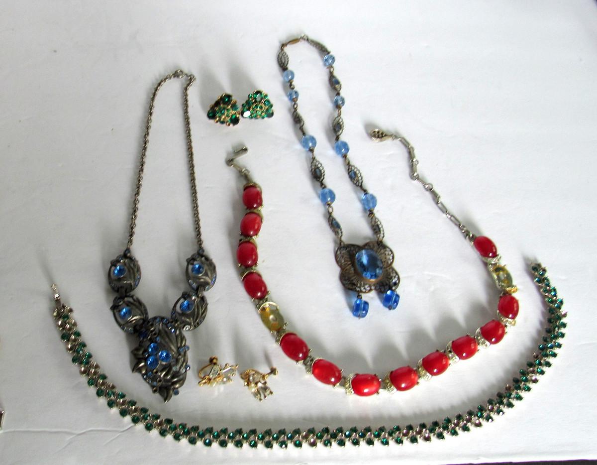 The green necklace is so beautiful, needs a number of green rhinestones, The older blue necklace is made in Czechoslovakia and I think the beads are glass. It just needs 4 small blue rhinestones in the center piece. Marked ORA on back. Blue necklace needs a lot of blue stones. The red necklace needs 2 cabochons, one is there but fell off. I think they are plastic. The green earrings just need a few stones. The clear earrings just need a couple faux pearls. Marked Amco gold filled. Shipping is available at actual shipping cost plus $5.00 handling fee per box for supplies/labor. See our terms for details. All sales are final. Condition notes may not be all inclusive, we may miss some issues as most vintage items are not in mint condition and have some degree of wear, paint loss, etc, but we always try to note obvious damage.