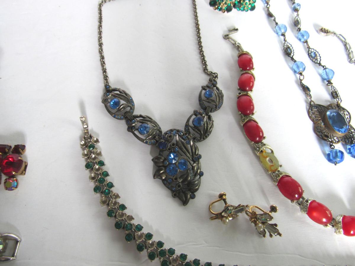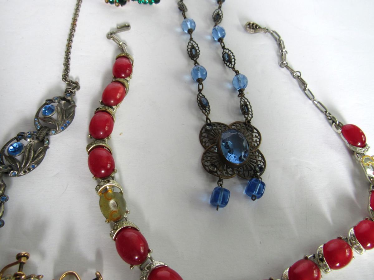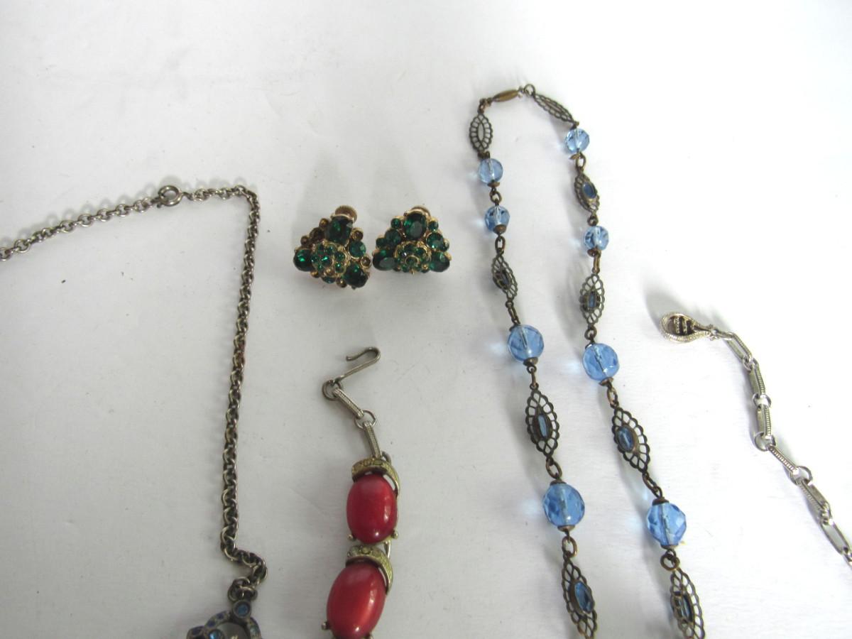 The green necklace is so beautiful, needs a number of green rhinestones, The older blue necklace is made in Czechoslovakia and I think the beads are glass. It just needs 4 small blue rhinestones in the center piece. Marked ORA on back. Blue necklace needs a lot of blue stones. The red necklace needs 2 cabochons, one is there but fell off. I think they are plastic. The green earrings just need a few stones. The clear earrings just need a couple faux pearls. Marked Amco gold filled. Shipping is available at actual shipping cost plus $5.00 handling fee per box for supplies/labor. See our terms for details. All sales are final. Condition notes may not be all inclusive, we may miss some issues as most vintage items are not in mint condition and have some degree of wear, paint loss, etc, but we always try to note obvious damage.