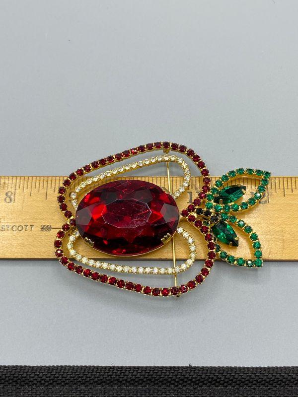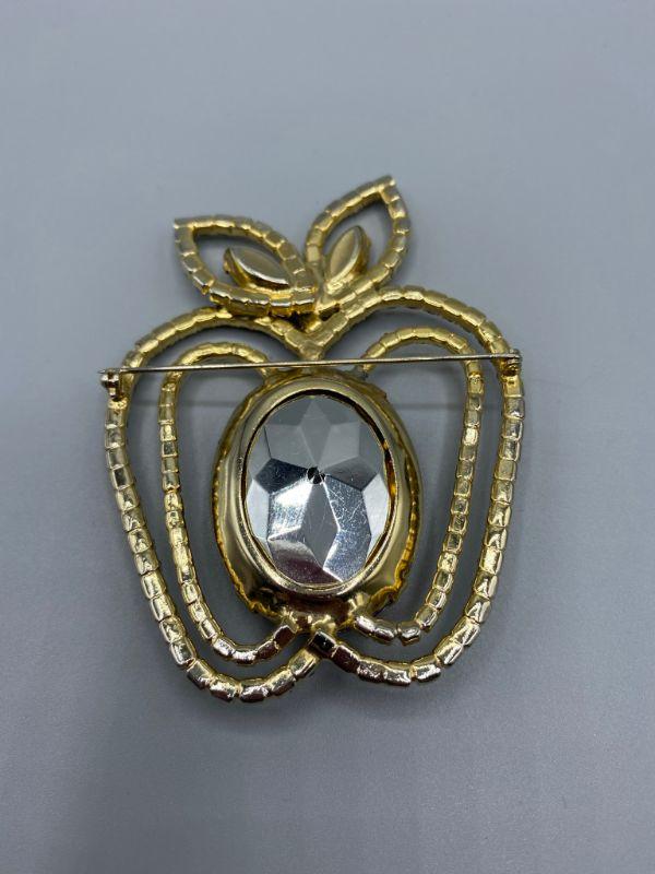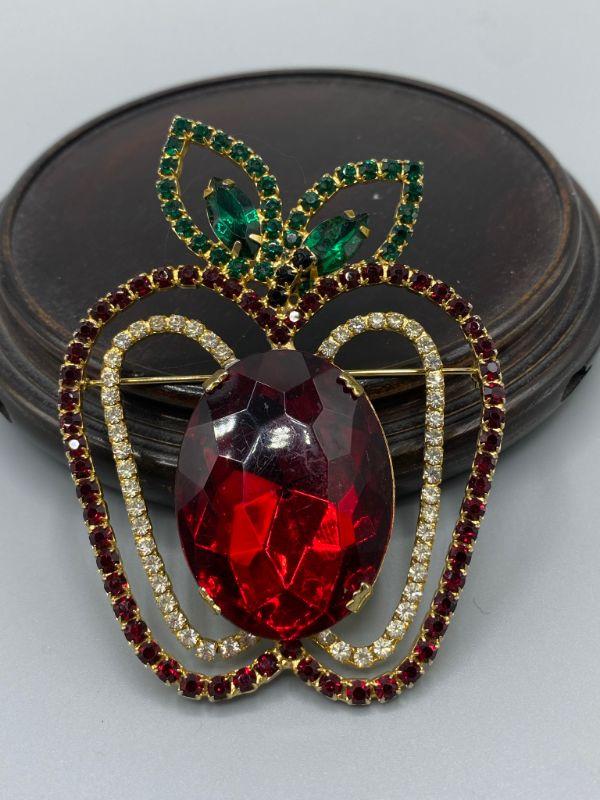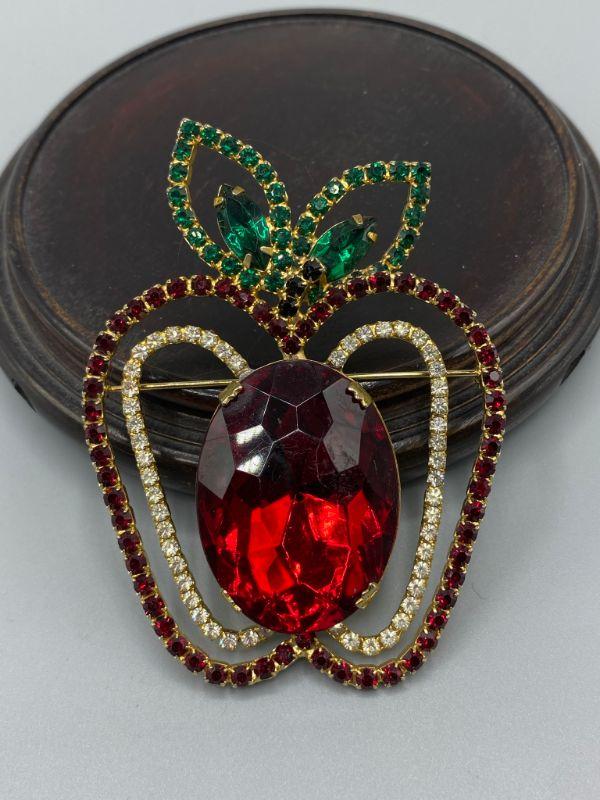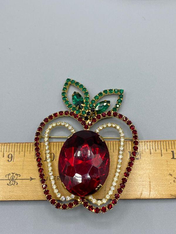 Cute rhinestone apple pin. goldtone setting with red, green, and white small stones and a large red stone center. Unsigned. About 3.5" size.