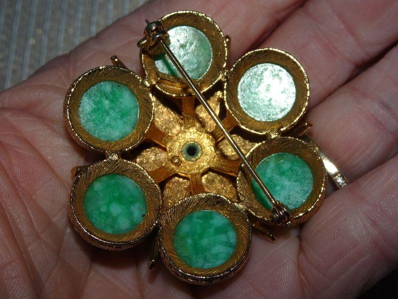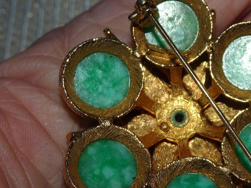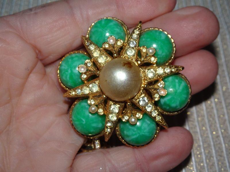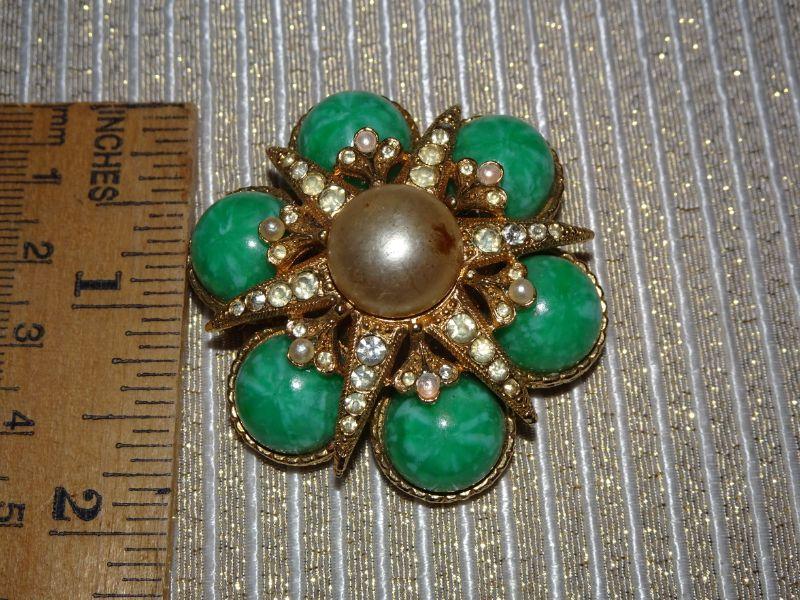 Rhinestones, Pearls Faux Green Stone Gold Tone Brooch