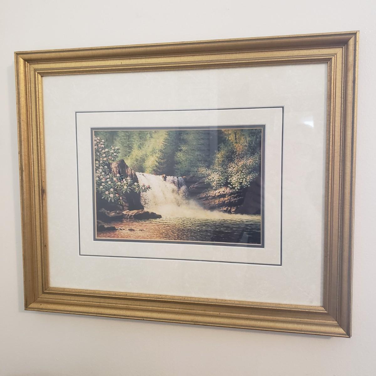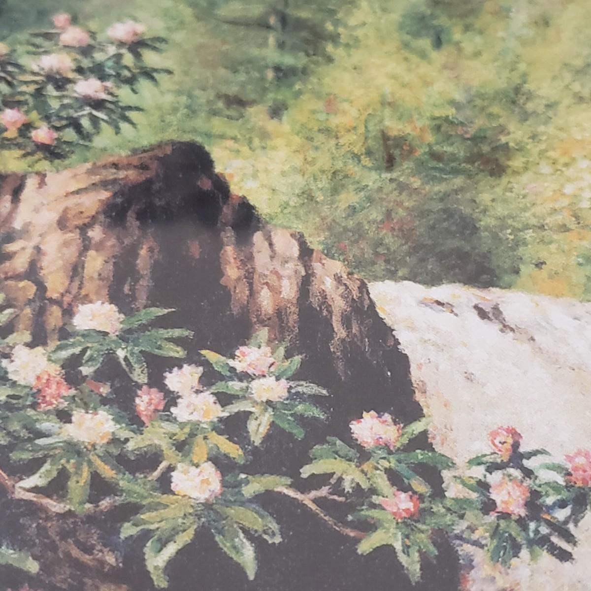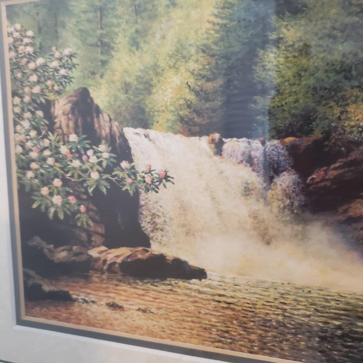 This gold colored wooden frame holds a print by Shryack. The picture is of a beautiful blooming rhododendrons and a waterfall. The glass cased frame measures 16" x 19".