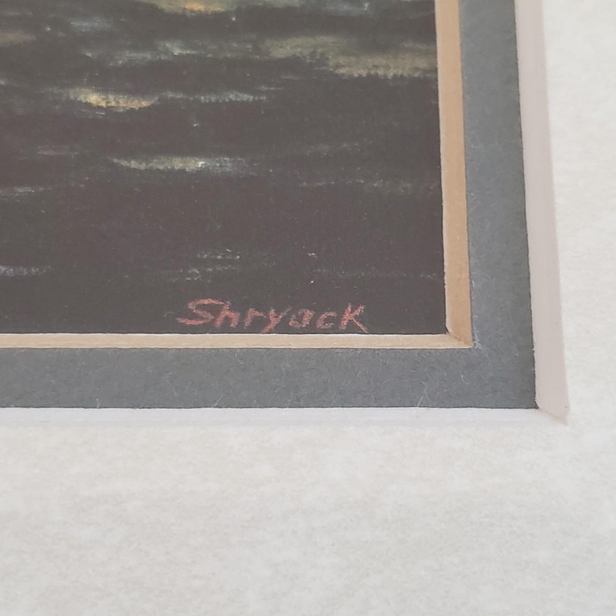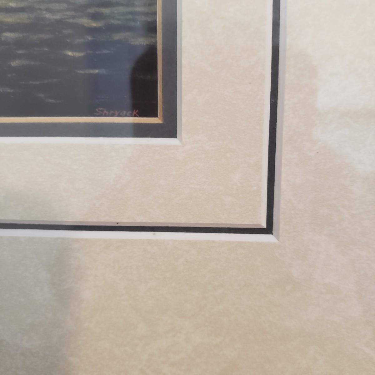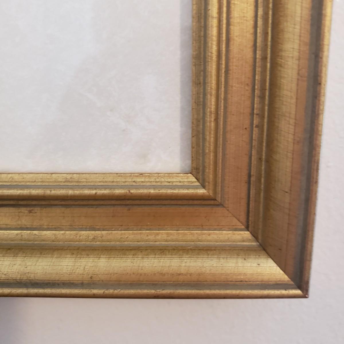 This gold colored wooden frame holds a print by Shryack. The picture is of a beautiful blooming rhododendrons and a waterfall. The glass cased frame measures 16" x 19".