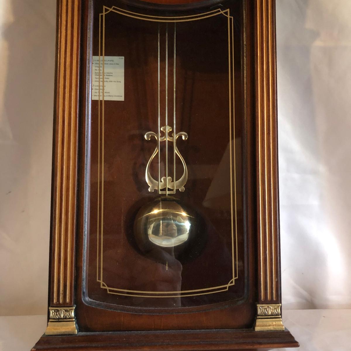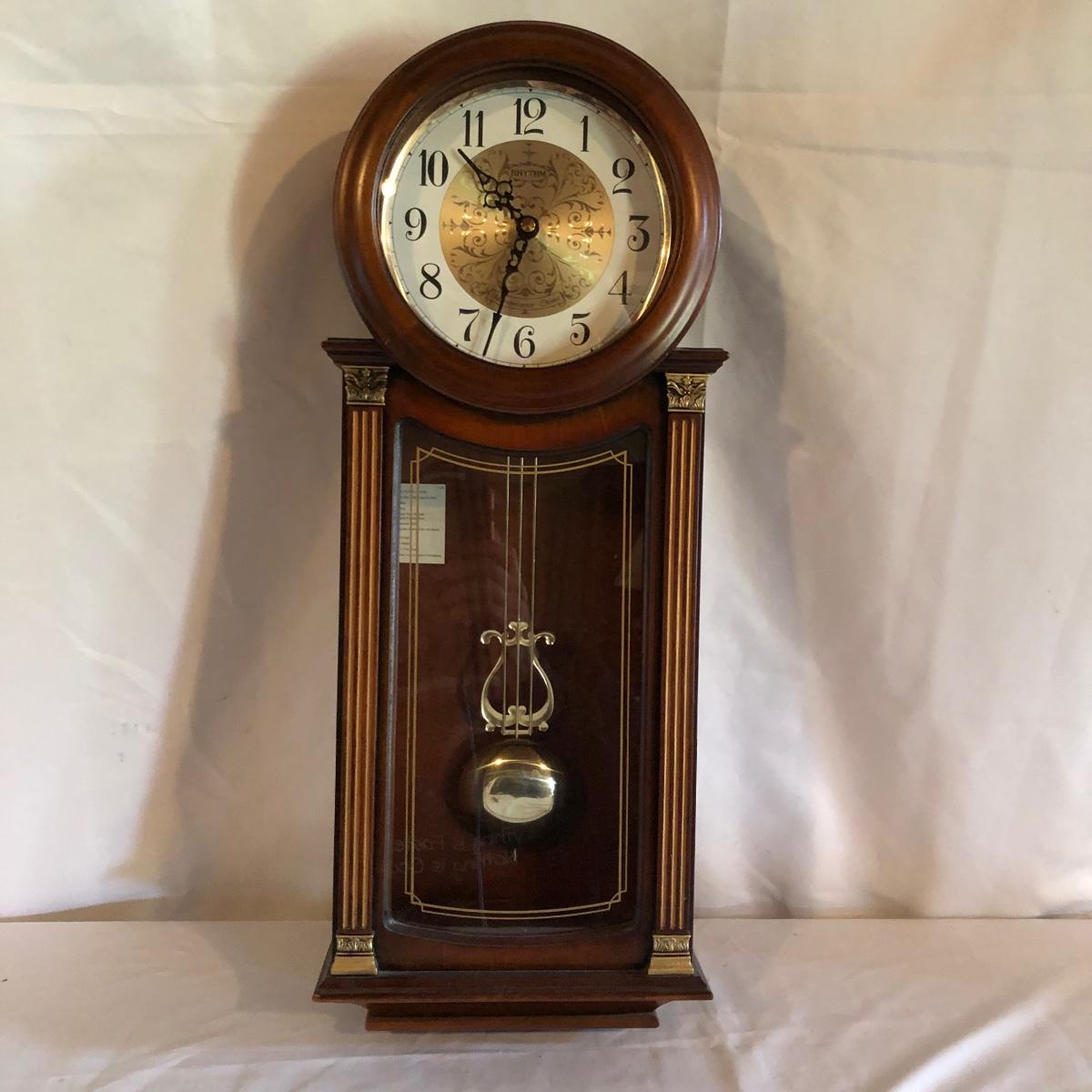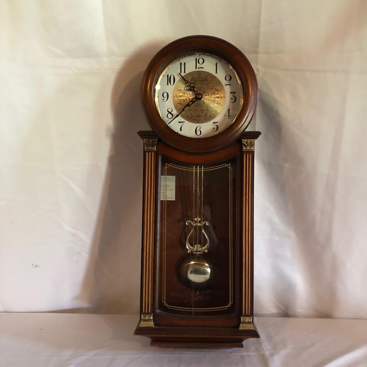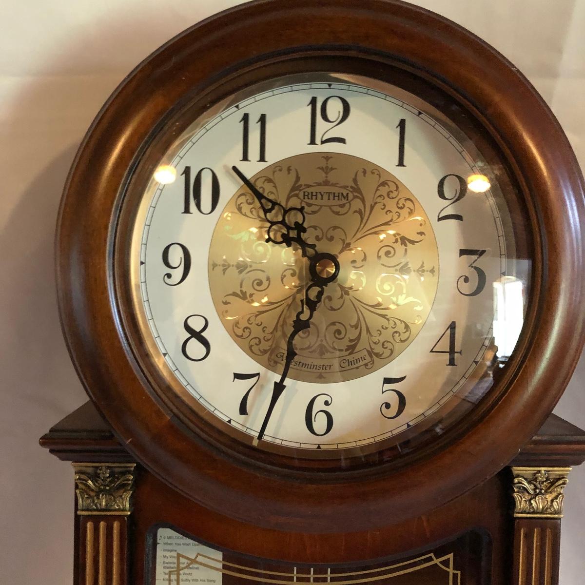 Lot includes Rhythm wall clock that is a wooden body with plexiglass front. Clock and chimes worked when tested.
