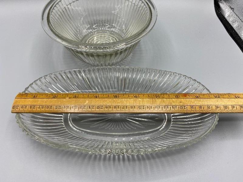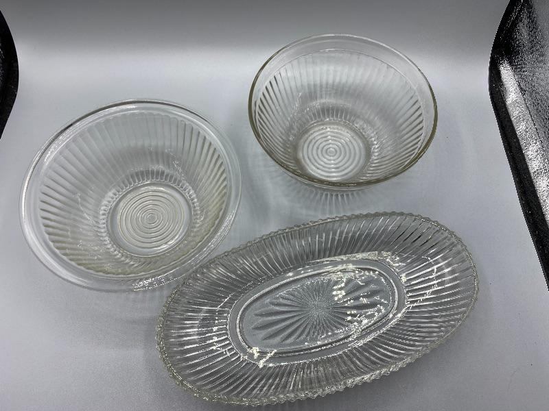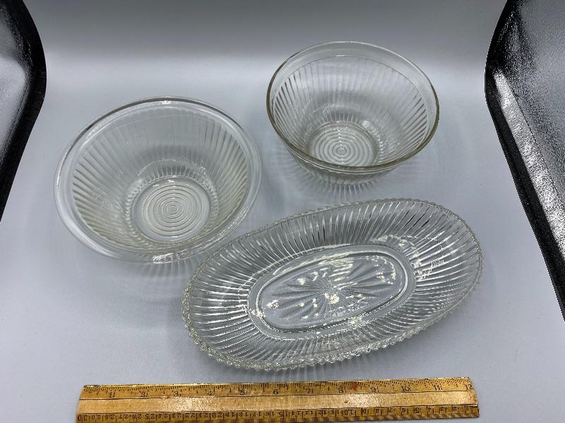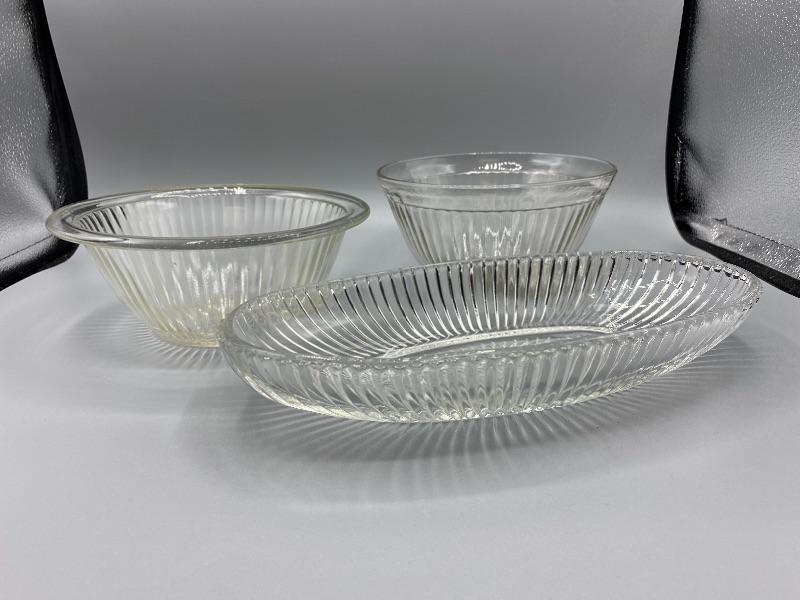 3 ribbed glass dishes. Two soup size bowls and a oval relish dish. Good condition, no chips.