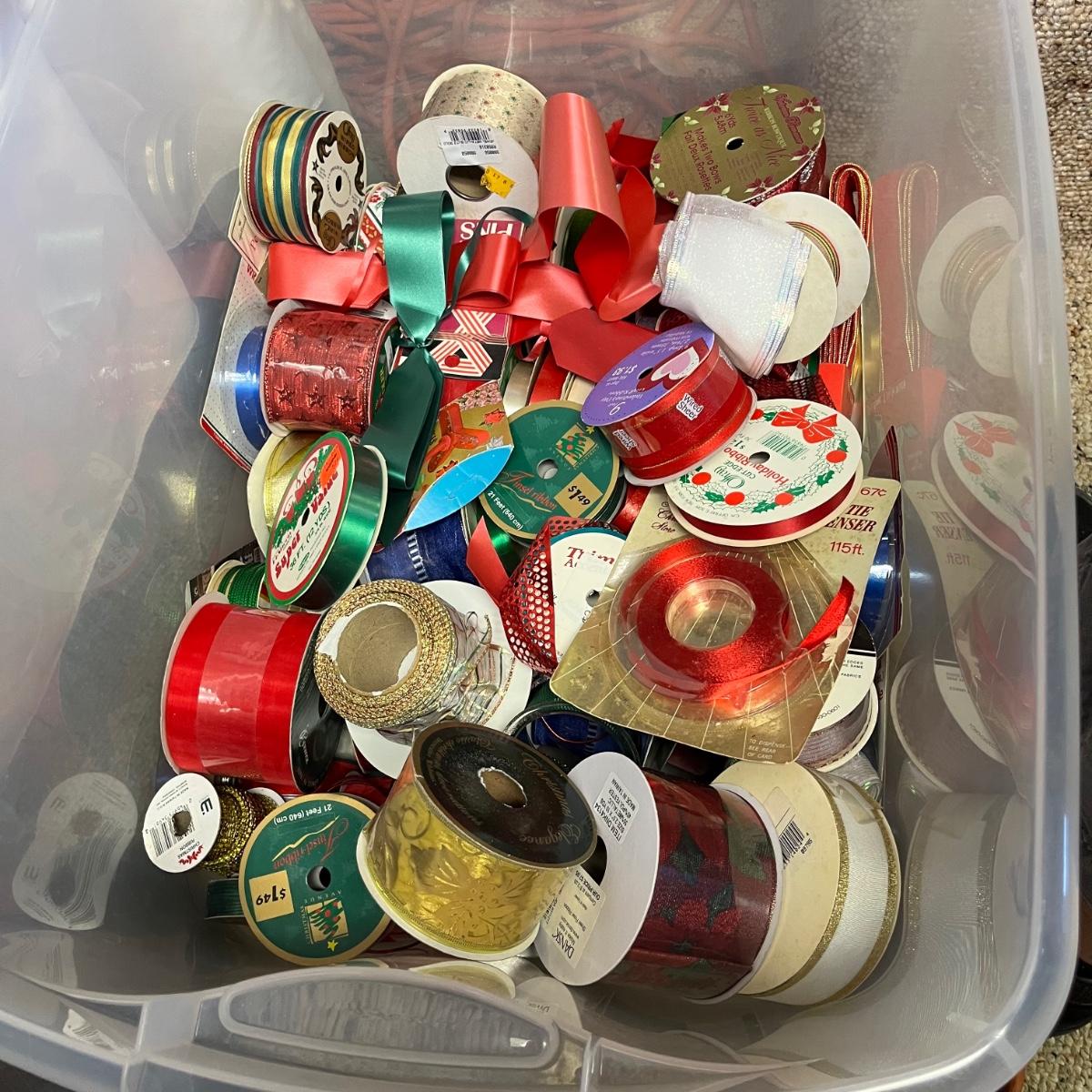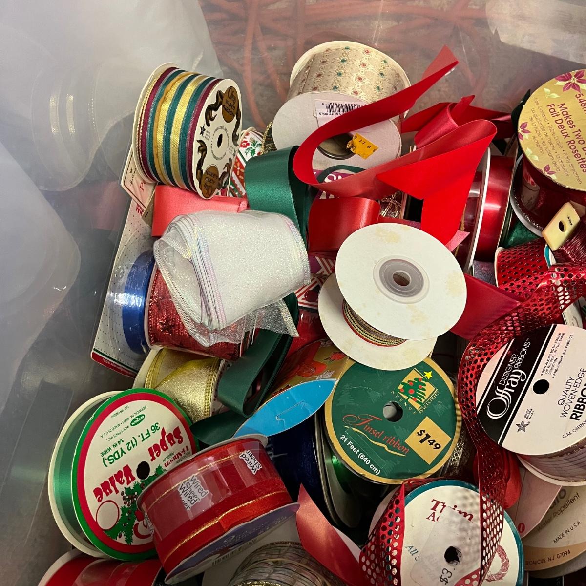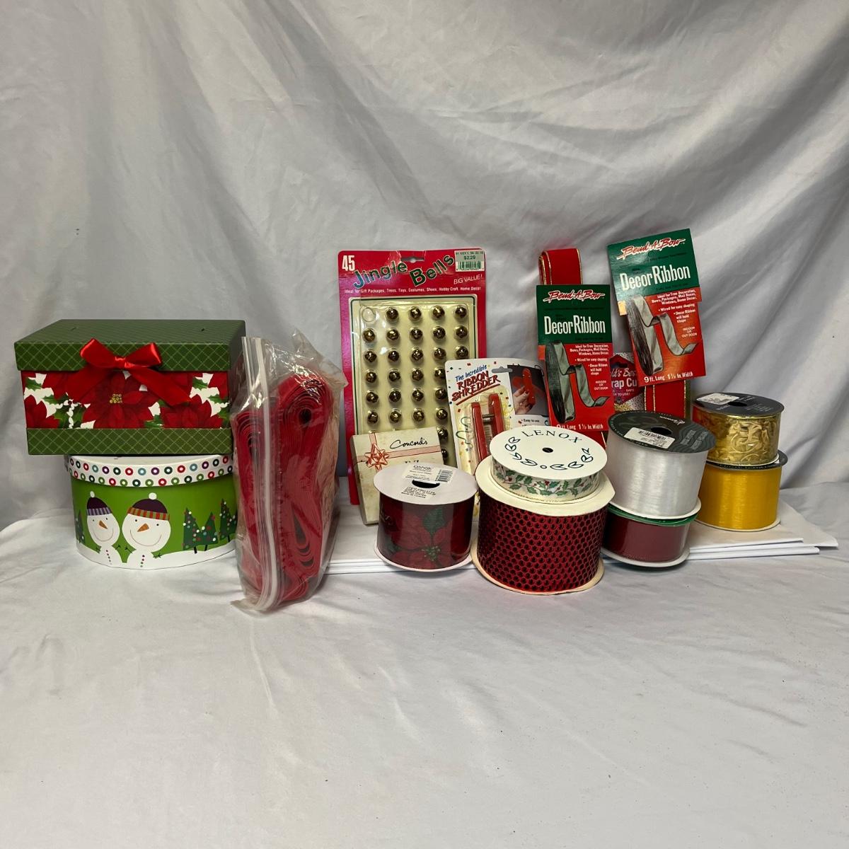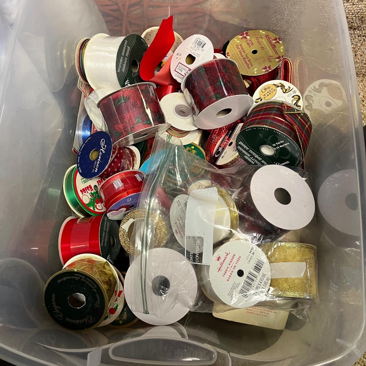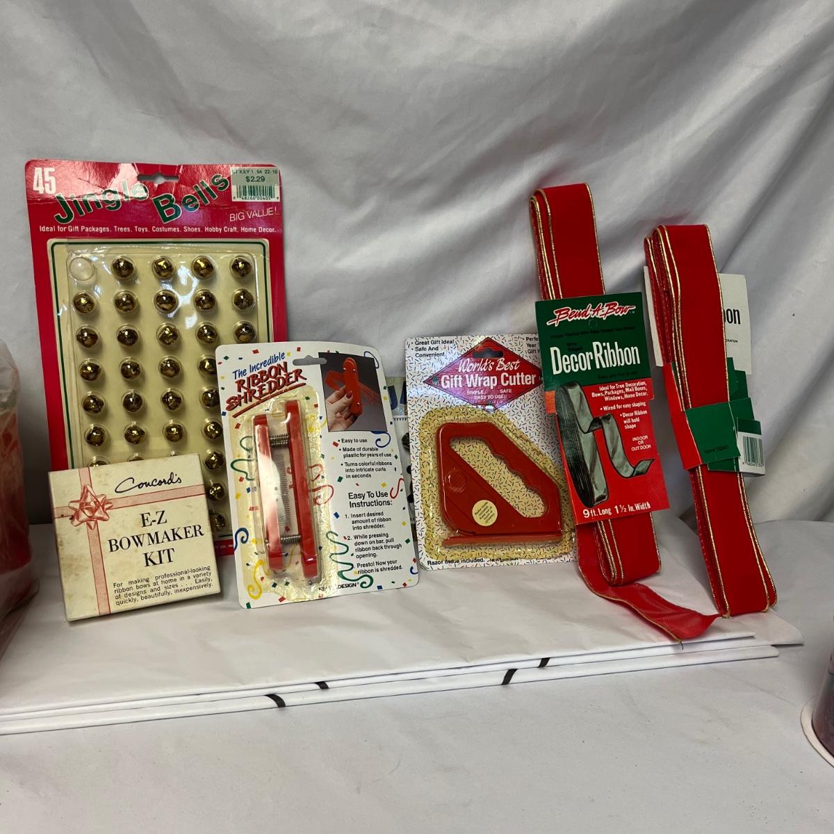Lot includes a large selection of ribbon in a variety of colors and sizes. Also includes bells. Bow making kit, ribbon shredder and more.