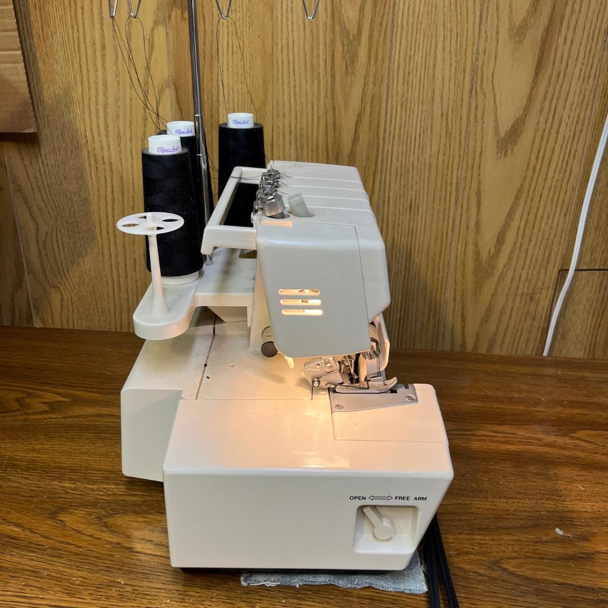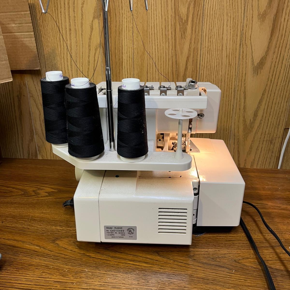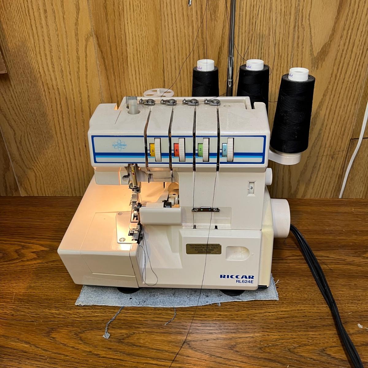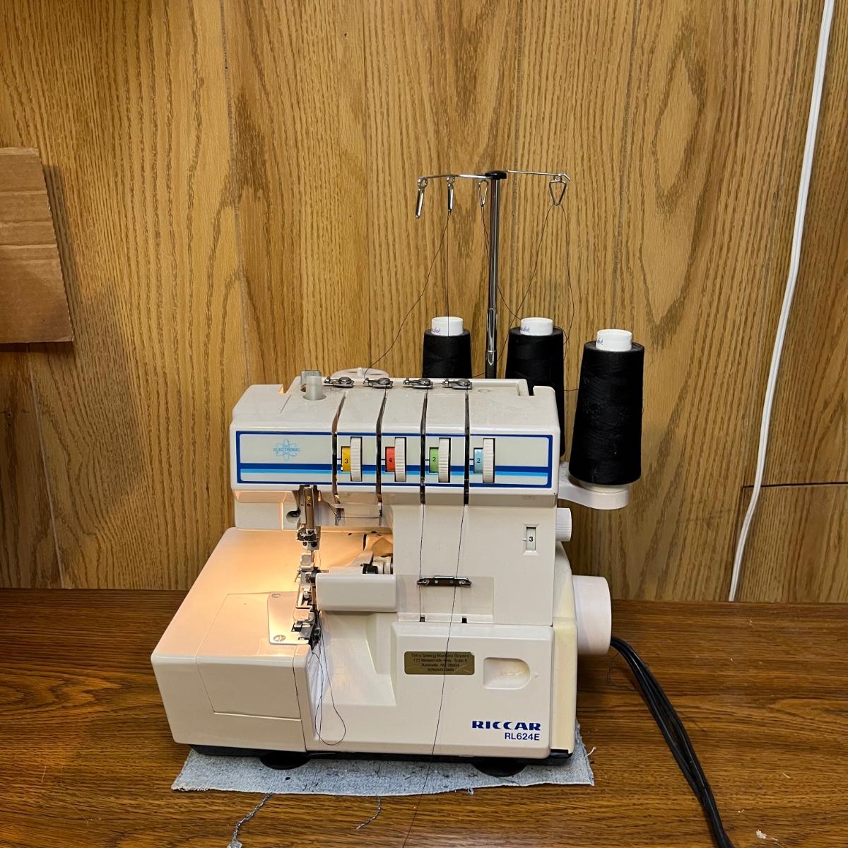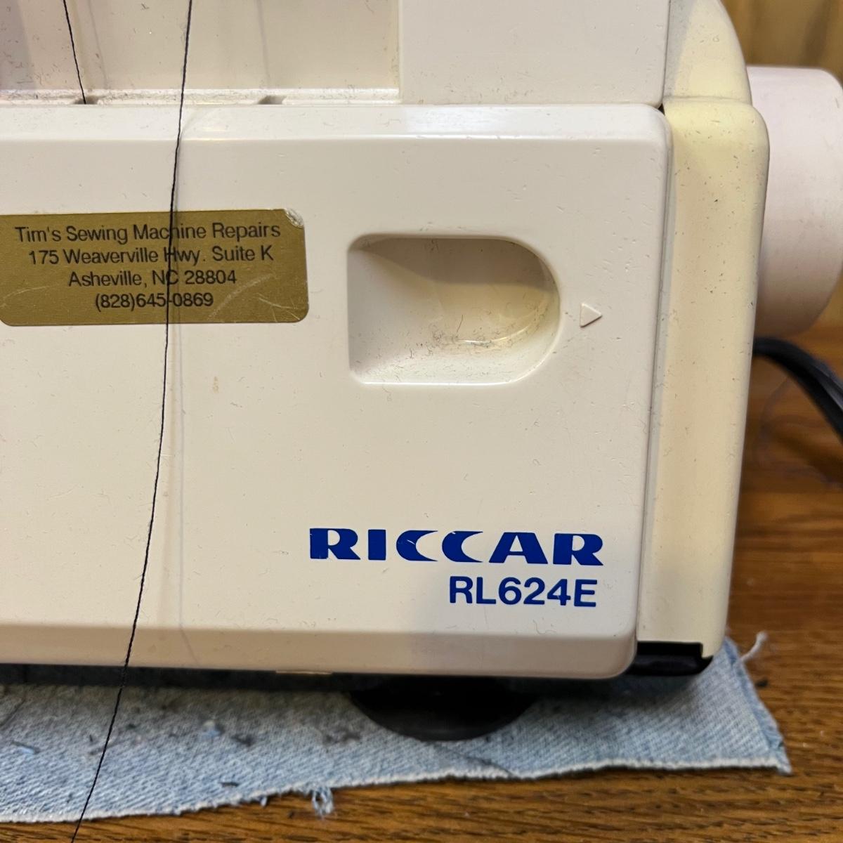 Lot includes a Riccar RL624E 3-4 spool knit lock. Machine powered on when tested.