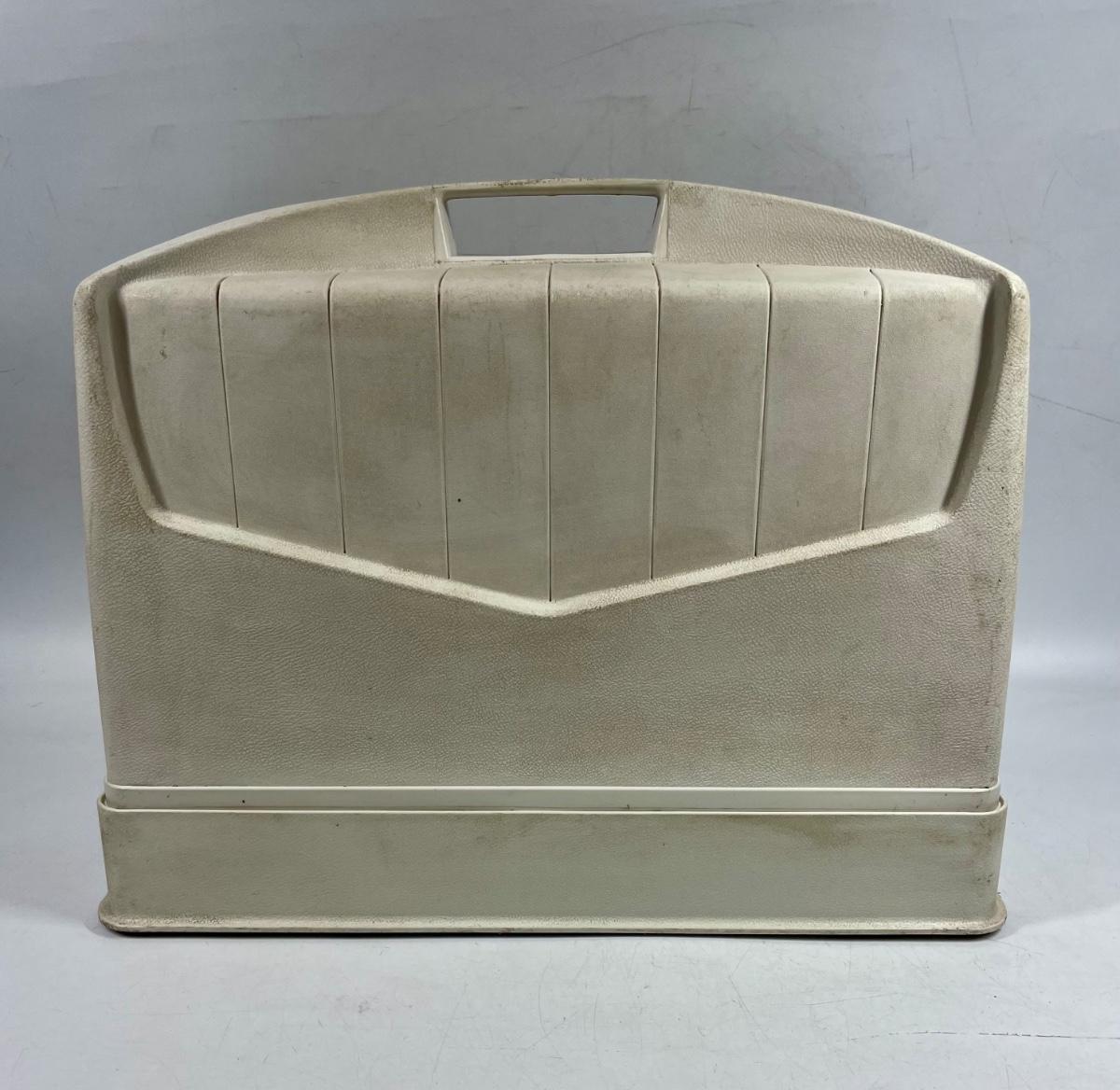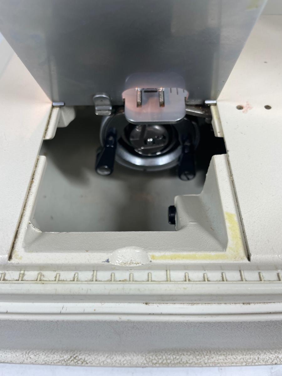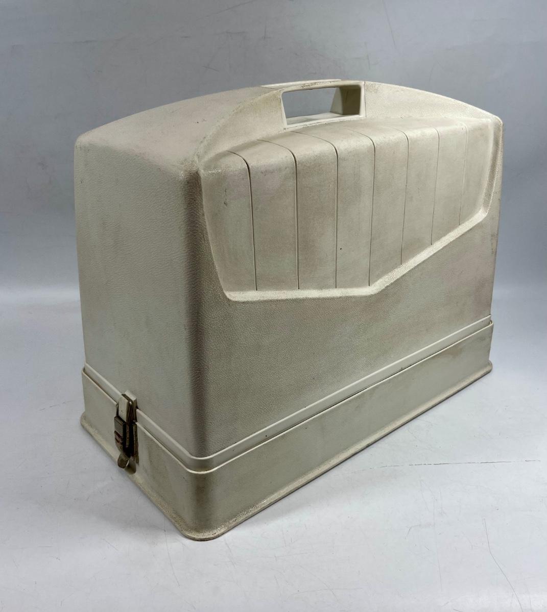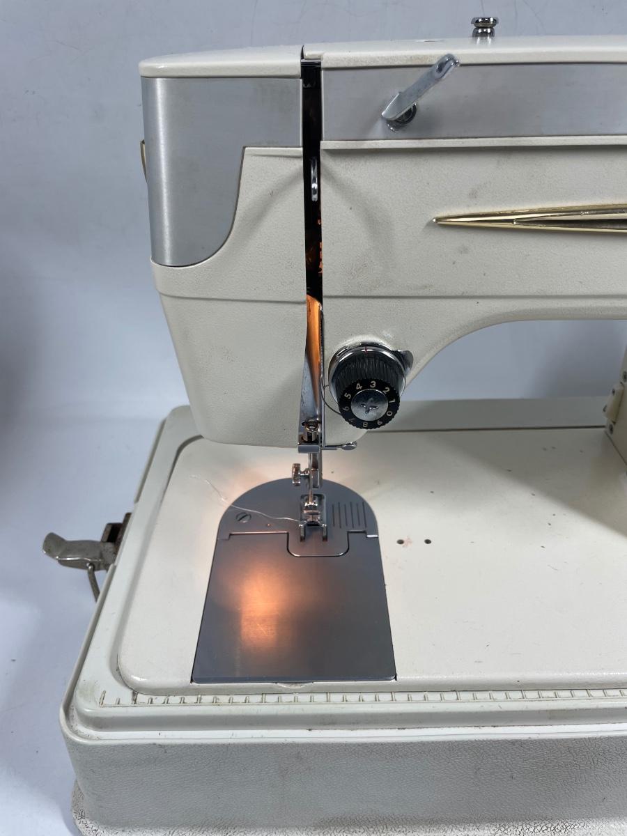 Made in Japan in the mid-70's. Super Stretch model 555SU. Includes heavy plastic carry case, foot control pedal, and power cord. Tested, works as expected. Note that in the photos the work light at the head of the machine is on.