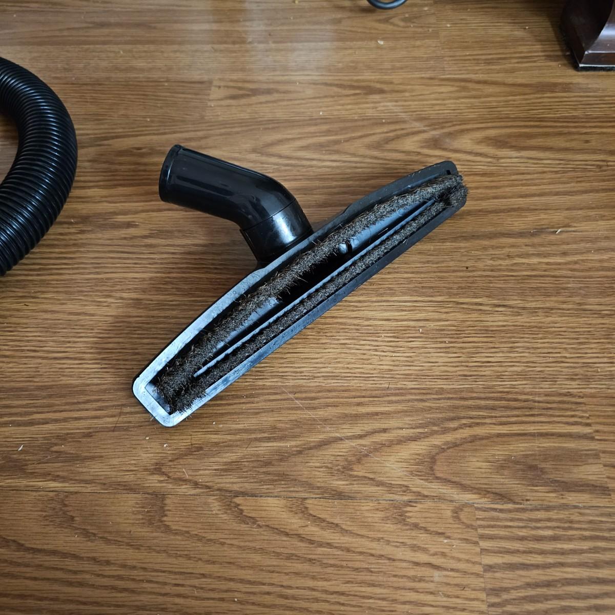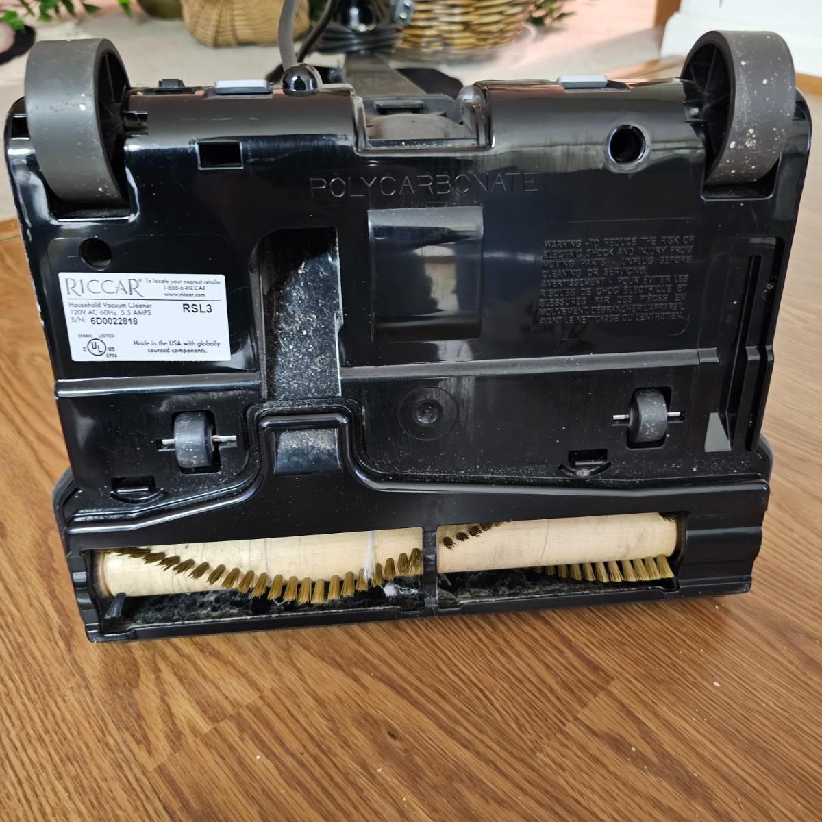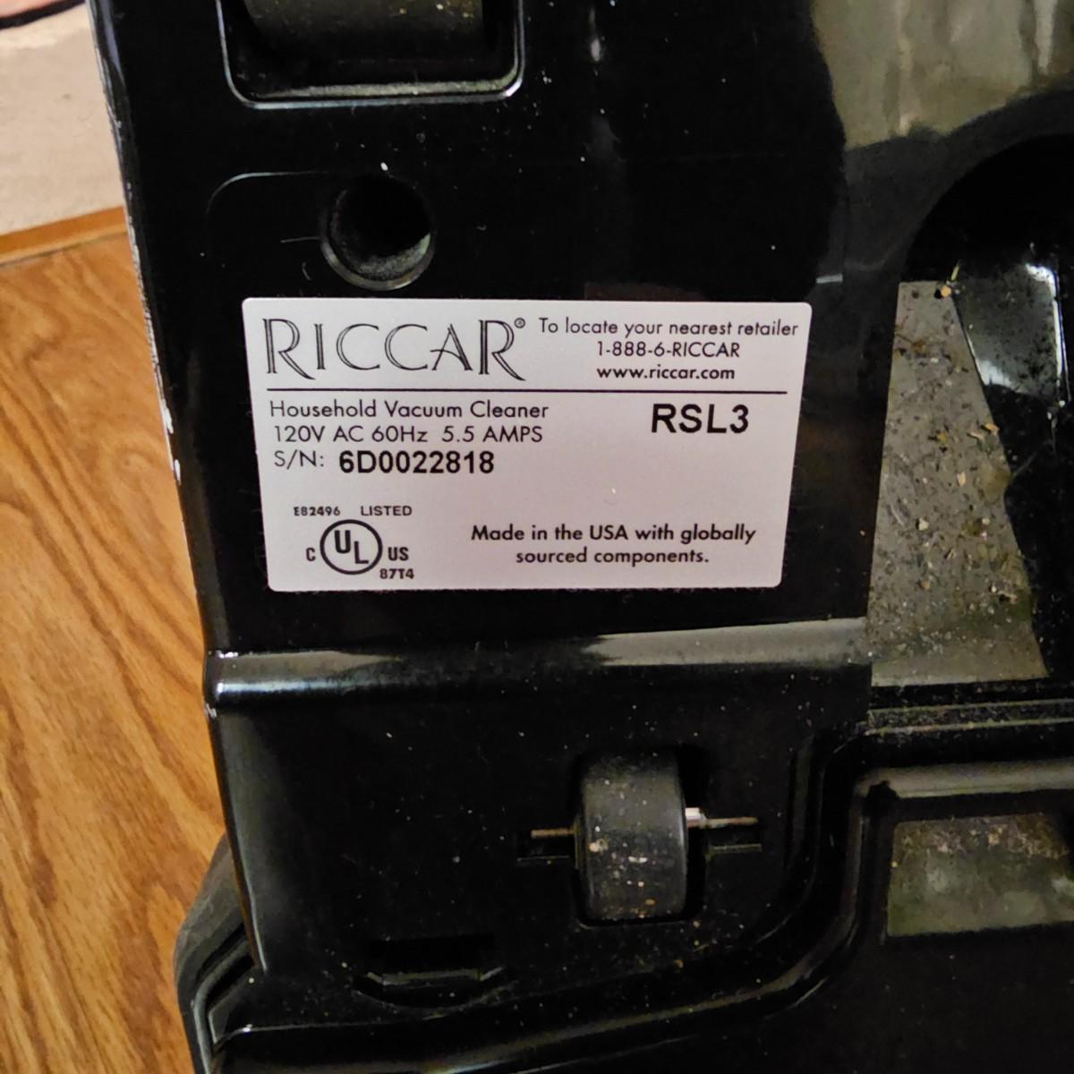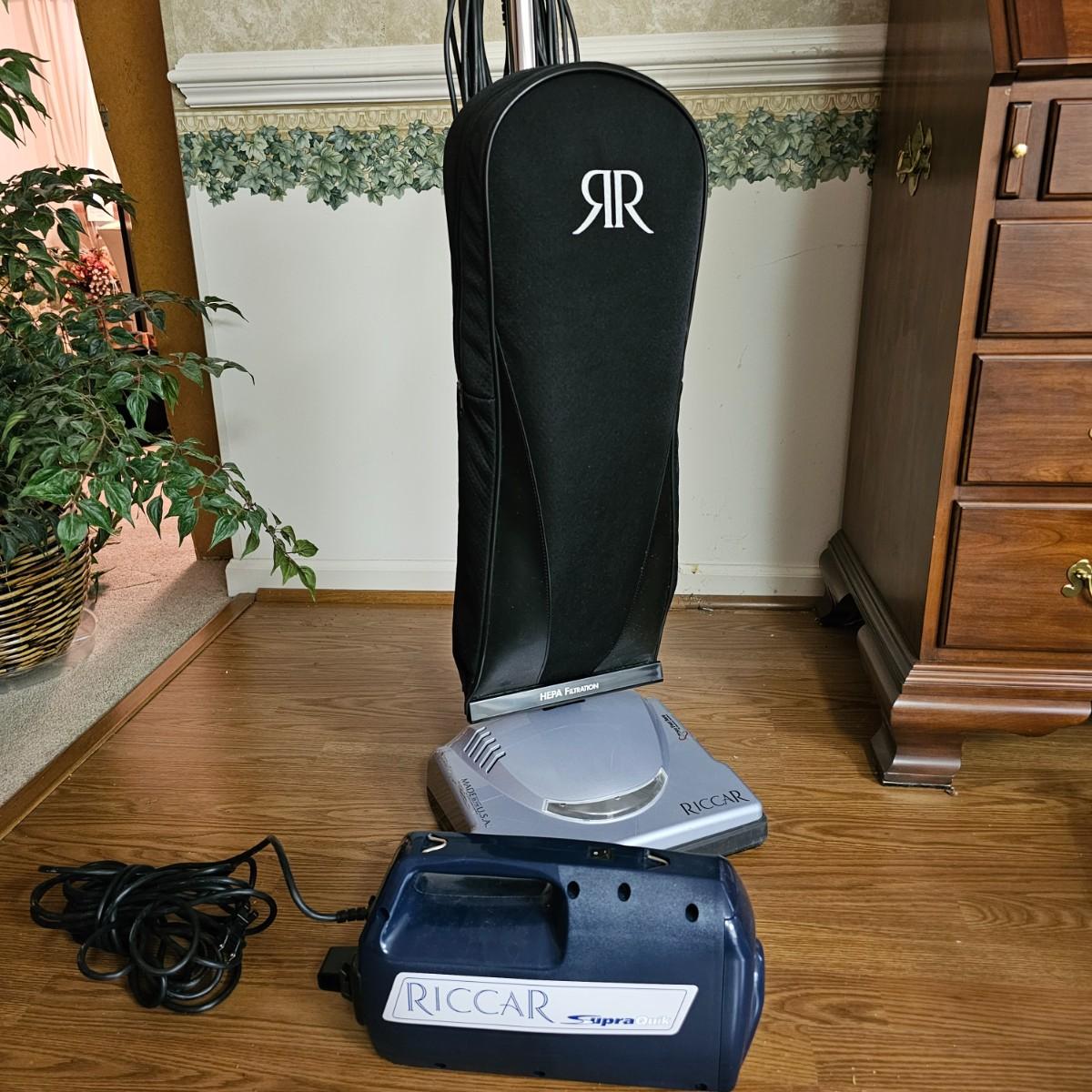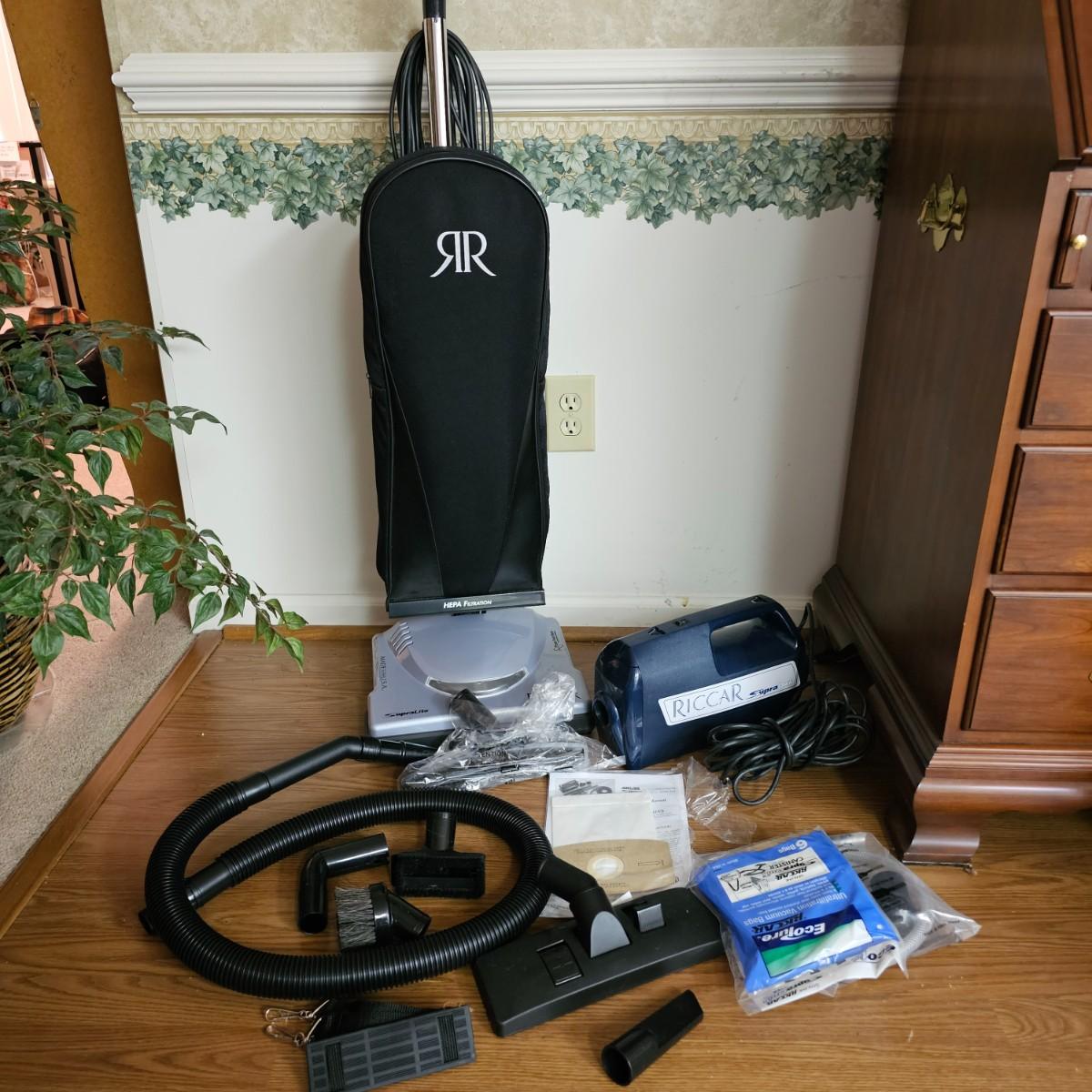 One upright and one portable Riccar vacuum cleaners plus accessories. Both units powered on when plugged in. Includes 5' hose, several attachment brushes and nozzles, bags, etc. See photos for details. Local pickup only.