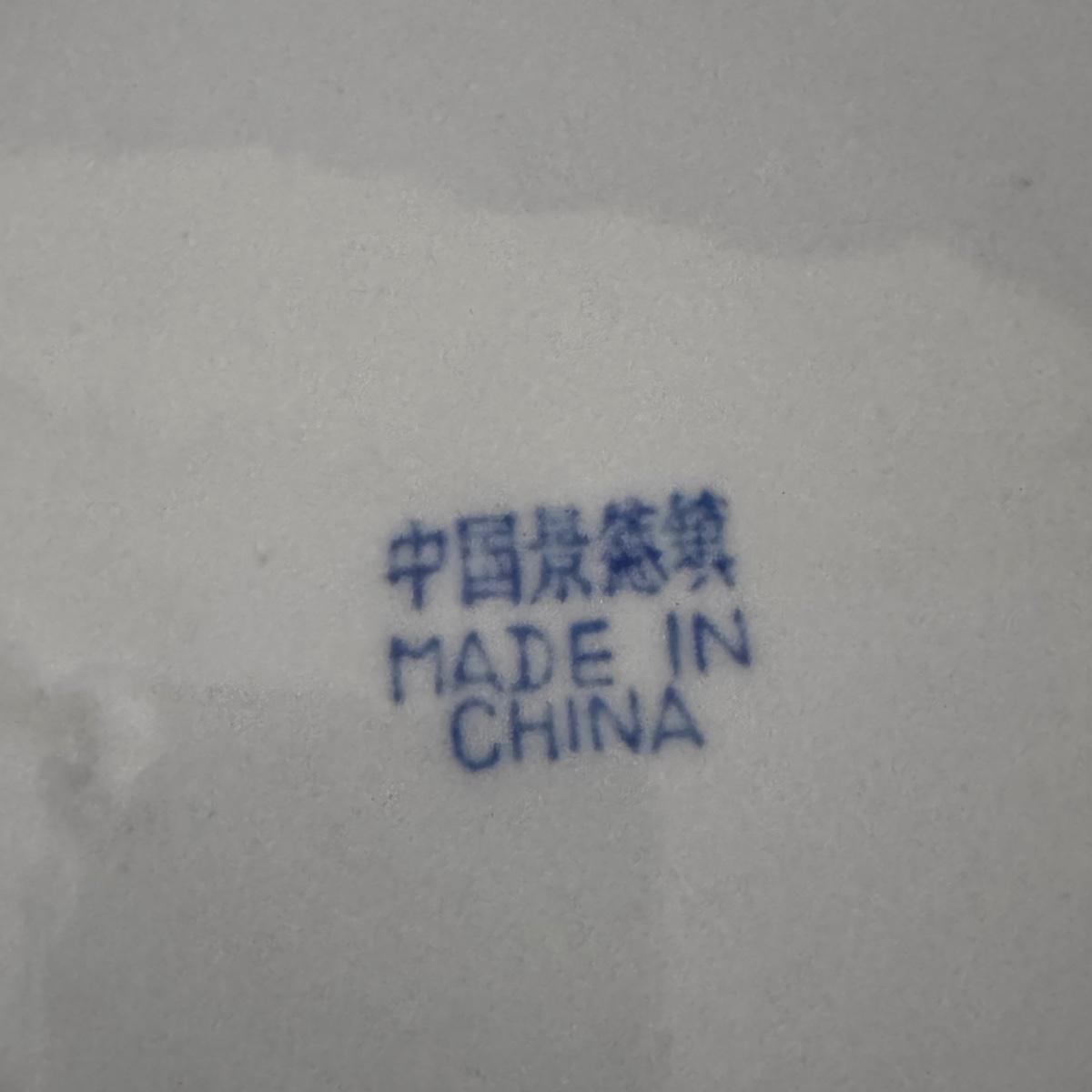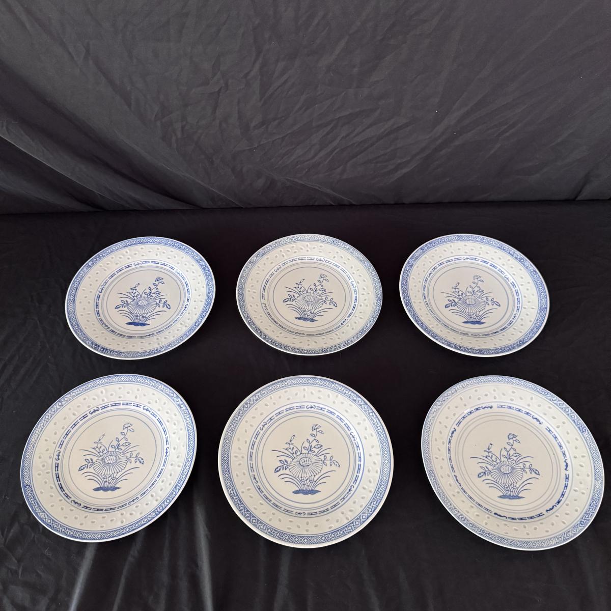 Lot includes six blue and white plates with a rice eye pattern around the edge and what appears to be a chrysanthemum in the center. Each plate is made of ceramic and has a blue flower on the front. They individually measure 9”D. Shipping available.