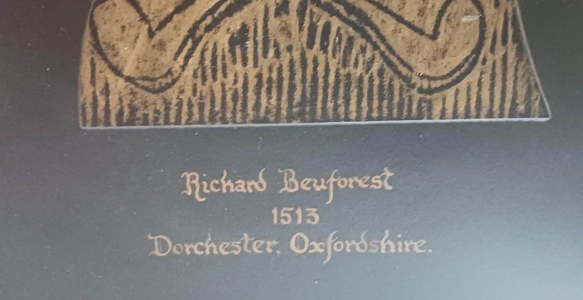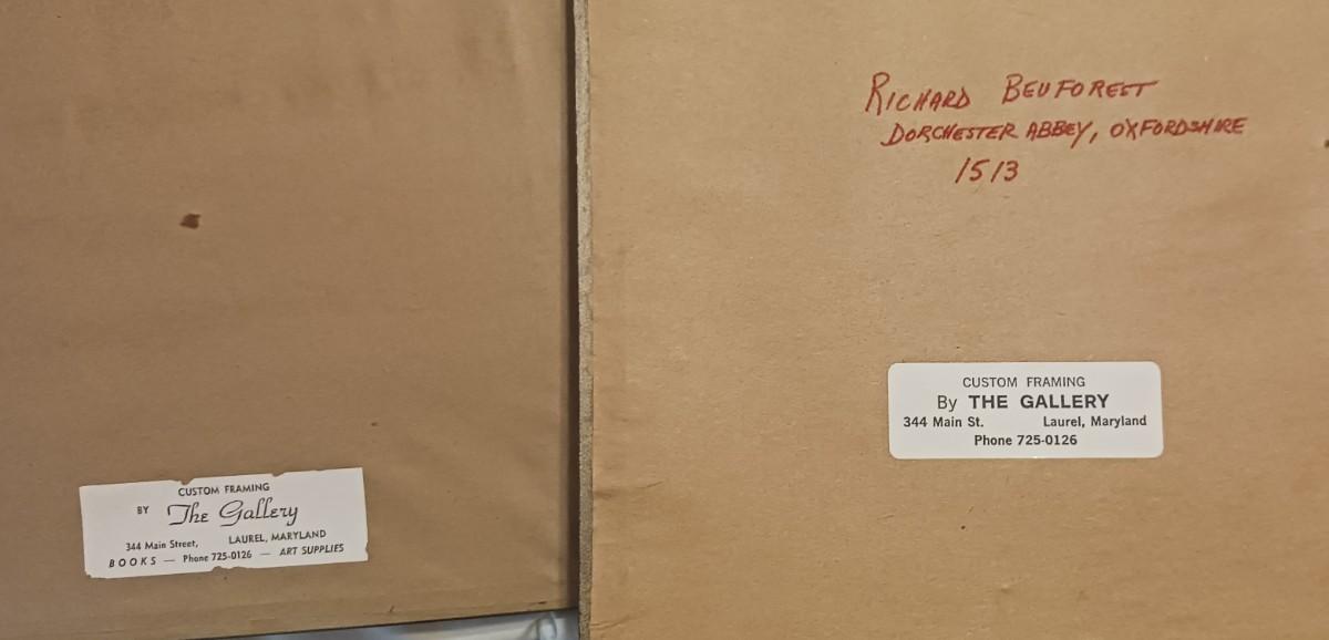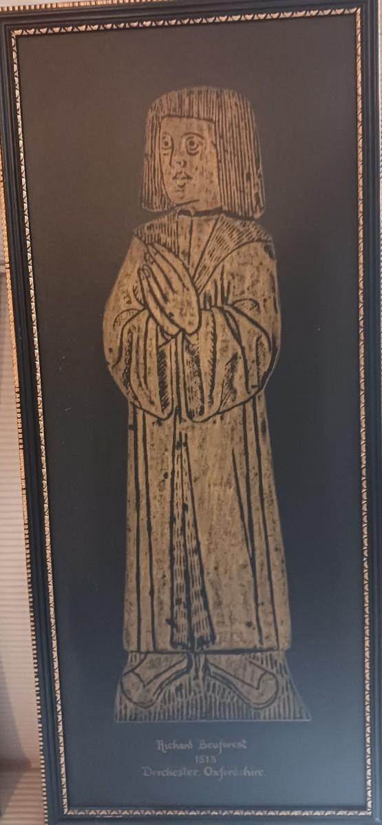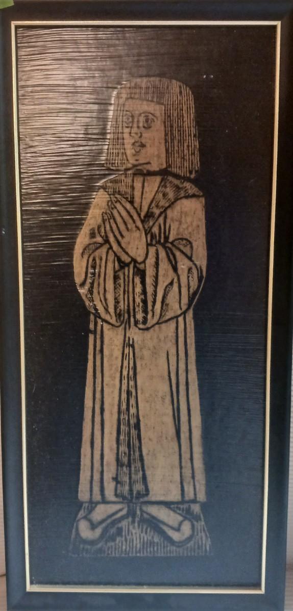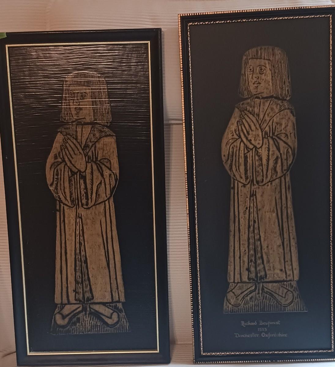 Set of two Richard Beuforest Dorchester Abbey, Oxfordshore 1513 Vintage English brass rubbings. Framed (8" wide 19 3/4 hgth) no glass