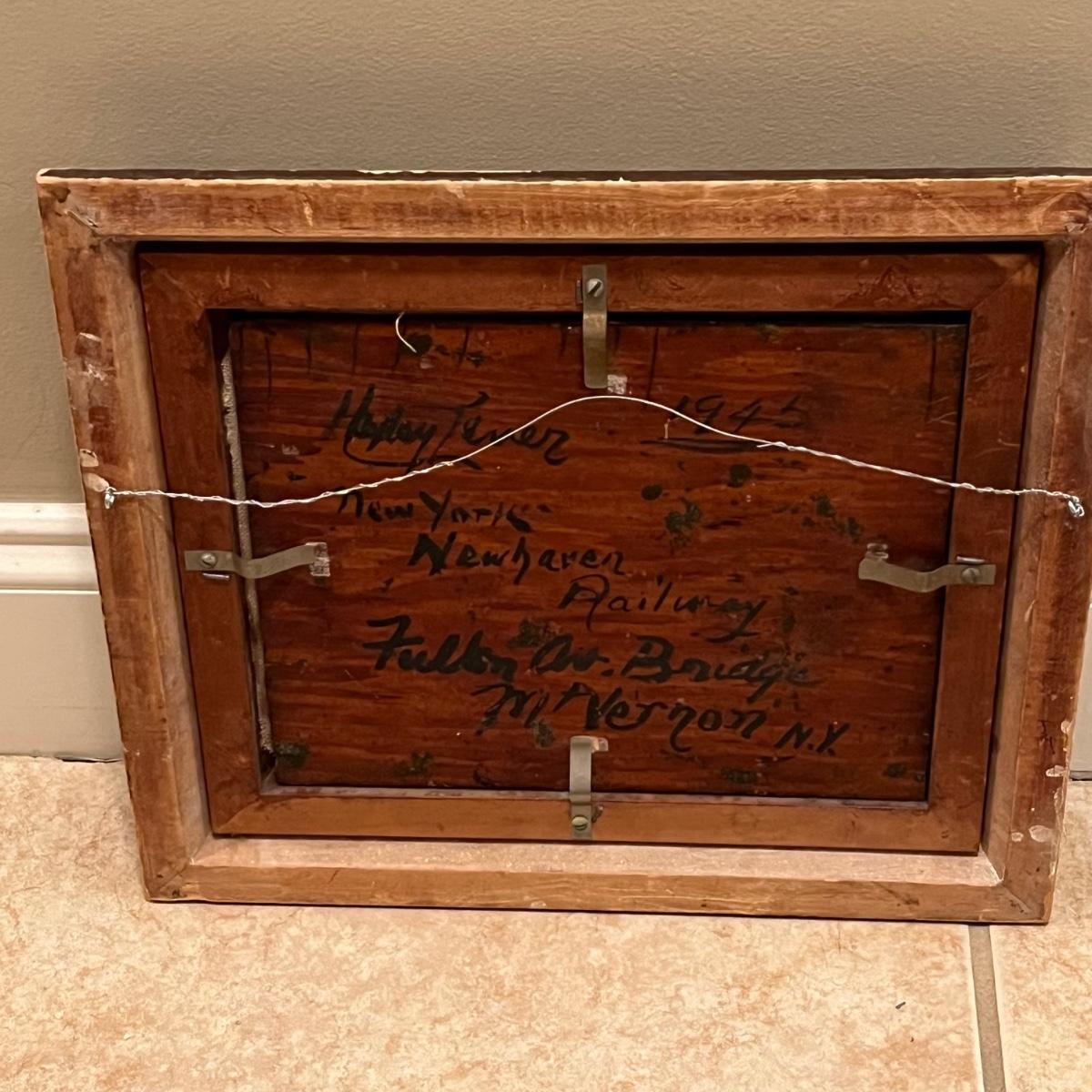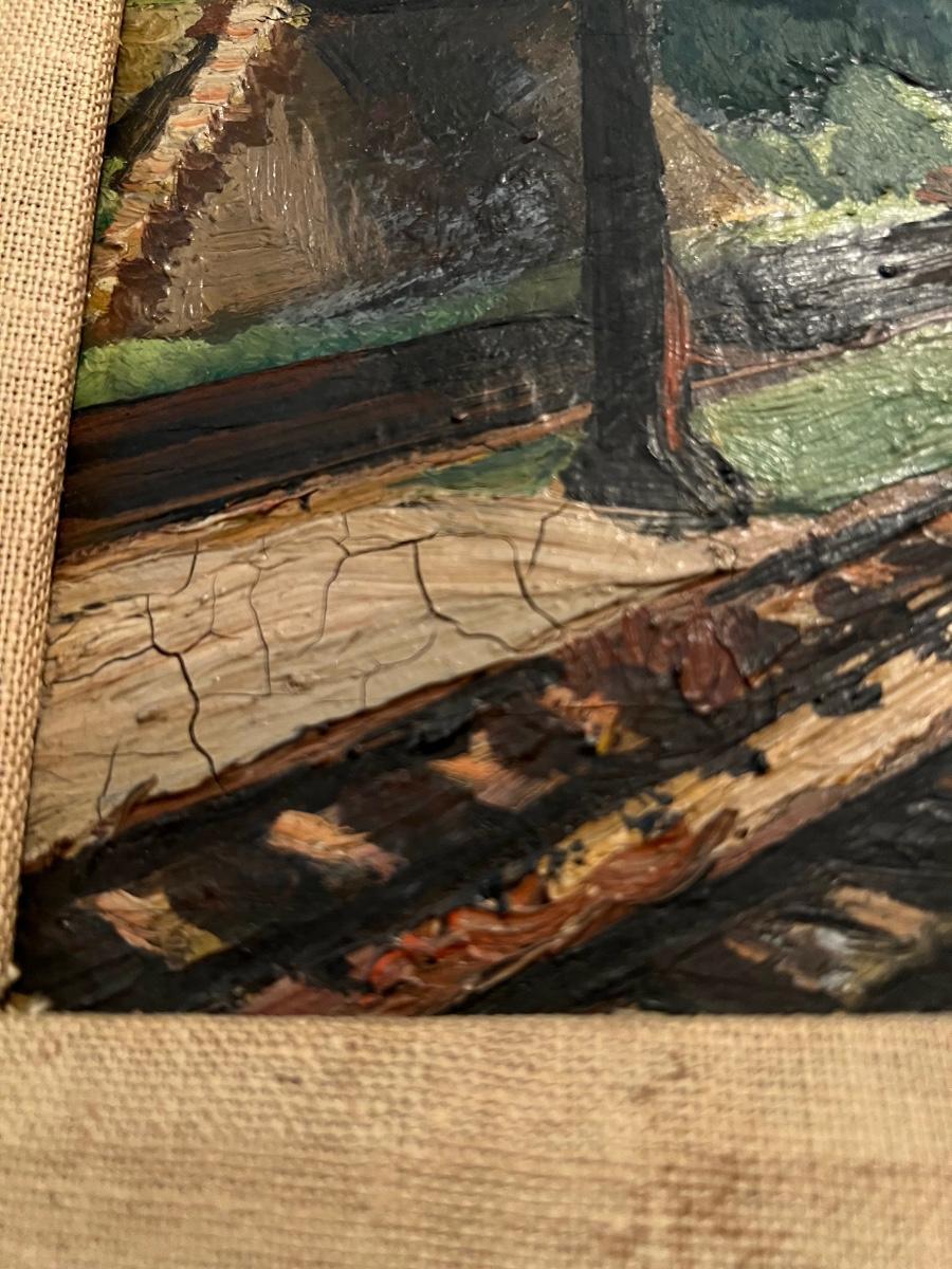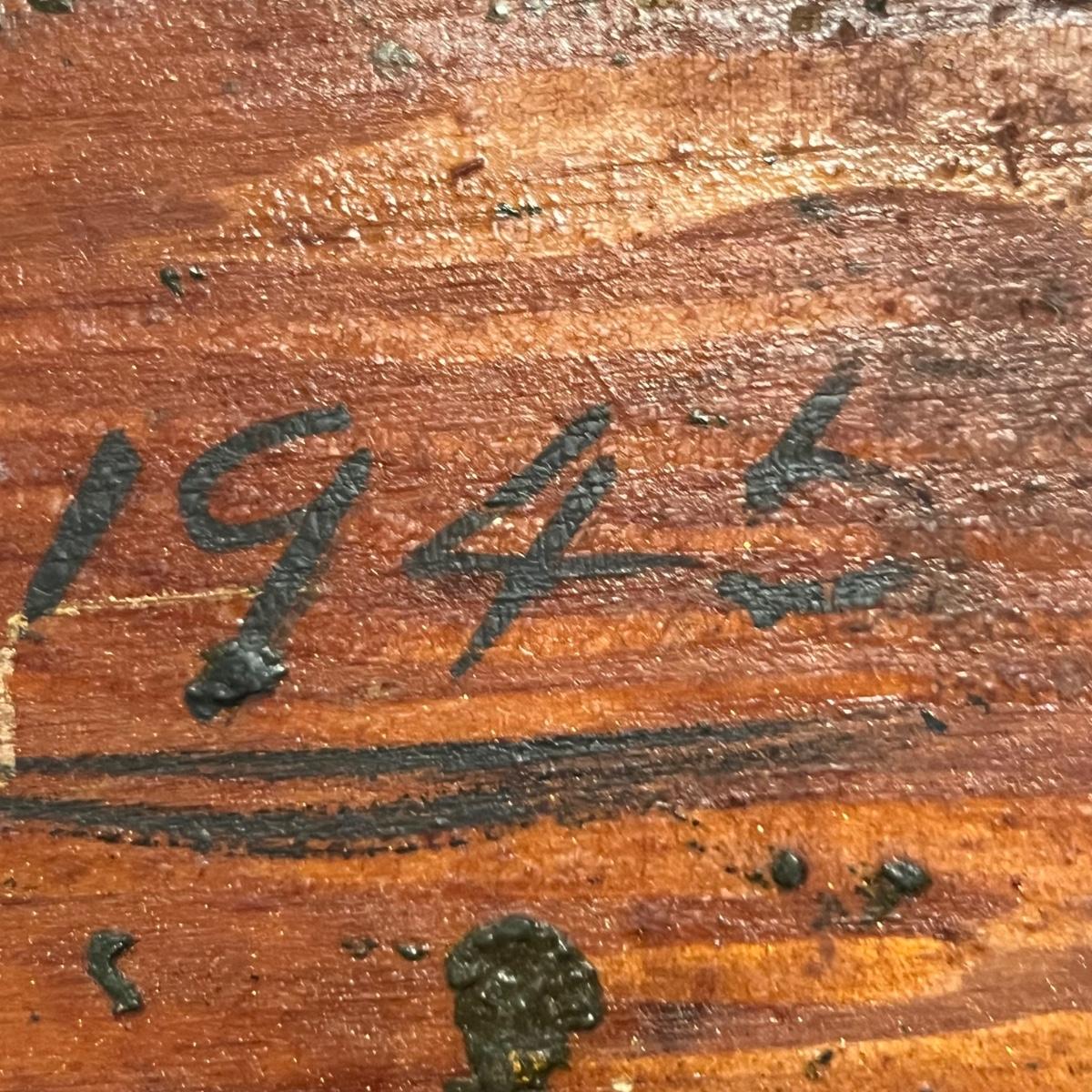 This small oil painting appears to be original and is signed. More information on the back that includes a date of 1945, see photos. Mounted (not under glass) in a wooden frame. Please note frame has some wear and tear and painting has some cracks.