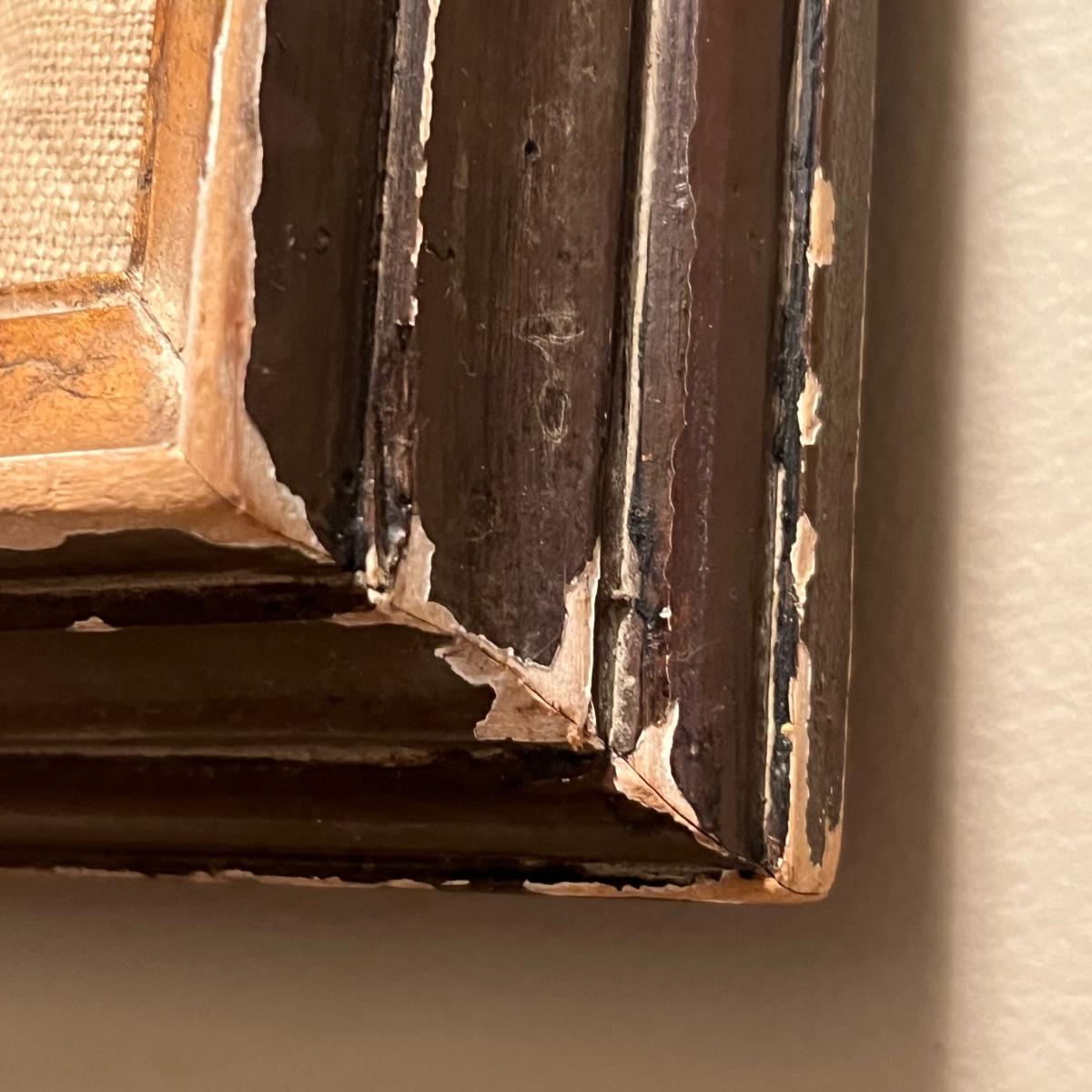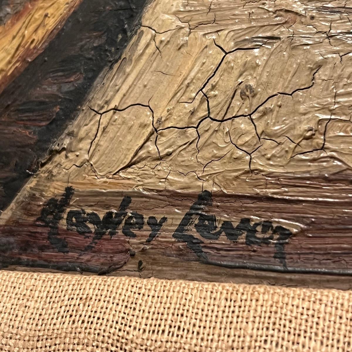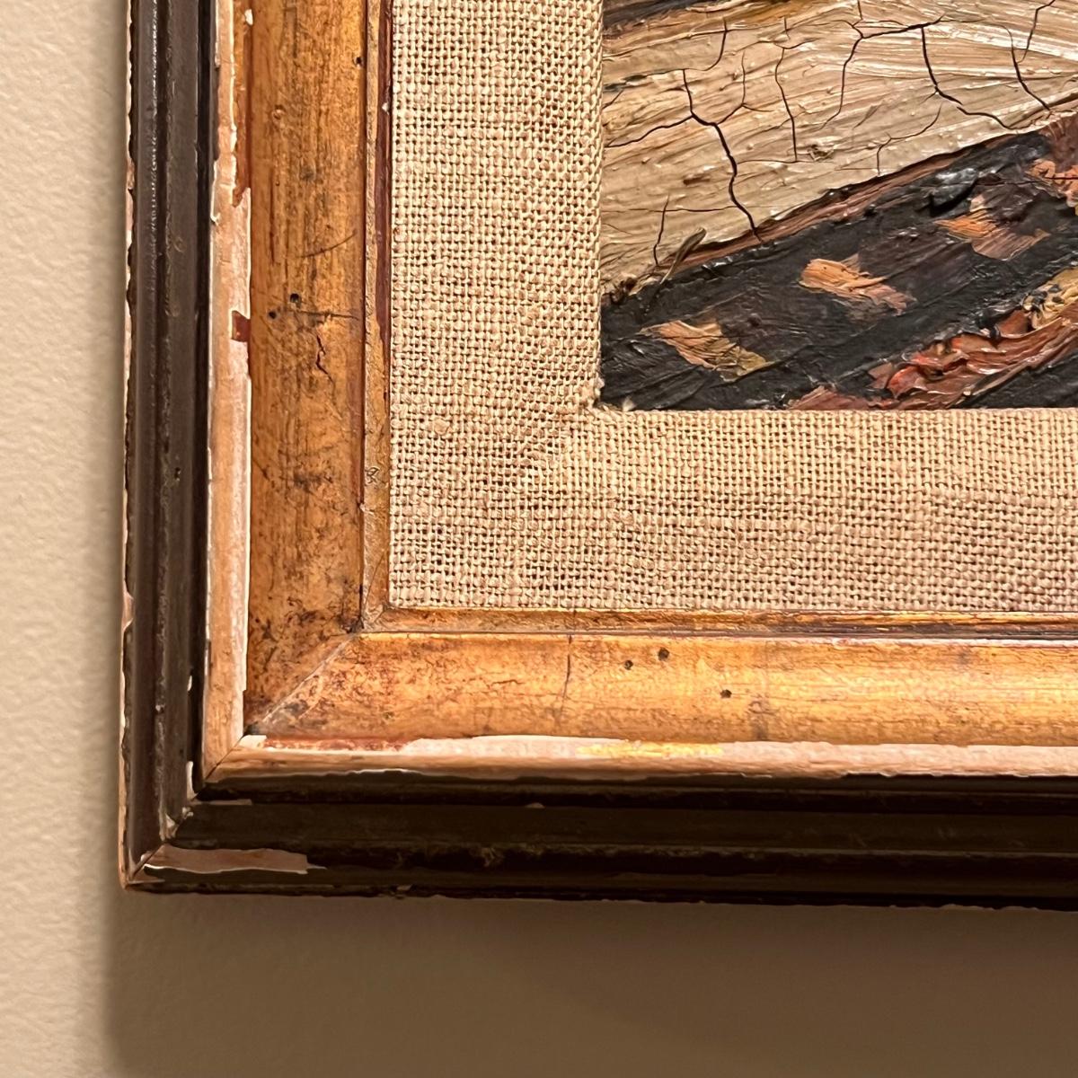 This small oil painting appears to be original and is signed. More information on the back that includes a date of 1945, see photos. Mounted (not under glass) in a wooden frame. Please note frame has some wear and tear and painting has some cracks.