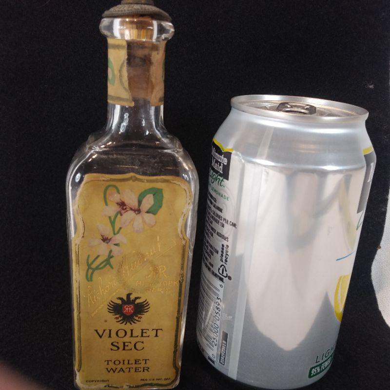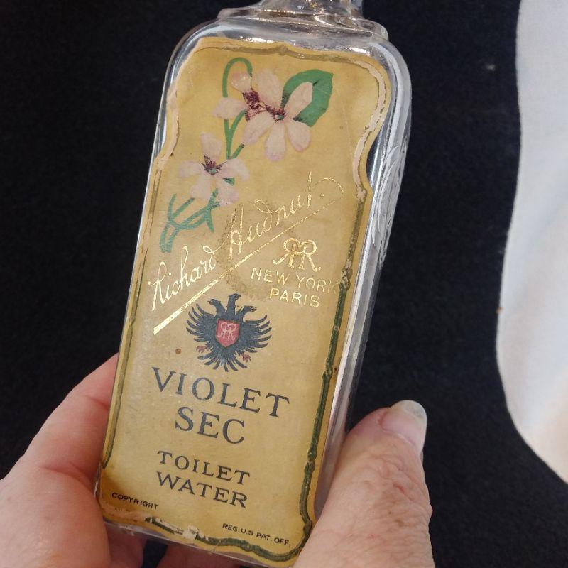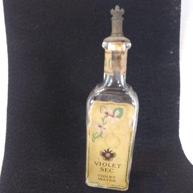 This offering is for a Victorian Era Richard Hudmet Violet Sec Toilet Water Bottle with the original cap and cork. Label is in good condition for it's age. The bottle is embossed and made in 1896. This is a very nice old bottle and would look stunning on your shelf or dresser. It is 7-inches tall. Reserve/Starting Bid is $20.