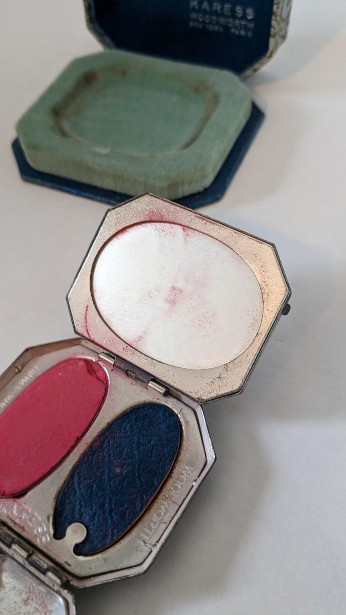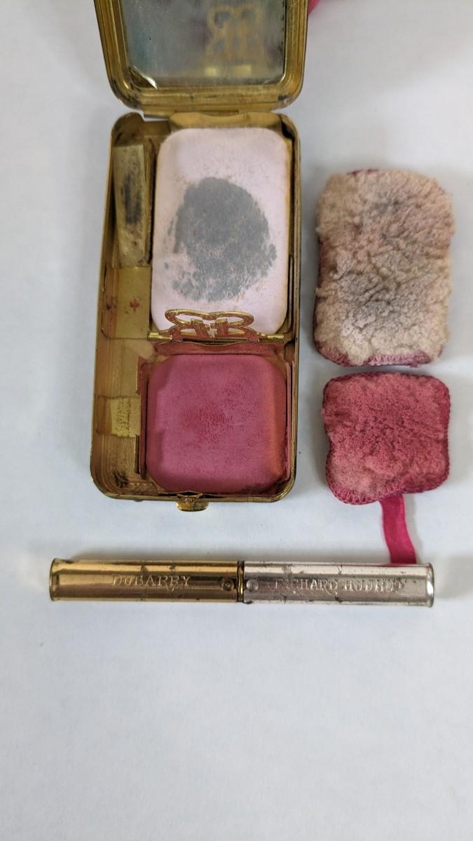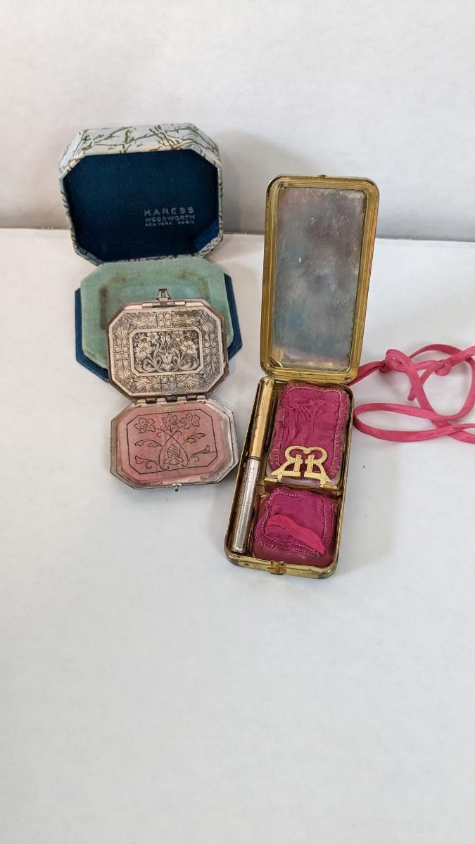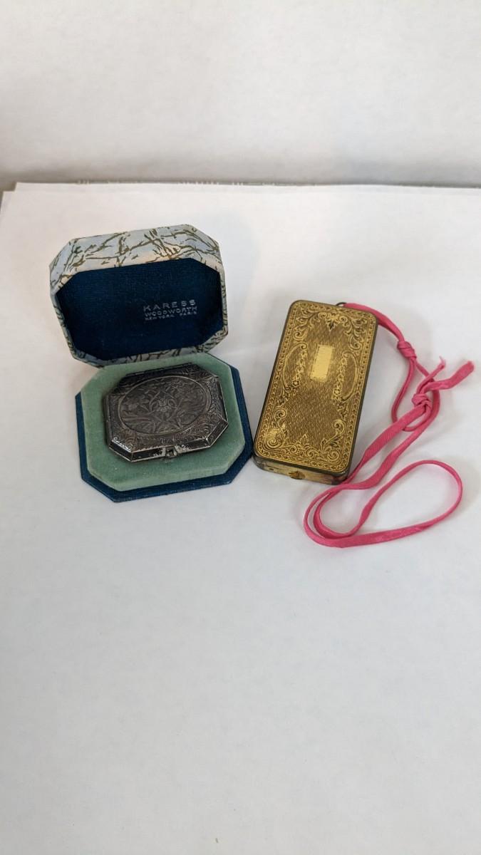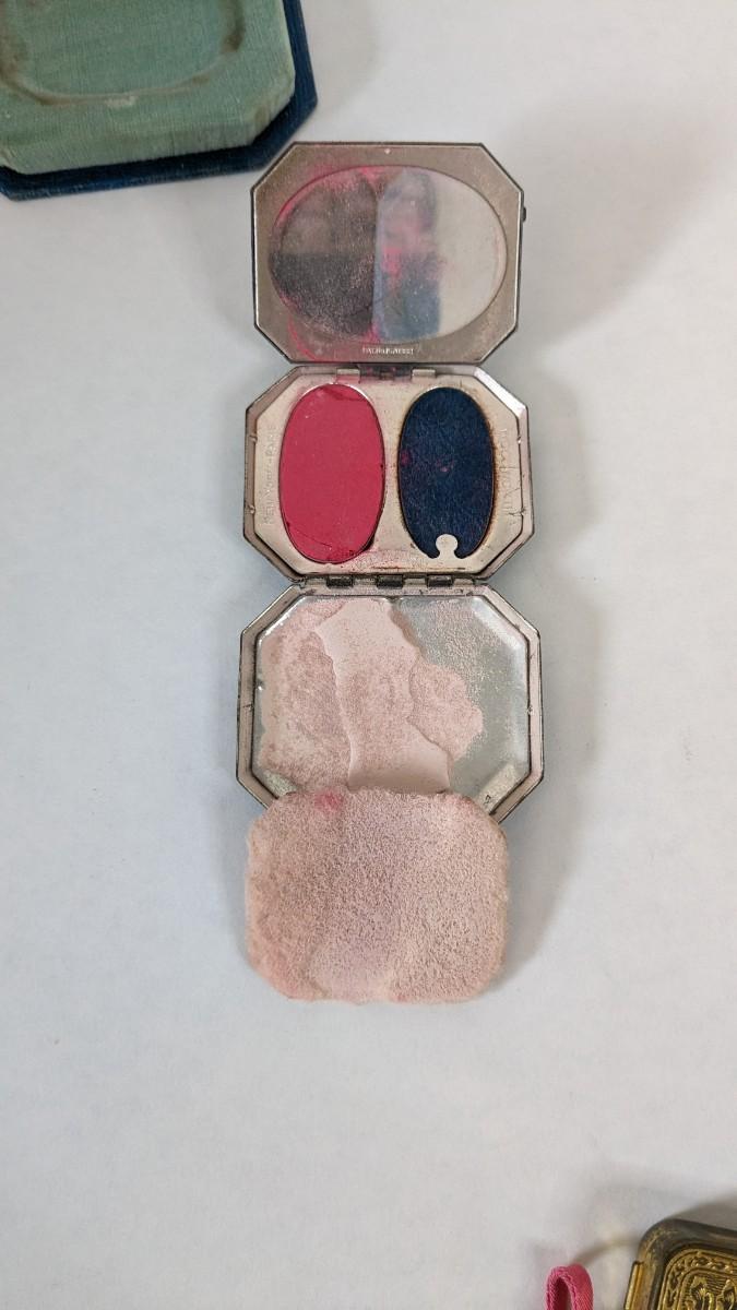(2) partially full very early women's carrying compacts. Both exteriors show patina but are in great condition with each containing 50-70% of original product.