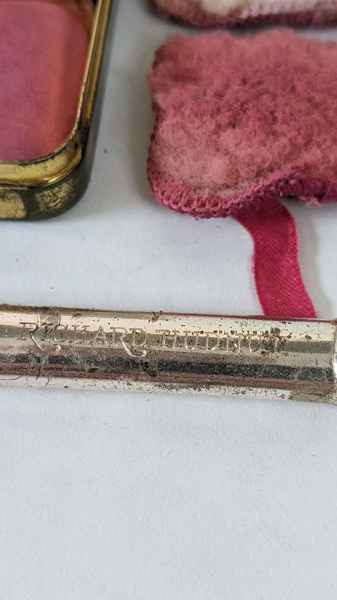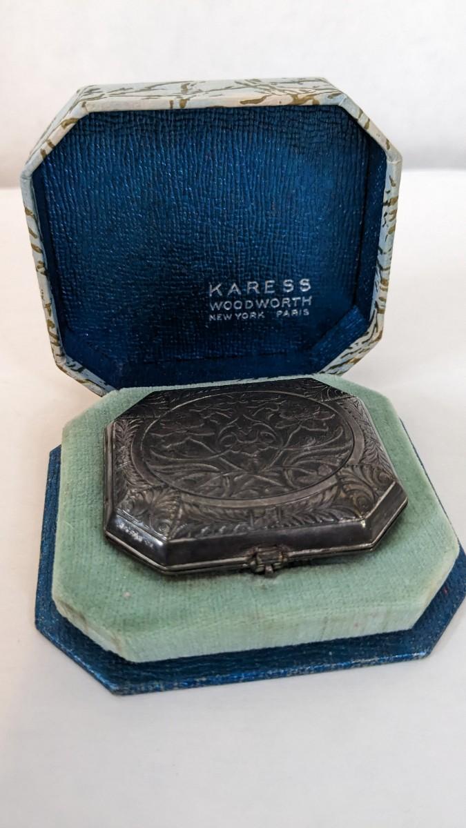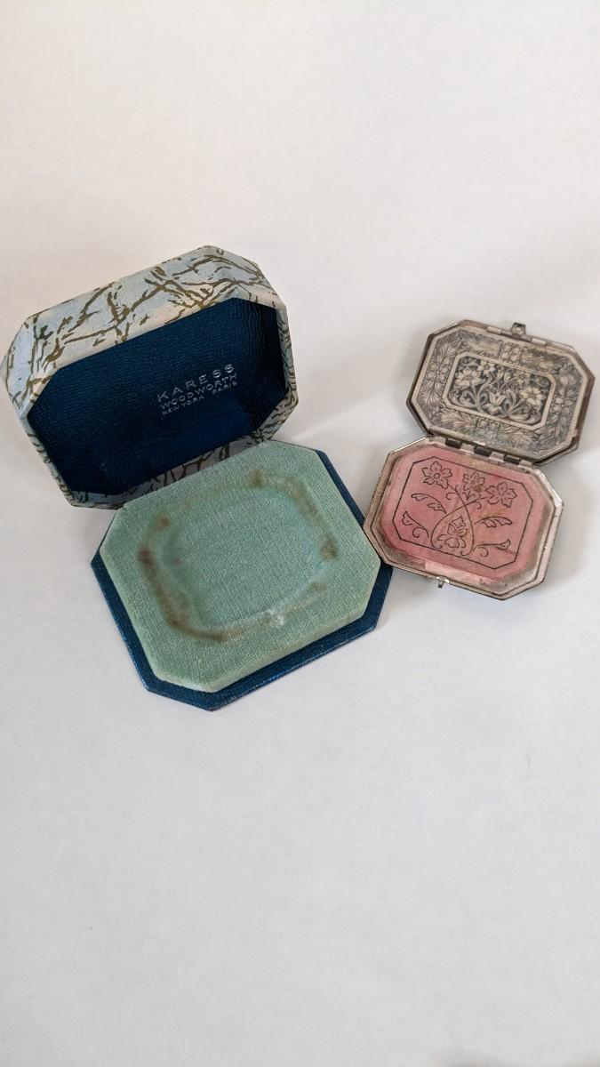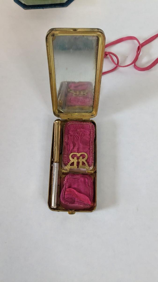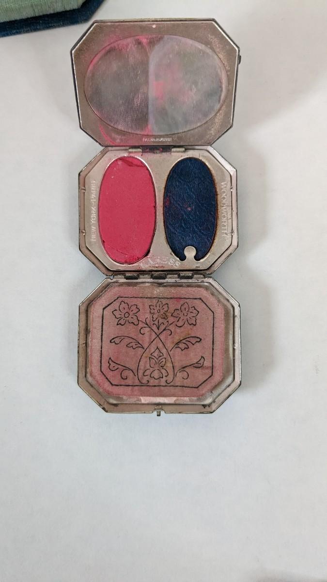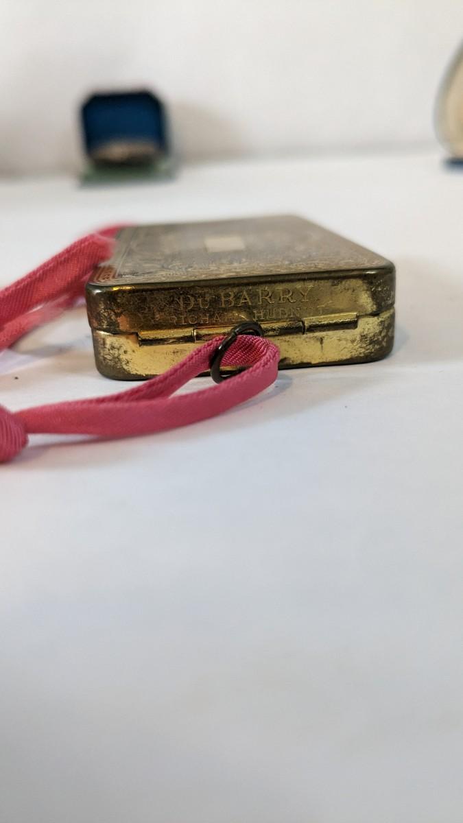 (2) partially full very early women's carrying compacts. Both exteriors show patina but are in great condition with each containing 50-70% of original product.