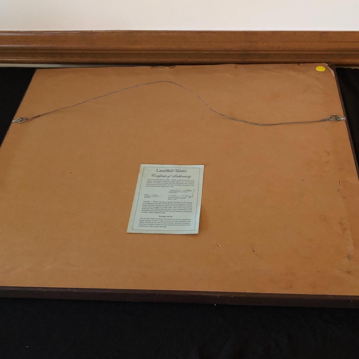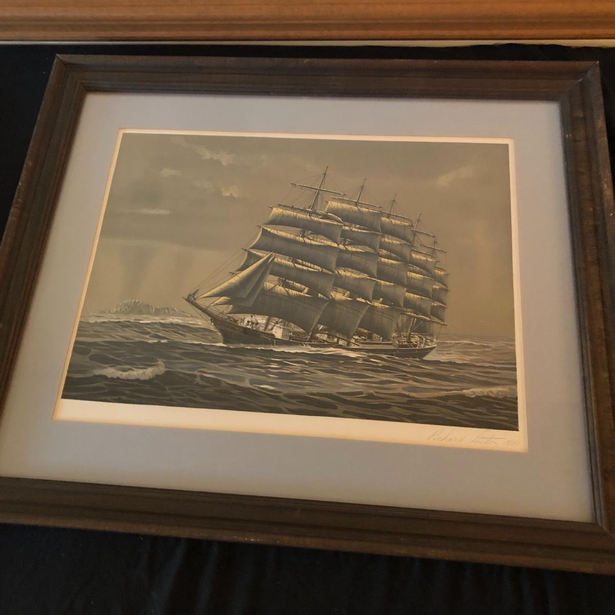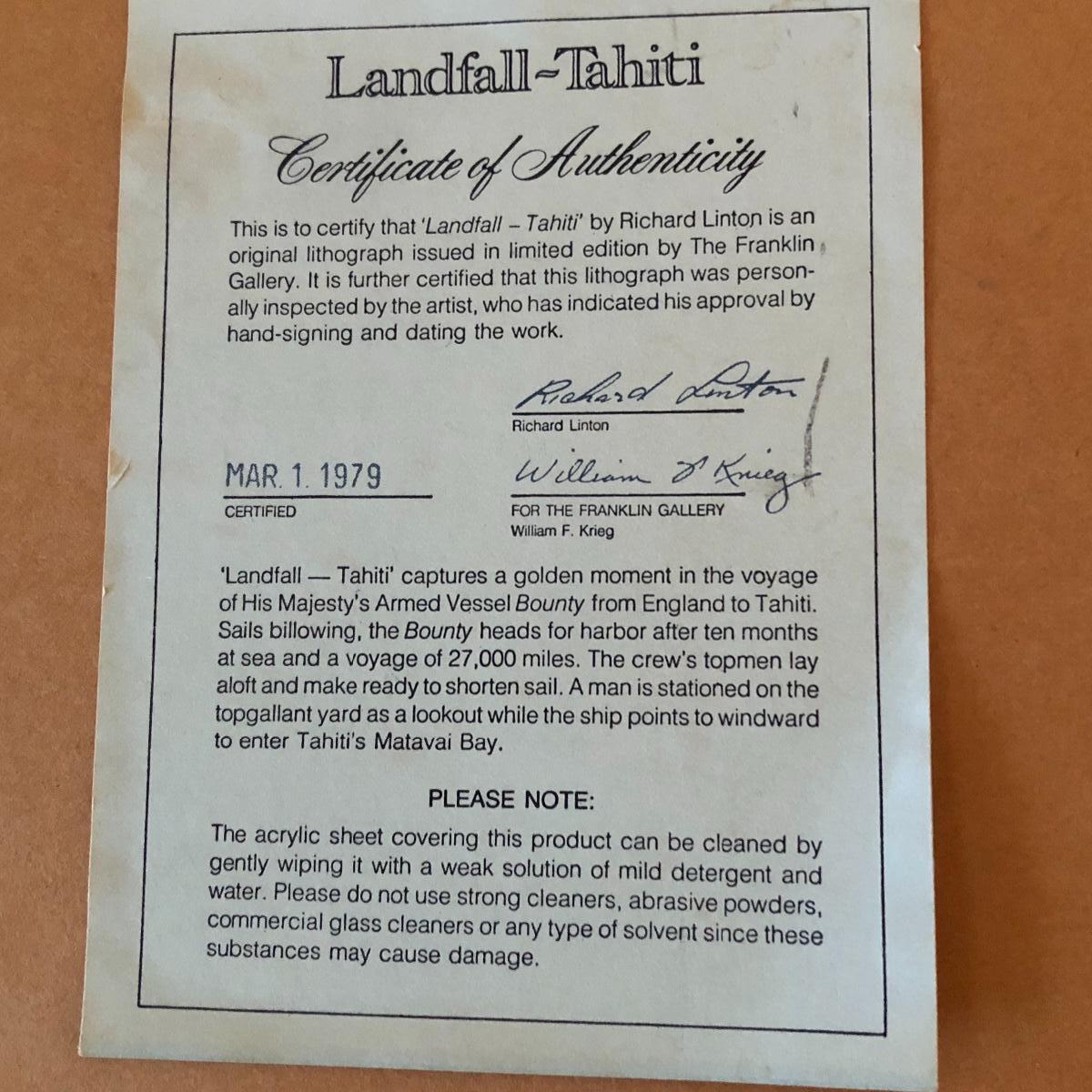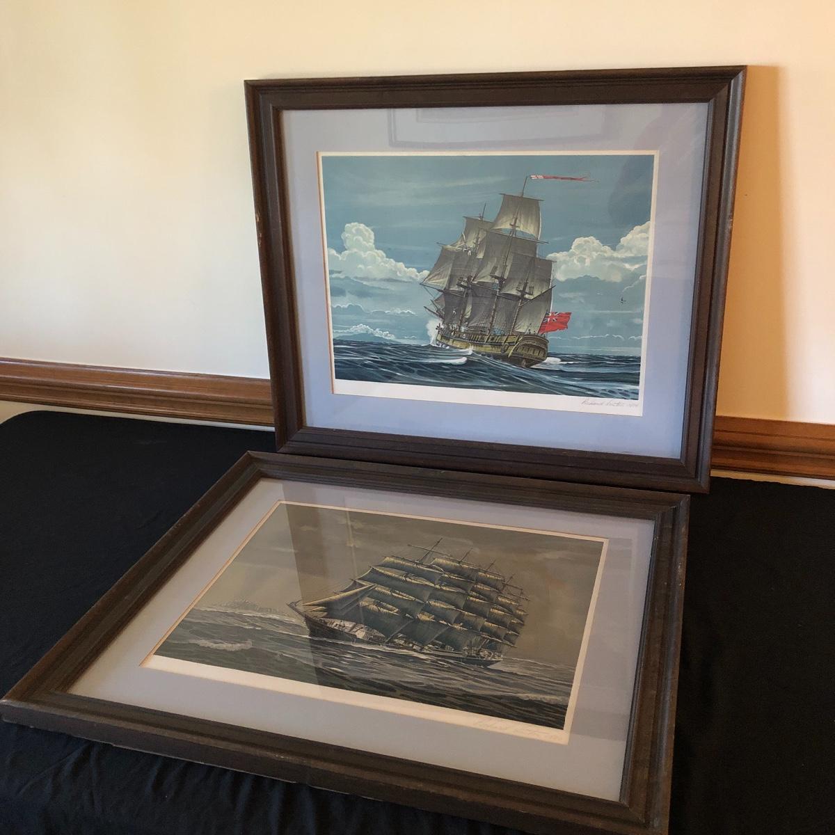 These two pieces of art are authenticated as Richard Linton lithographs: one, “Landfall-Tahiti” and “Rounding the Horn.” Please note the Certificate of Authenticity on the back side of each print. They both measure 26”. X 22.” Shipping available, please call UPS at 828-252-6930 with dimensions for a shipping quote.