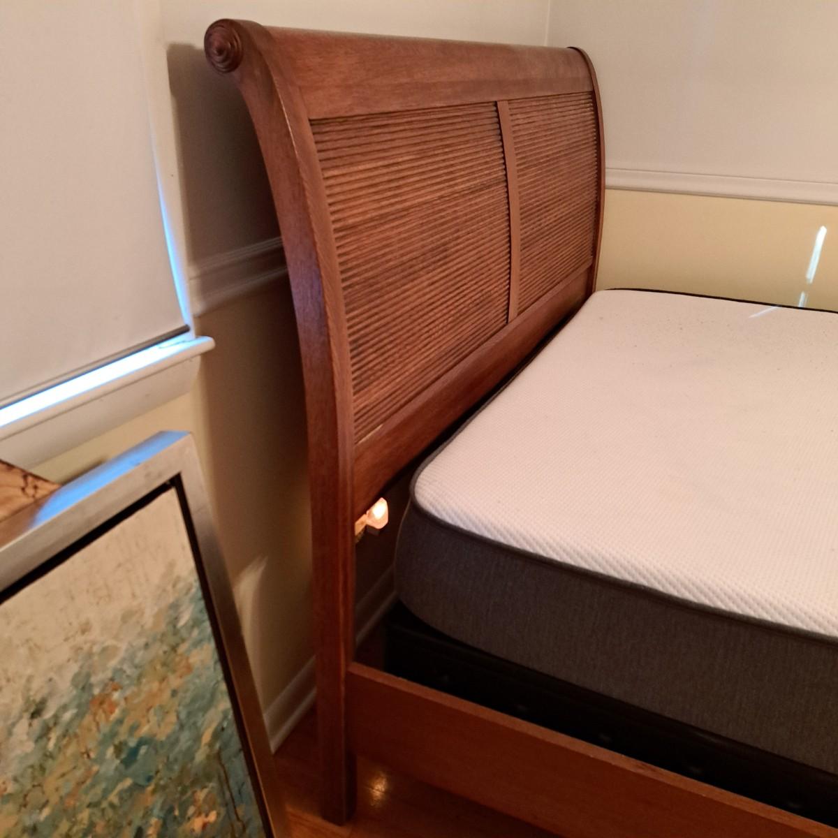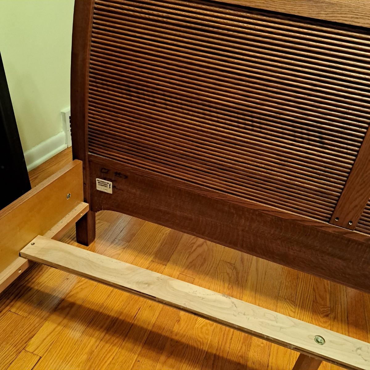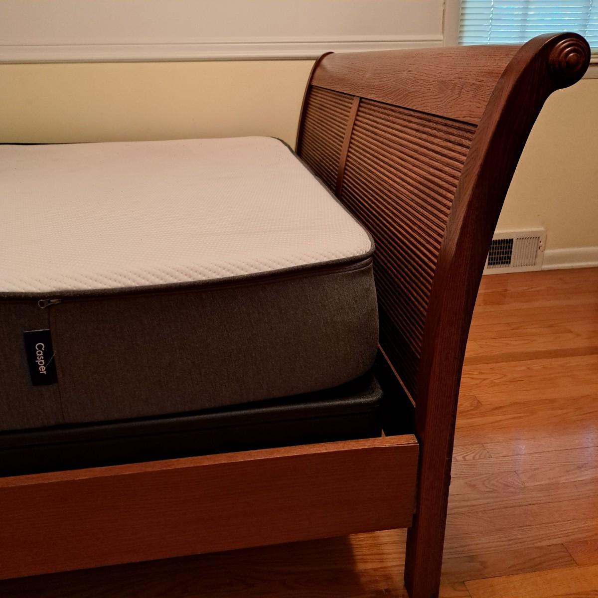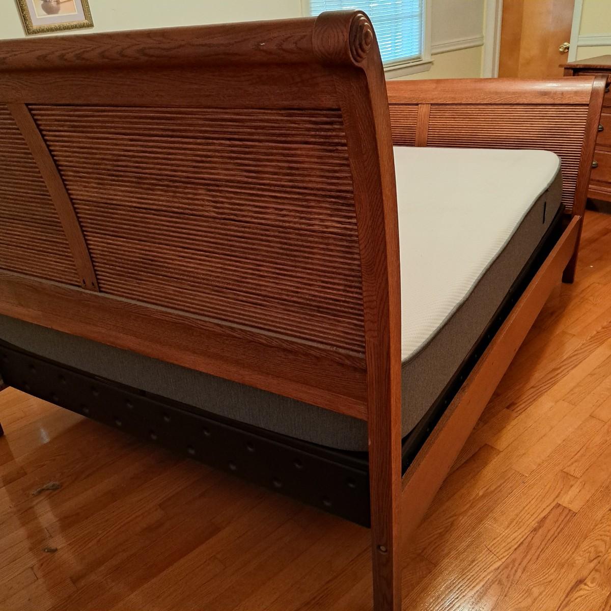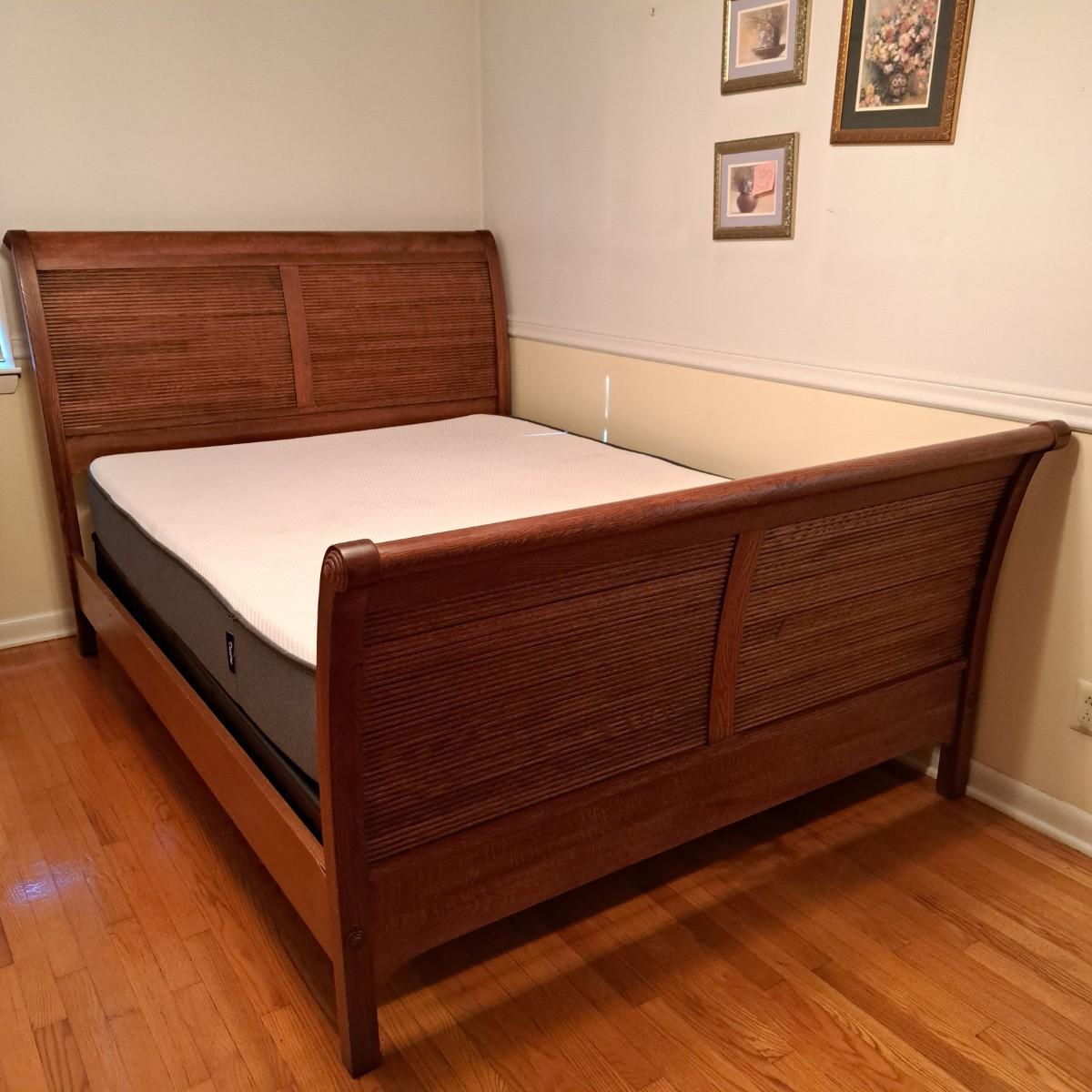 Richardson Bros. Company queen size contemporary sleigh bed frame, 86"L x 65." Bed frame appears to be made of oak wood. Top of headboard measures 52.5"H. Top of footboard measures 38.5"H. Has three removable inner slat boards with middle center legs. A small 2.5" section of oak veneer has come apart at the foot of bed frame as shown. Bed has a plastic Sleep Number platform base. Casper brand memory foam mattress is available to the winning bidder if desired, but winning bidder is not required to take it. There appears to be some faint surface stains to mattress as shown, but its integrity does not appear to be compromised. Zip cover can be removed and washed if desired.