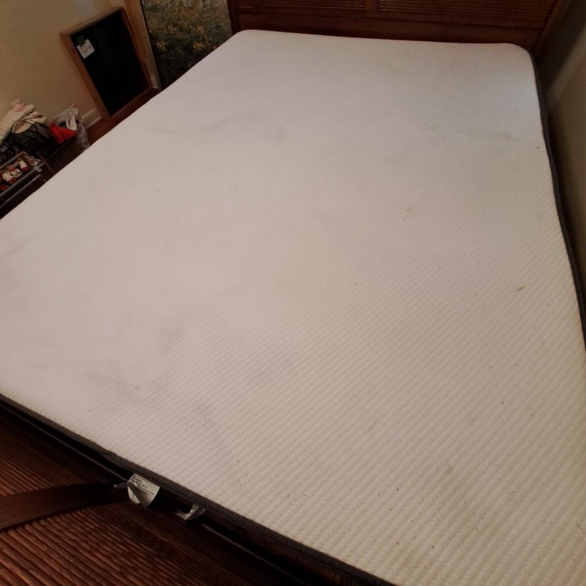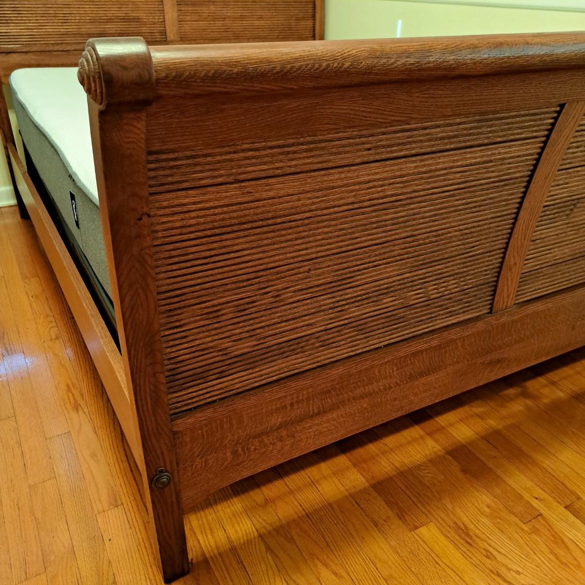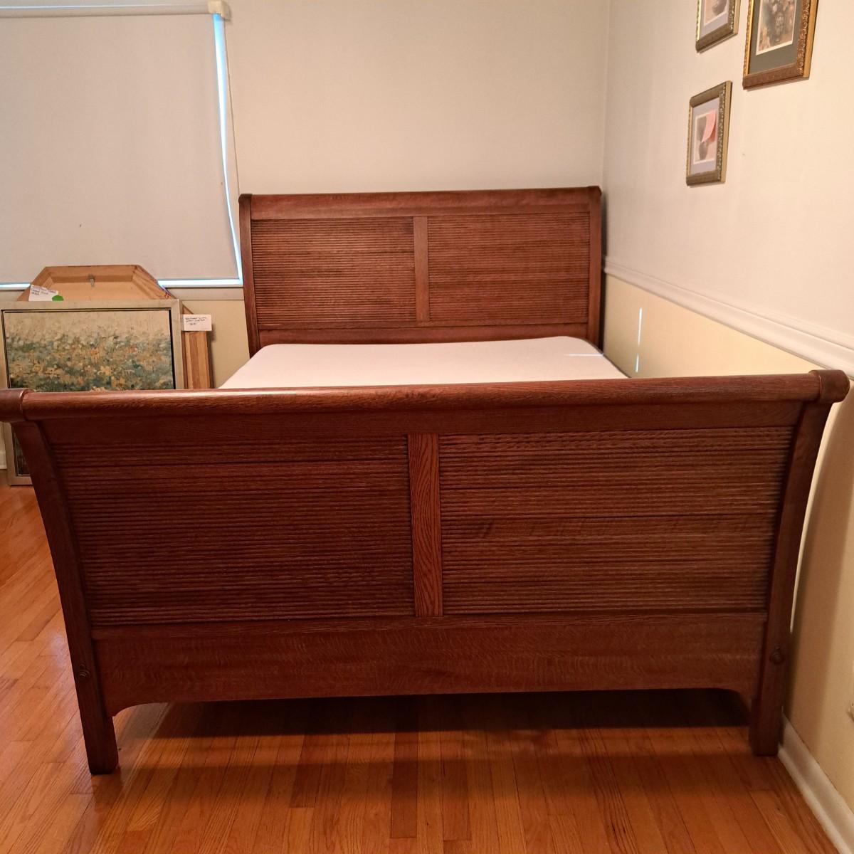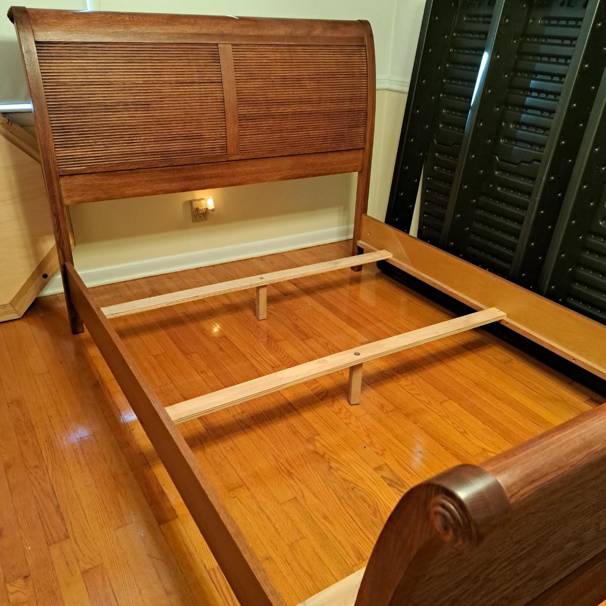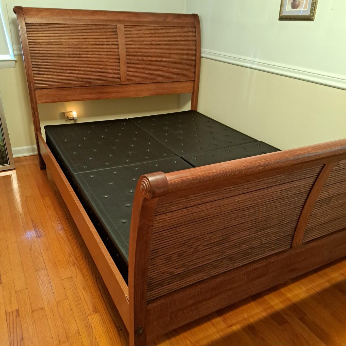 Richardson Bros. Company queen size contemporary sleigh bed frame, 86"L x 65." Bed frame appears to be made of oak wood. Top of headboard measures 52.5"H. Top of footboard measures 38.5"H. Has three removable inner slat boards with middle center legs. A small 2.5" section of oak veneer has come apart at the foot of bed frame as shown. Bed has a plastic Sleep Number platform base. Casper brand memory foam mattress is available to the winning bidder if desired, but winning bidder is not required to take it. There appears to be some faint surface stains to mattress as shown, but its integrity does not appear to be compromised. Zip cover can be removed and washed if desired.