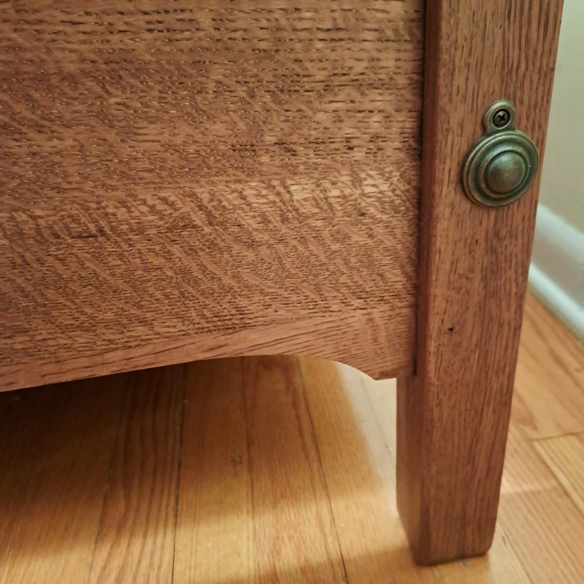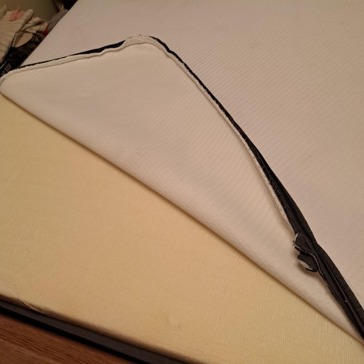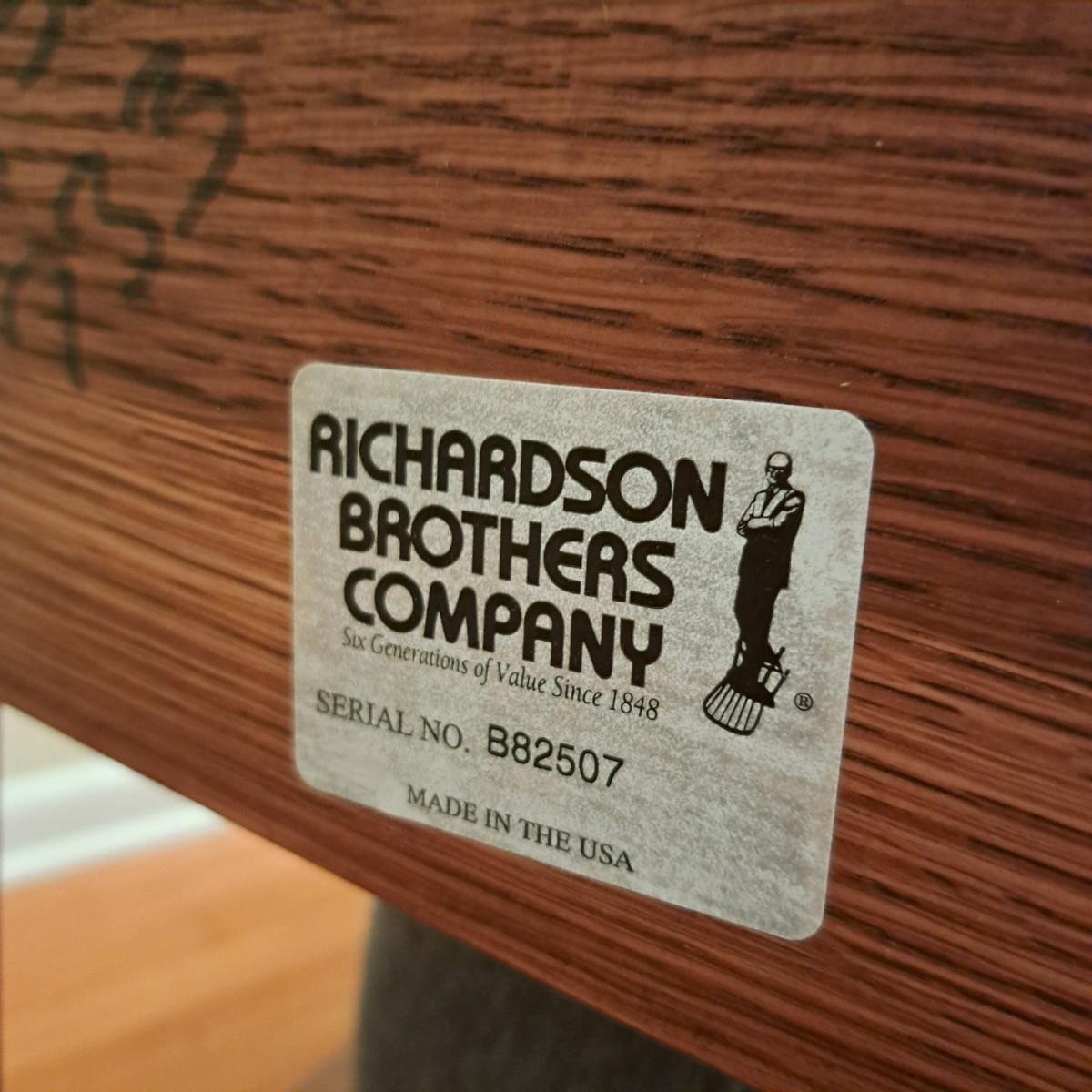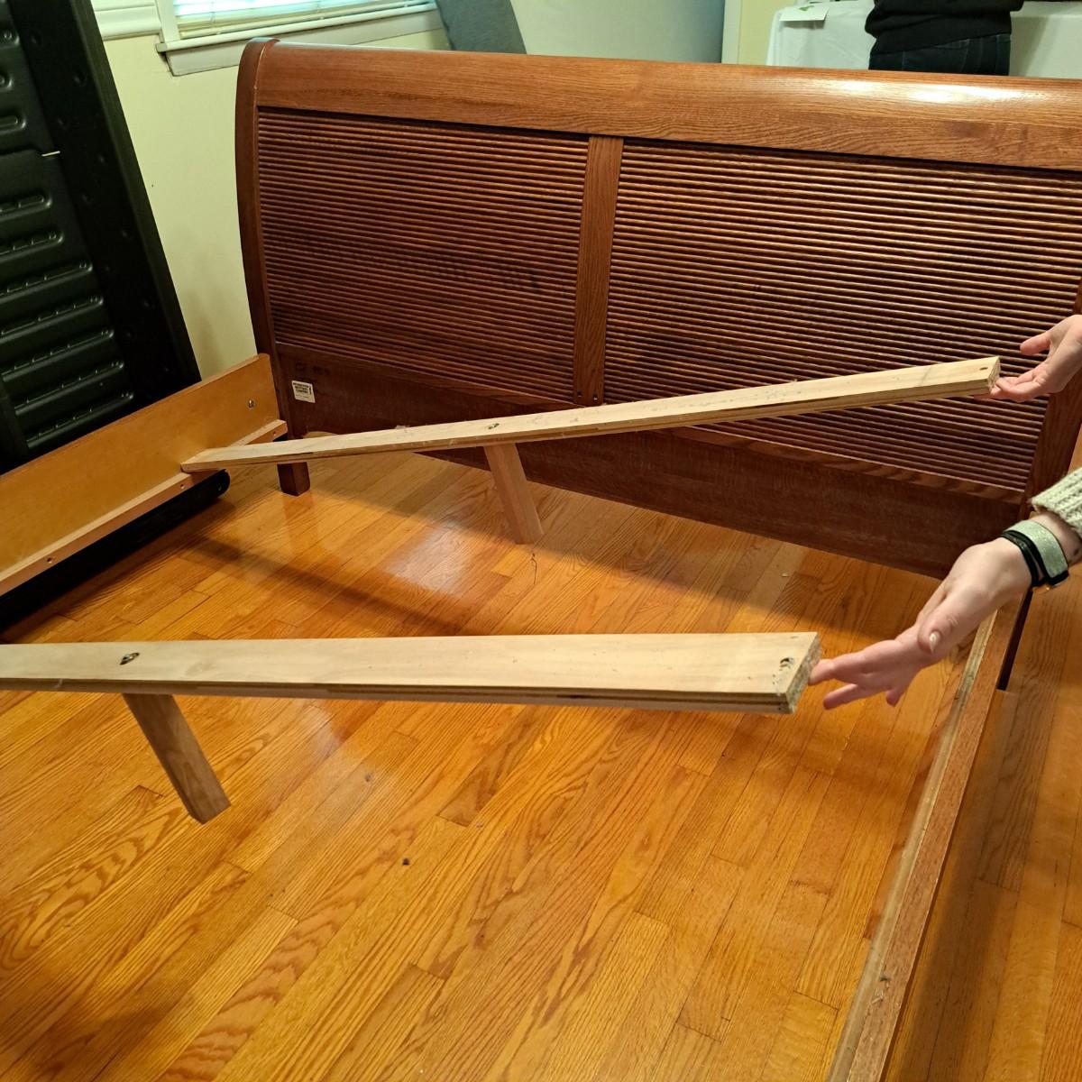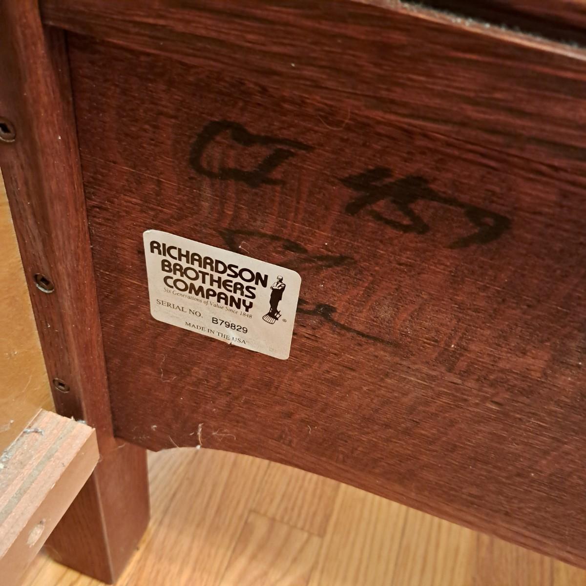 Richardson Bros. Company queen size contemporary sleigh bed frame, 86"L x 65." Bed frame appears to be made of oak wood. Top of headboard measures 52.5"H. Top of footboard measures 38.5"H. Has three removable inner slat boards with middle center legs. A small 2.5" section of oak veneer has come apart at the foot of bed frame as shown. Bed has a plastic Sleep Number platform base. Casper brand memory foam mattress is available to the winning bidder if desired, but winning bidder is not required to take it. There appears to be some faint surface stains to mattress as shown, but its integrity does not appear to be compromised. Zip cover can be removed and washed if desired.