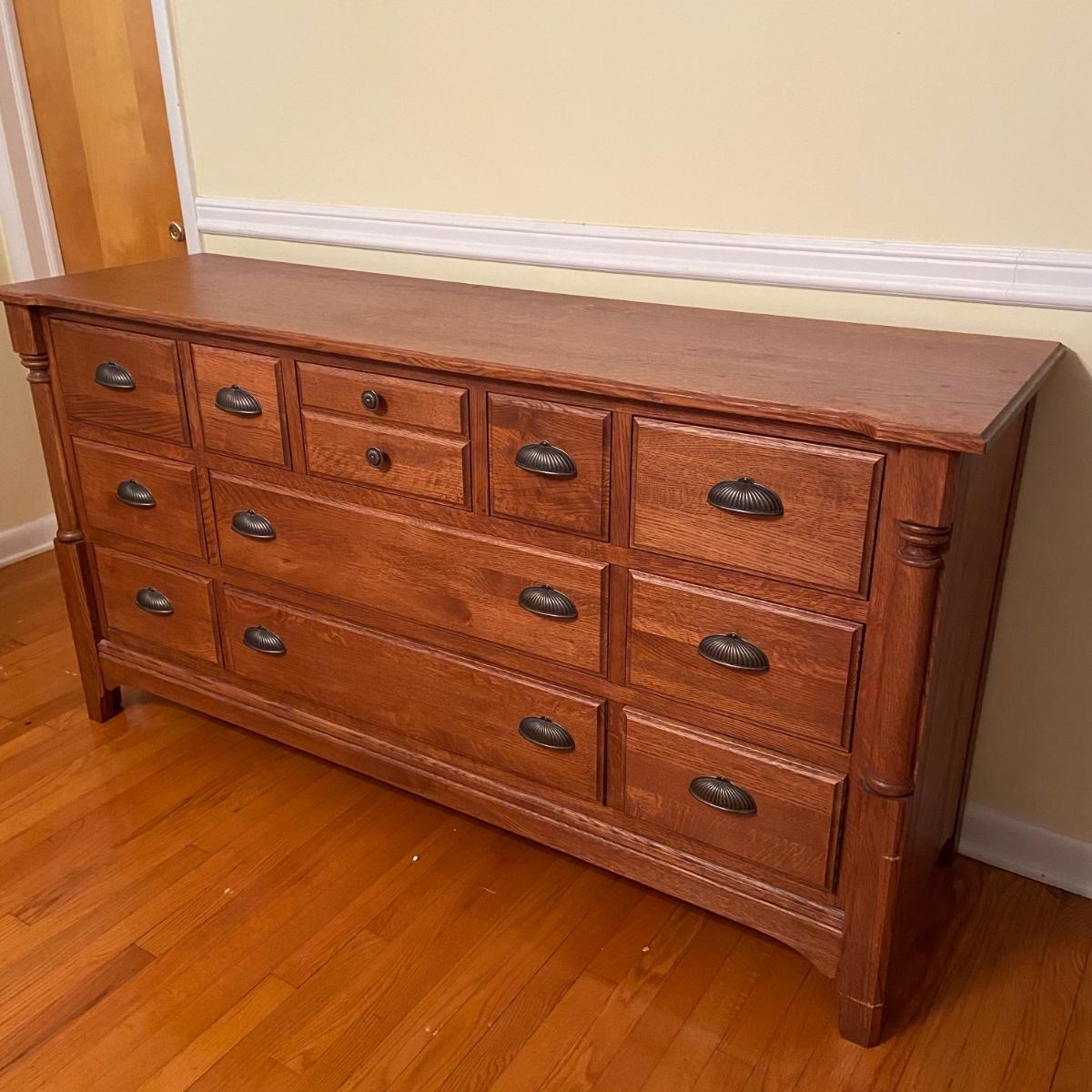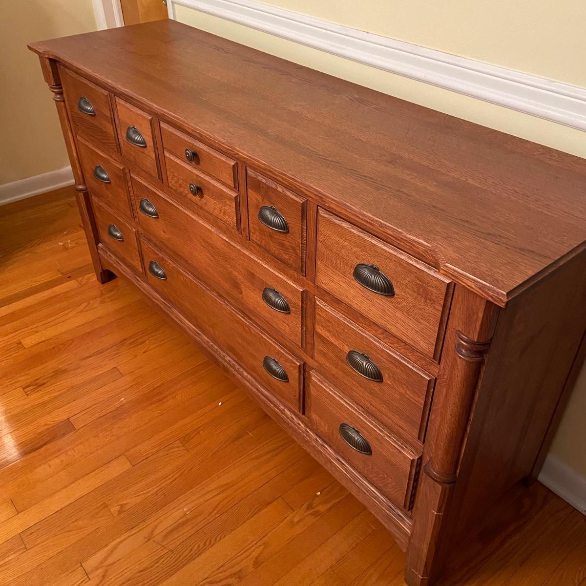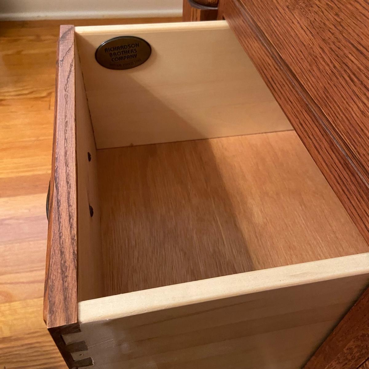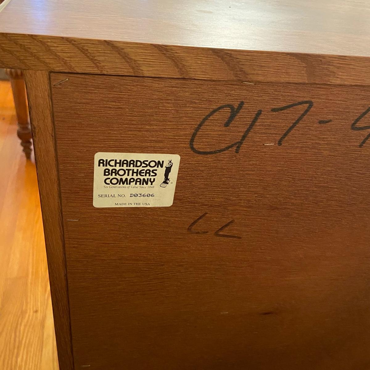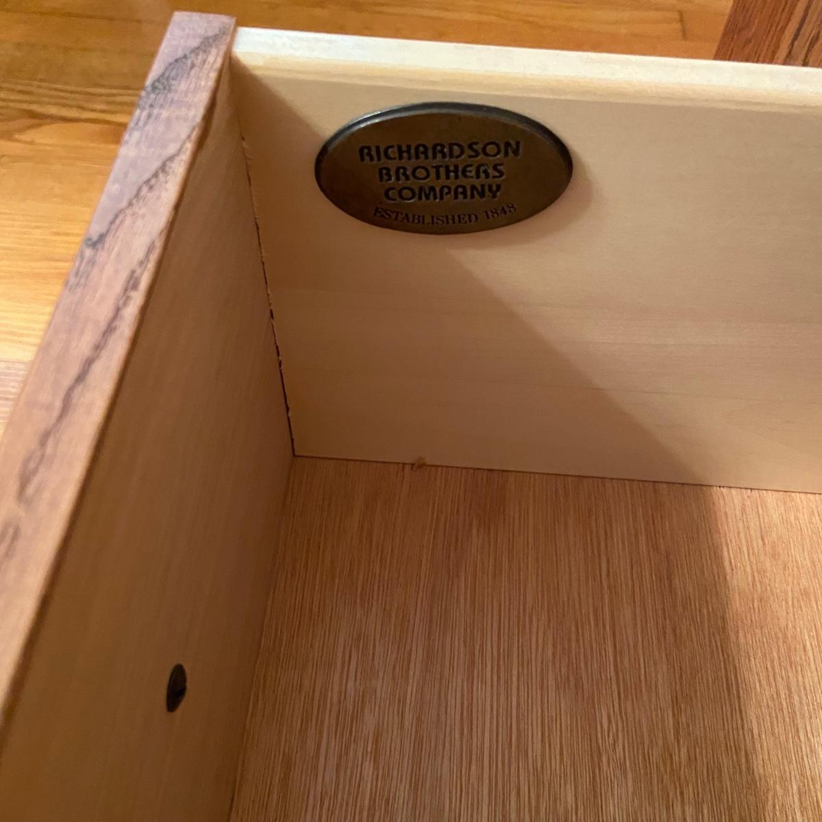 Wooden Richardson Brothers Co. wooden long dresser. This dresser has 11 drawers and jewelry box insert in top middle drawer. Unit measures 68” x 19” x 35”H. The drawers have dovetail construction and brass handles with medallion brass door pulls on top center drawer. Does have a couple of small scratches on front corners. This piece matches furniture in other lots in this auction.
