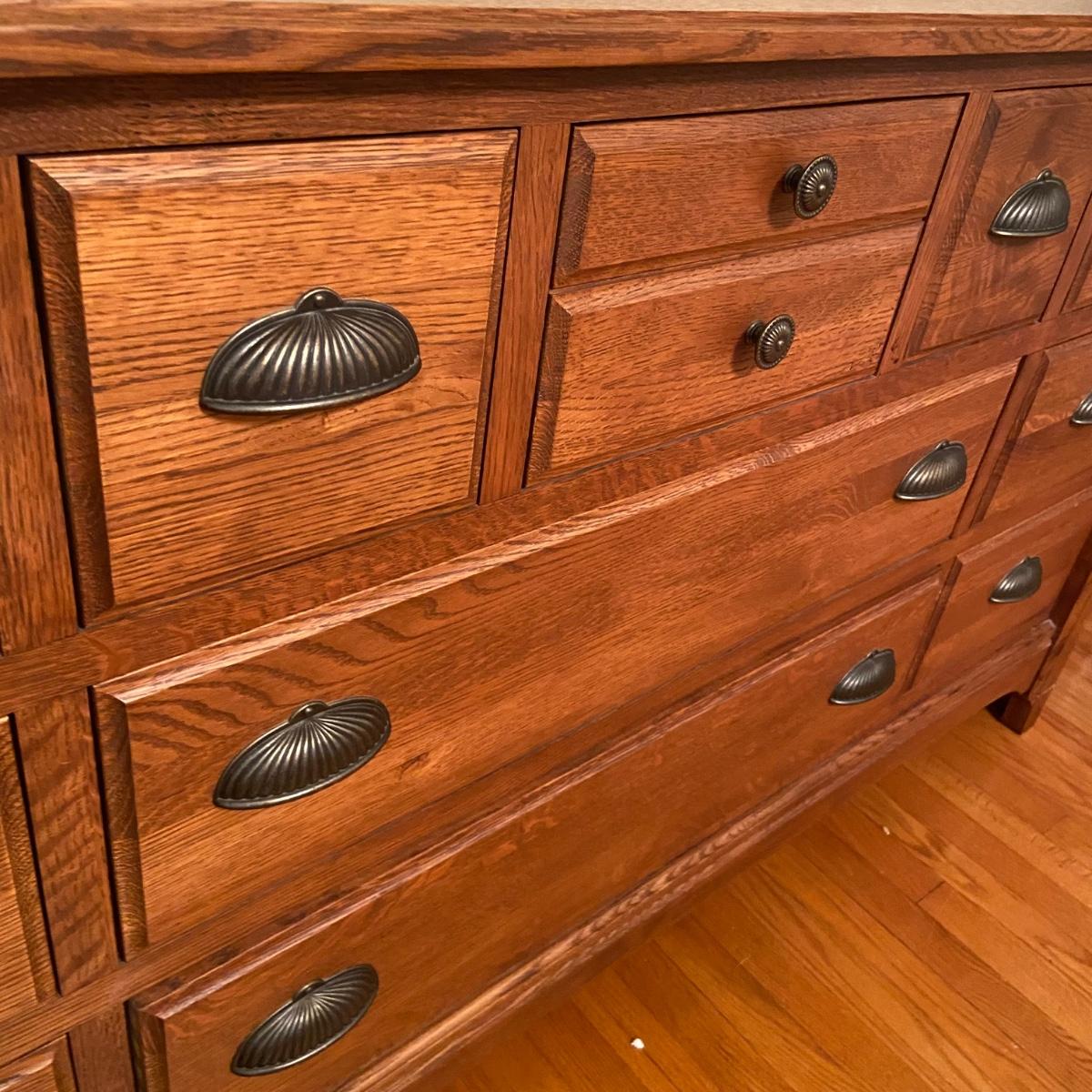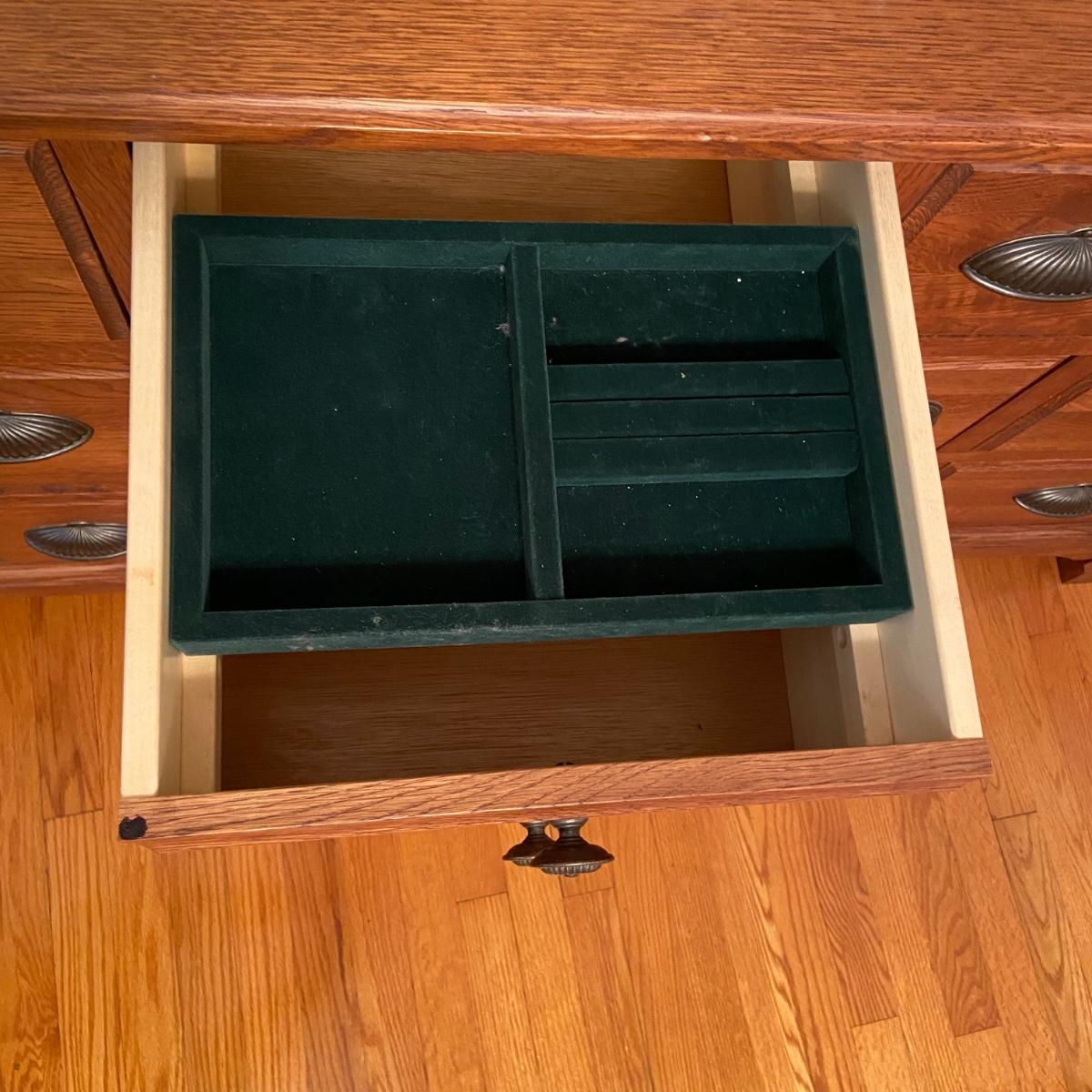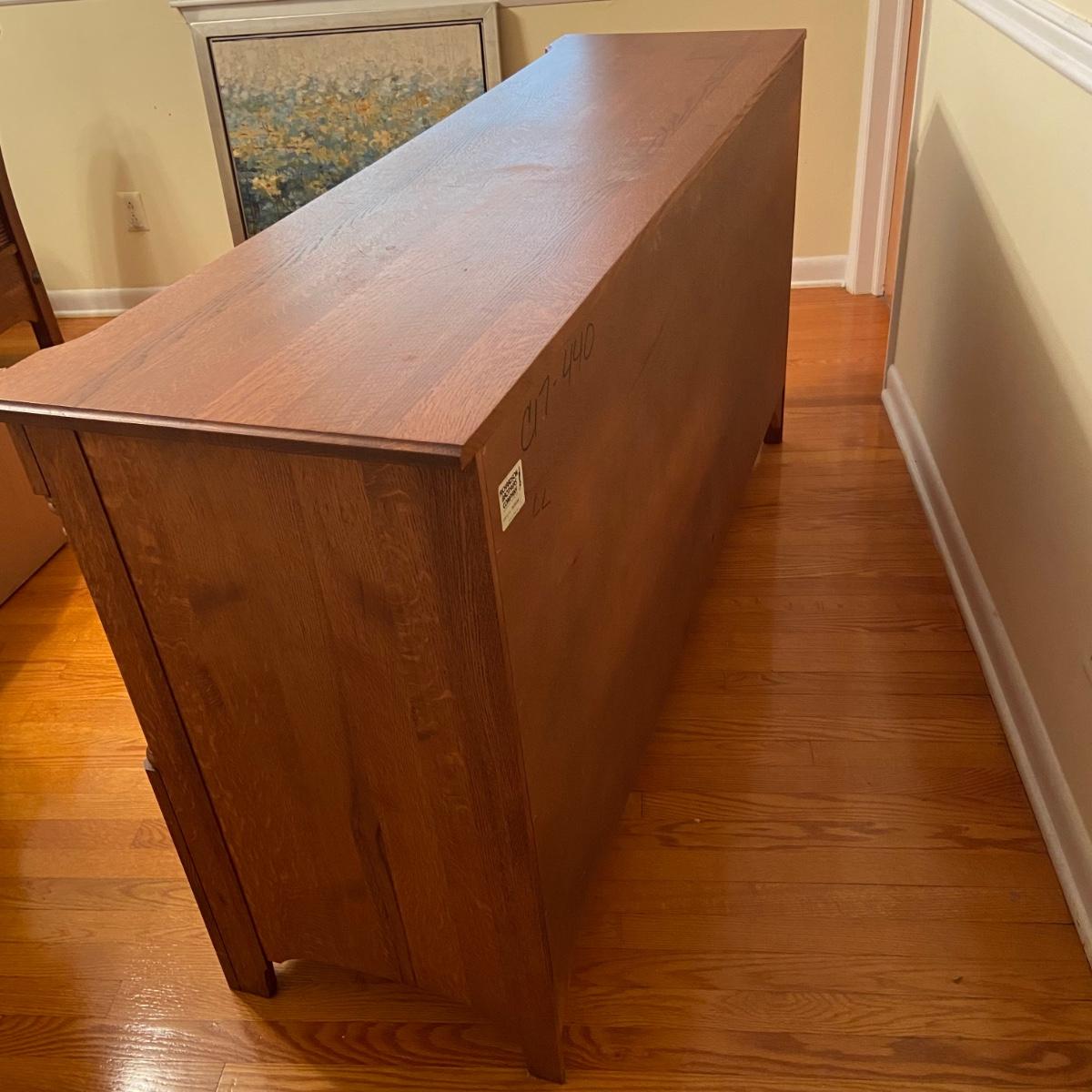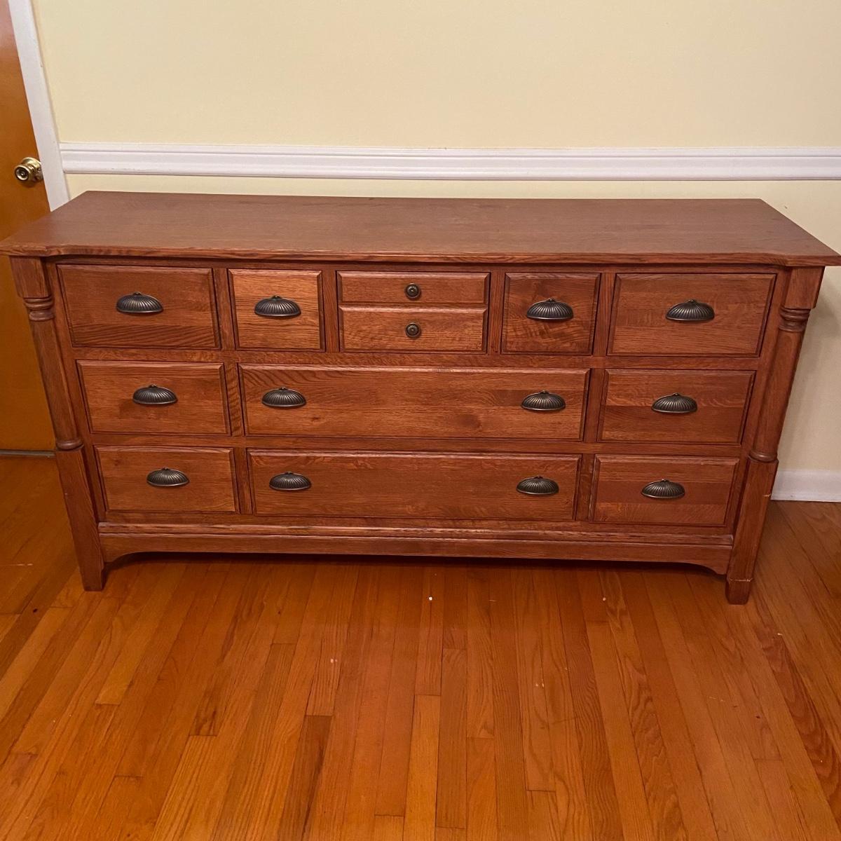 Wooden Richardson Brothers Co. wooden long dresser. This dresser has 11 drawers and jewelry box insert in top middle drawer. Unit measures 68” x 19” x 35”H. The drawers have dovetail construction and brass handles with medallion brass door pulls on top center drawer. Does have a couple of small scratches on front corners. This piece matches furniture in other lots in this auction.