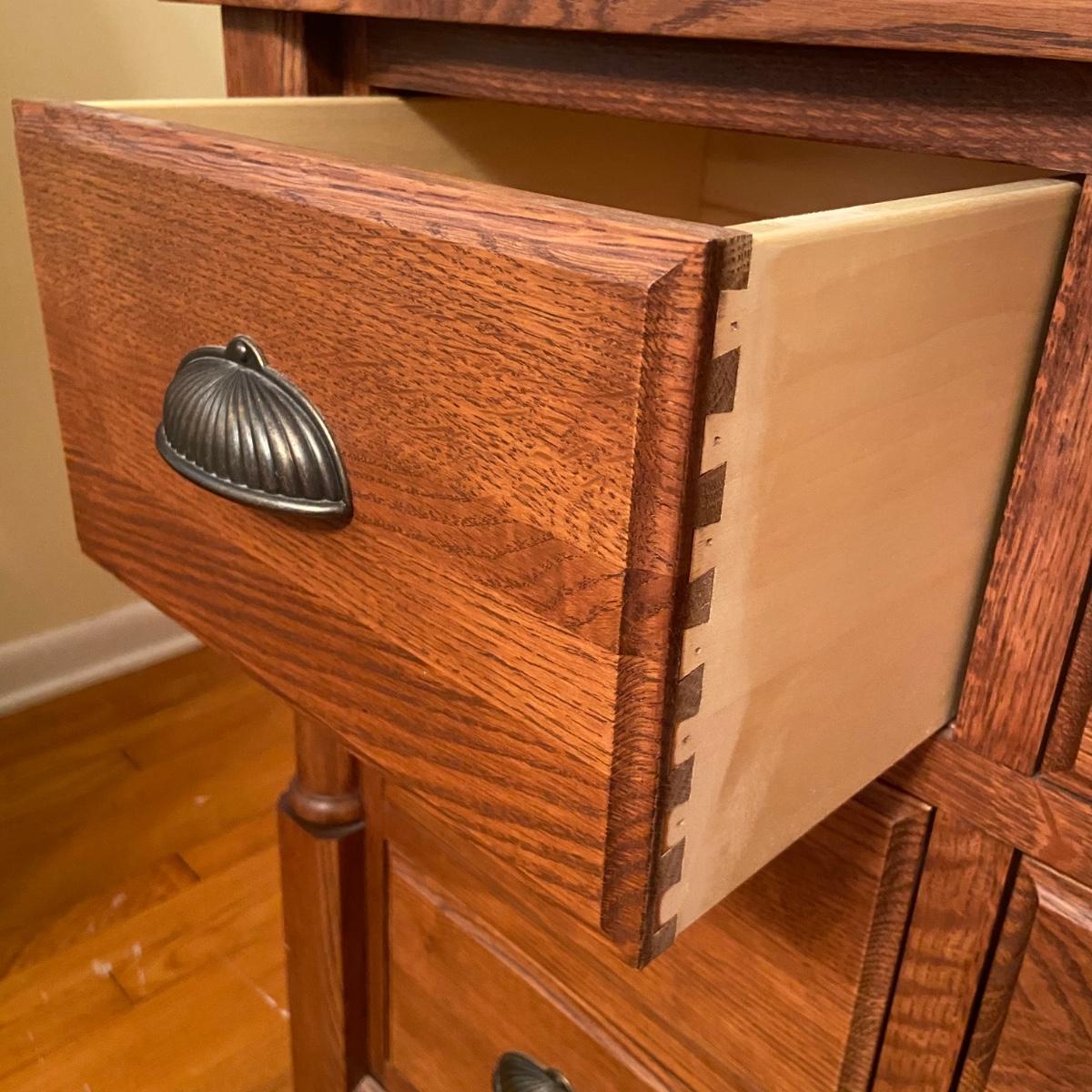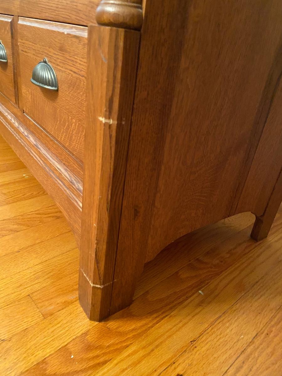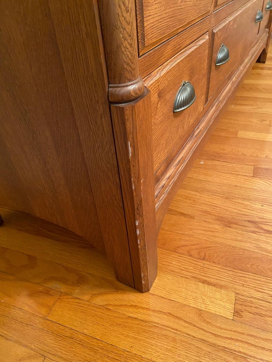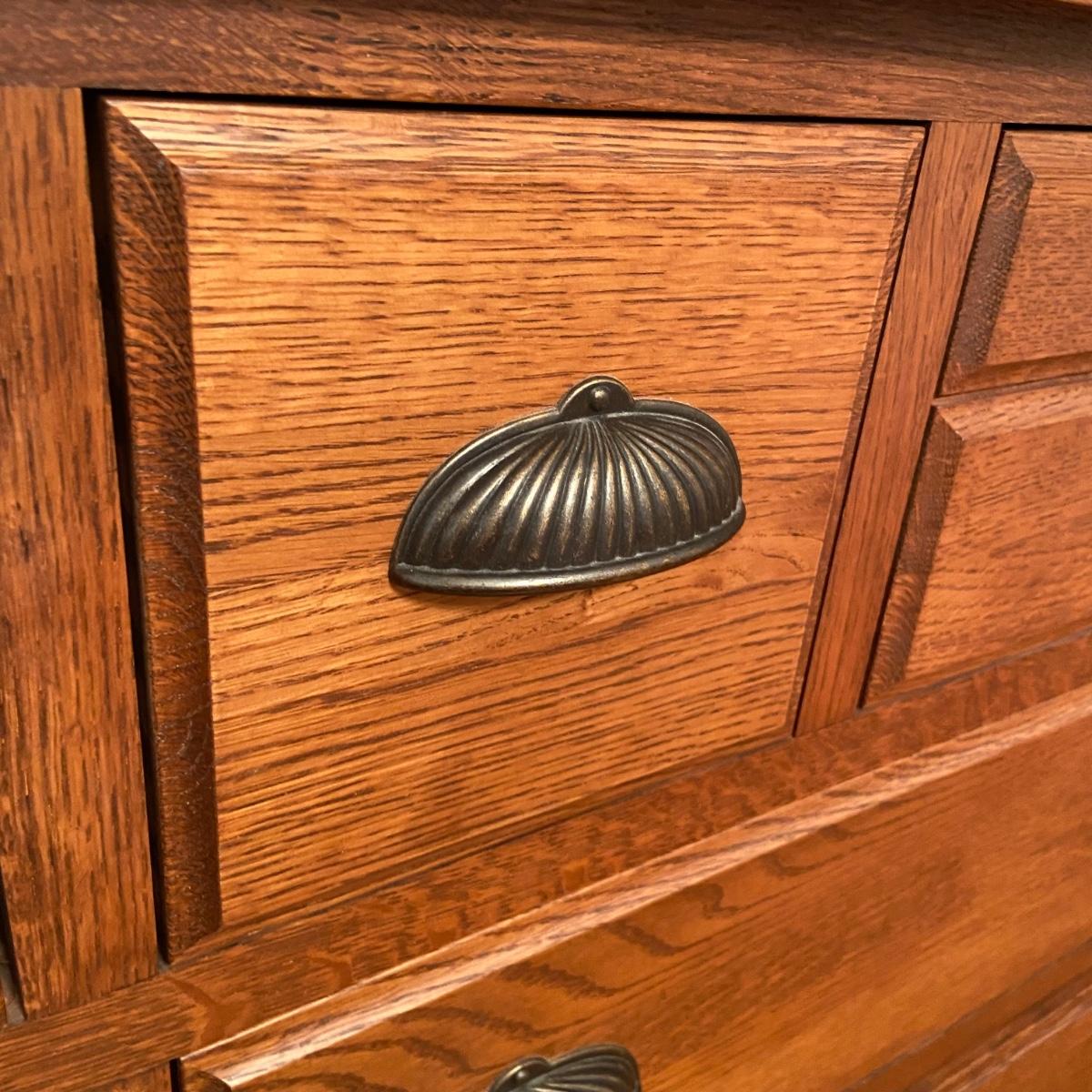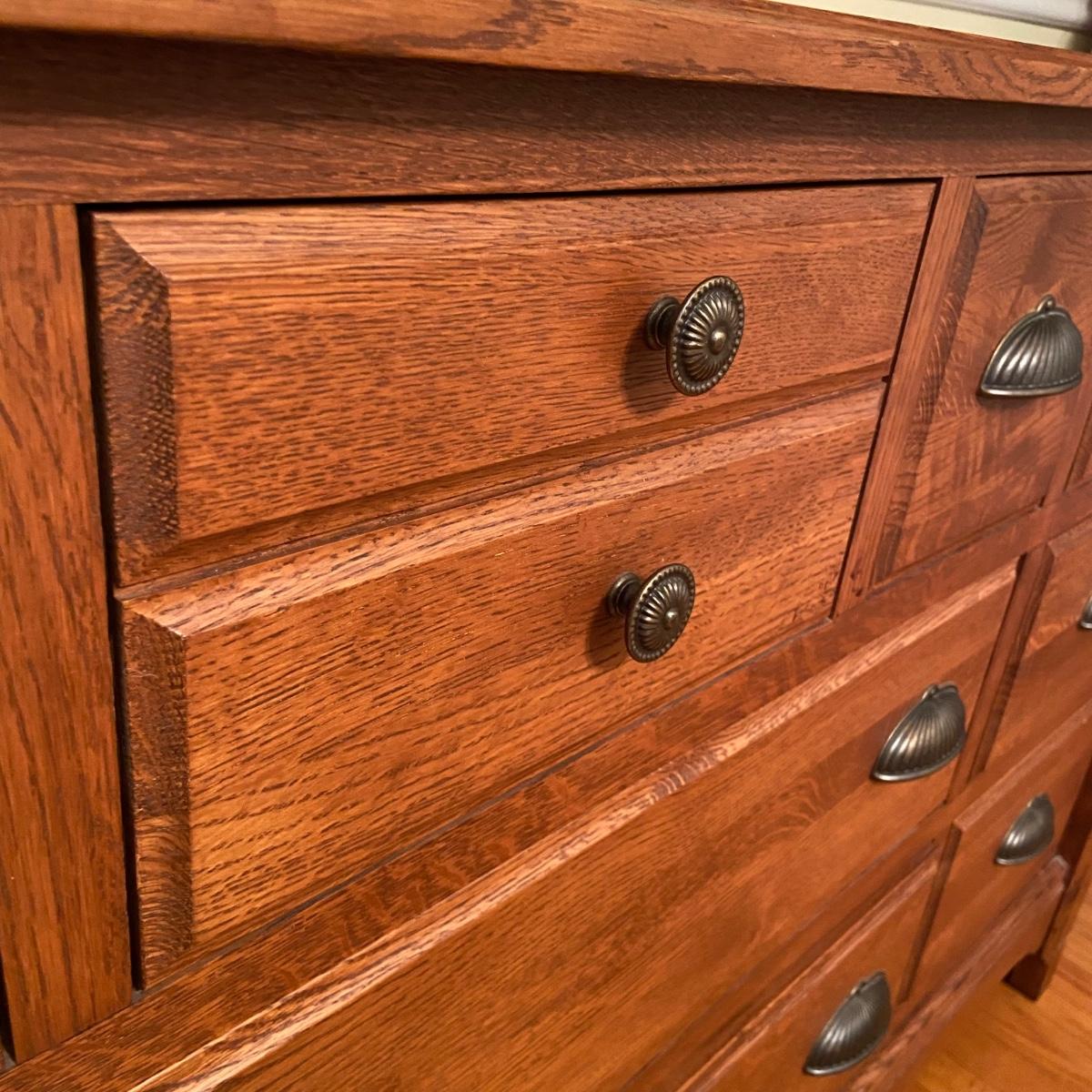Wooden Richardson Brothers Co. wooden long dresser. This dresser has 11 drawers and jewelry box insert in top middle drawer. Unit measures 68” x 19” x 35”H. The drawers have dovetail construction and brass handles with medallion brass door pulls on top center drawer. Does have a couple of small scratches on front corners. This piece matches furniture in other lots in this auction.
