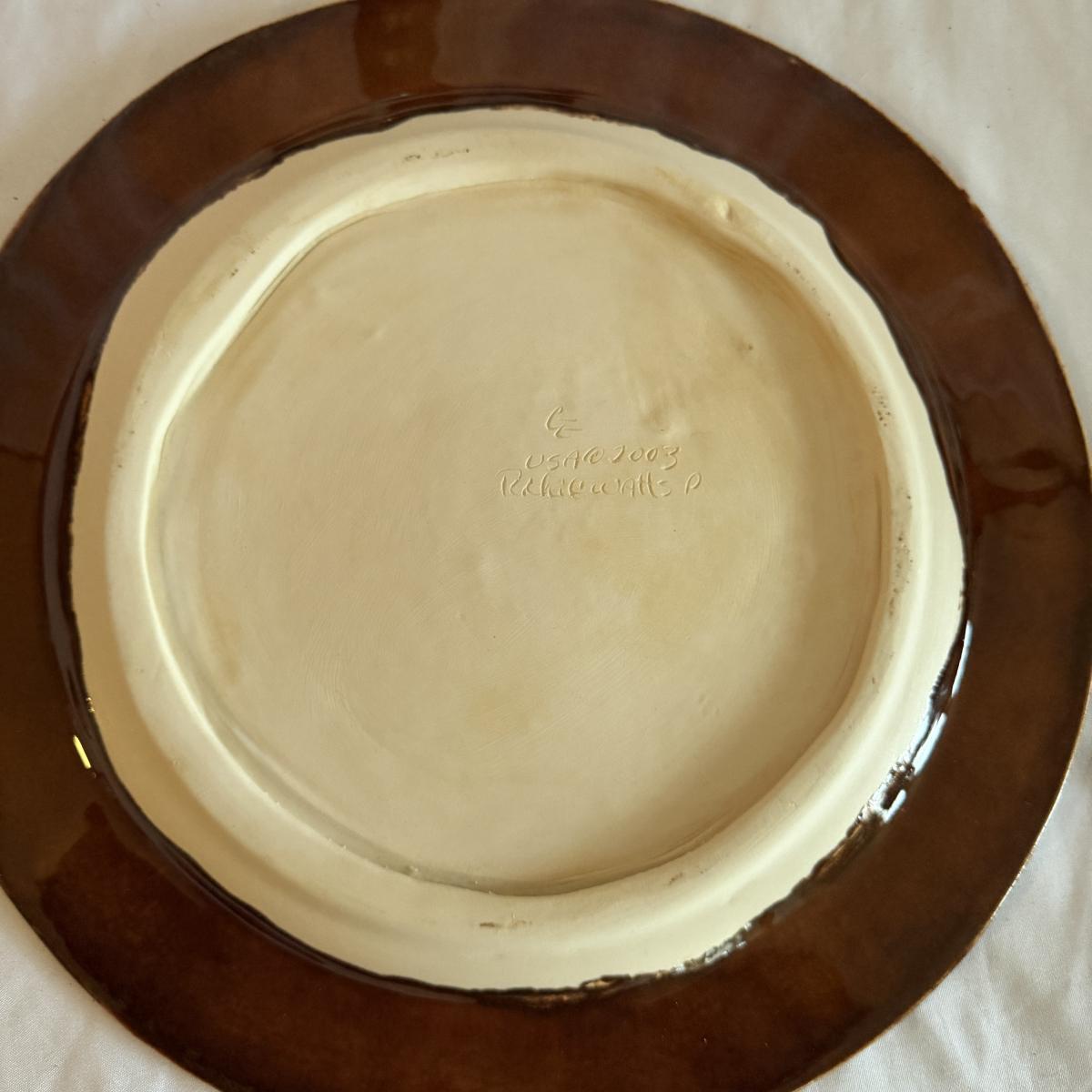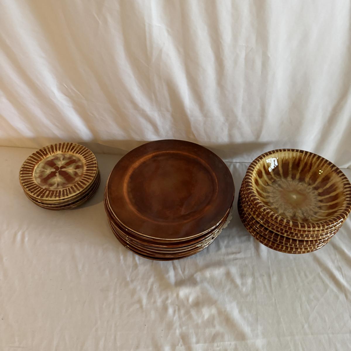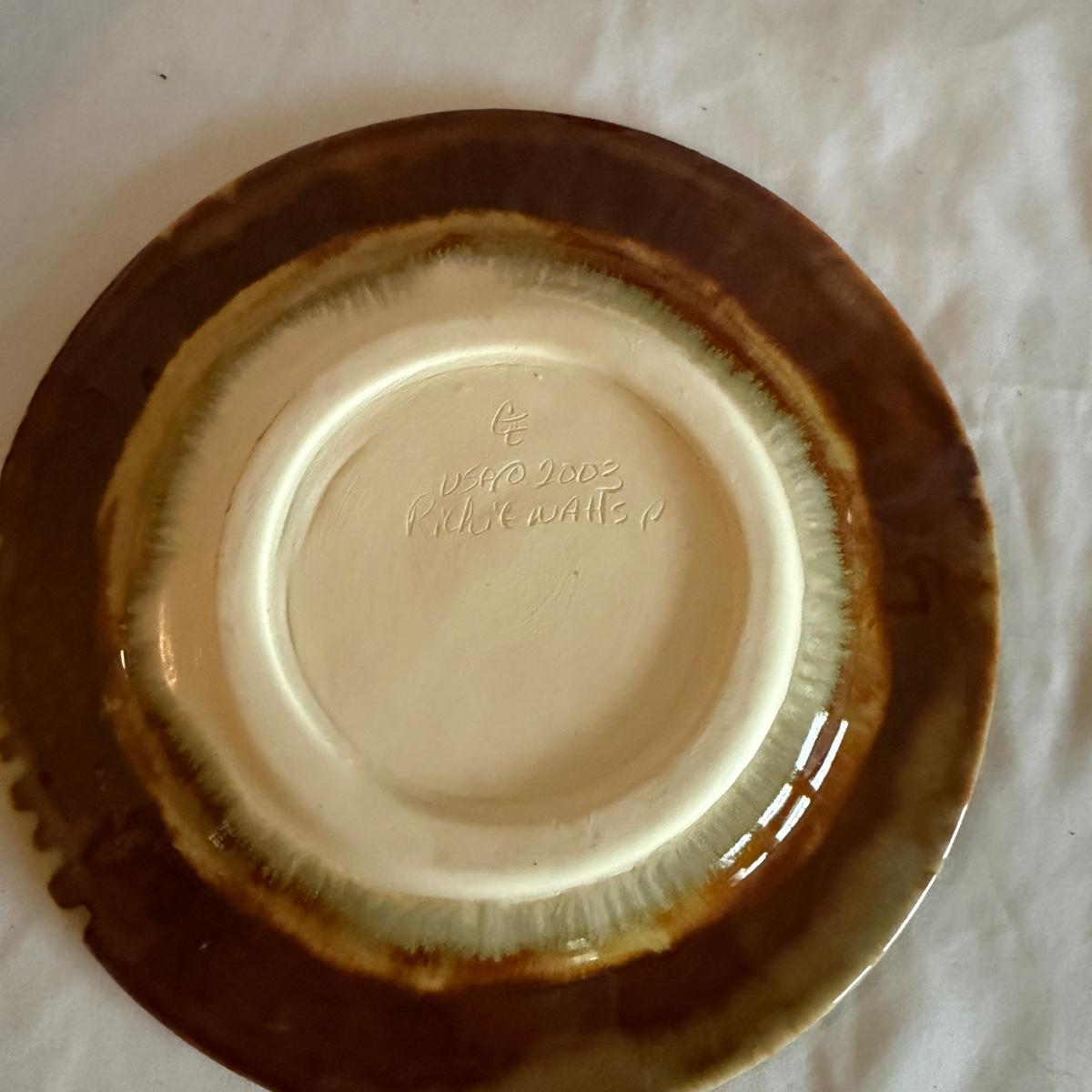 Lot contains signed Richie Watts handmade pottery dish set. Includes eight dinner plates, eight salad plates and eight bowls. Dinner plates measure 11”D.