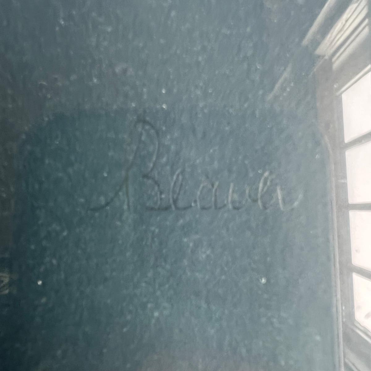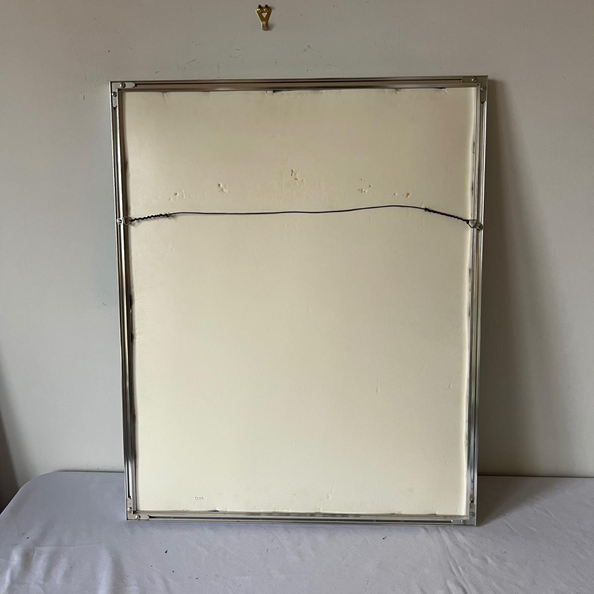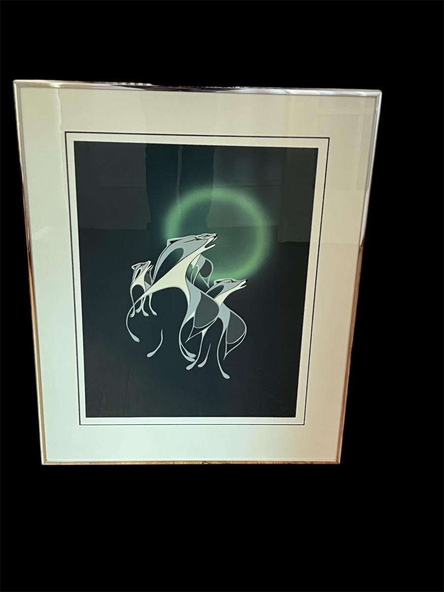 This signed print is numbered 42/100. Signature, title etc appear to be pencil signed on the dark blue print. Under glass, matted and mounted in a brushed silver colored frame.