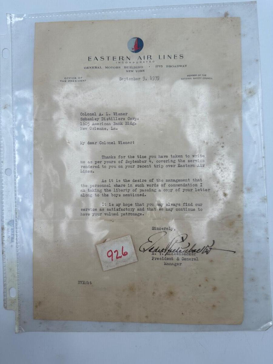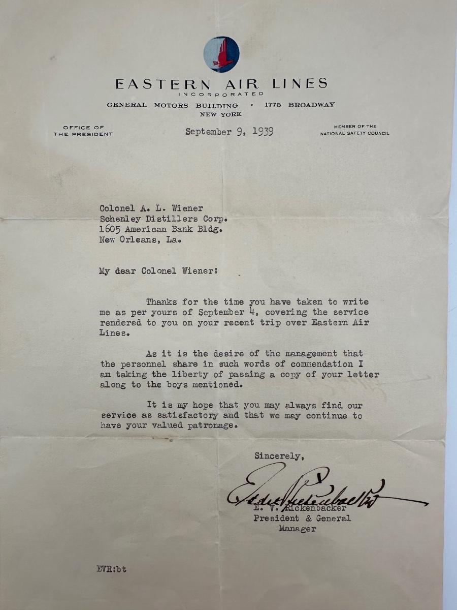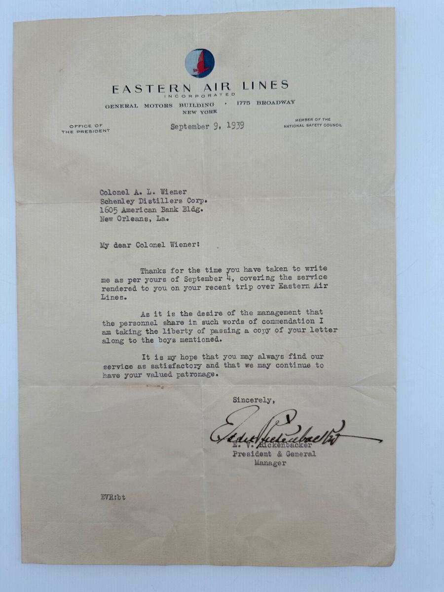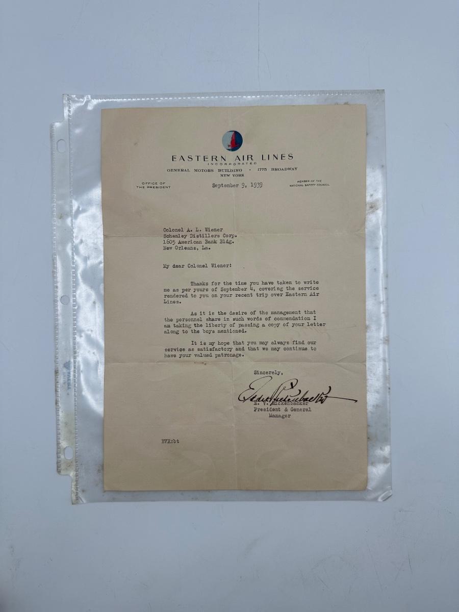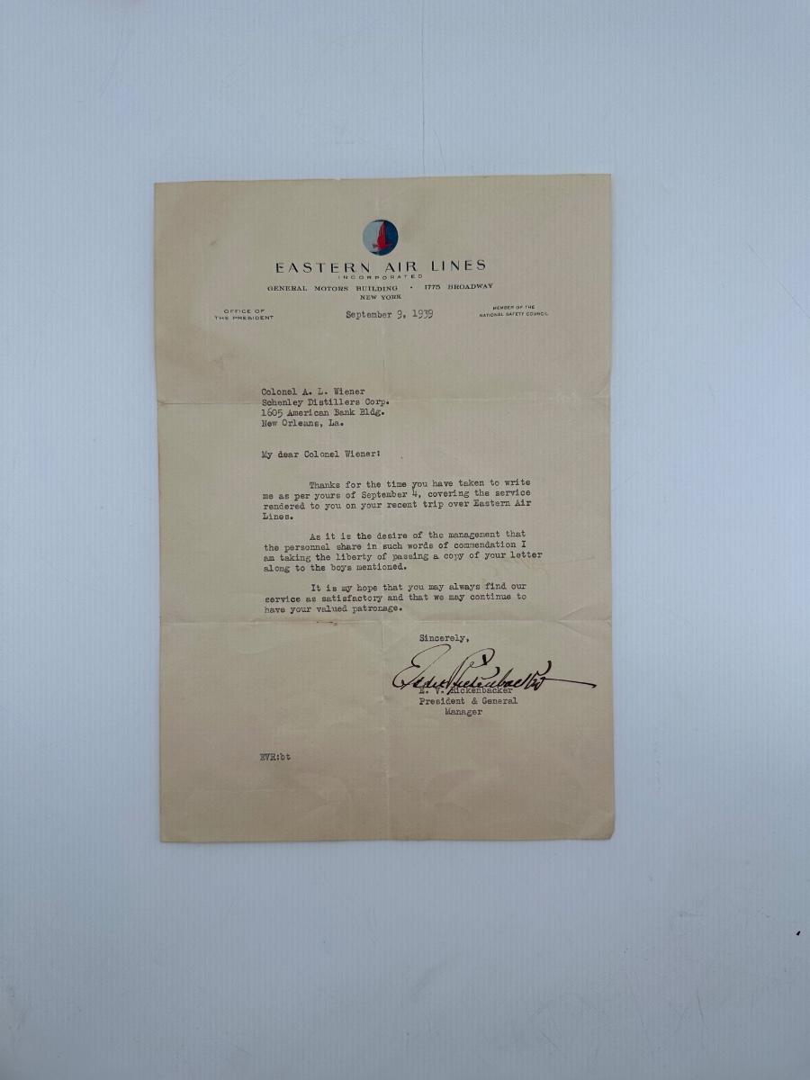 Rickenbacker Letter to Colonial Wiener, Eastern Airlines, 1939