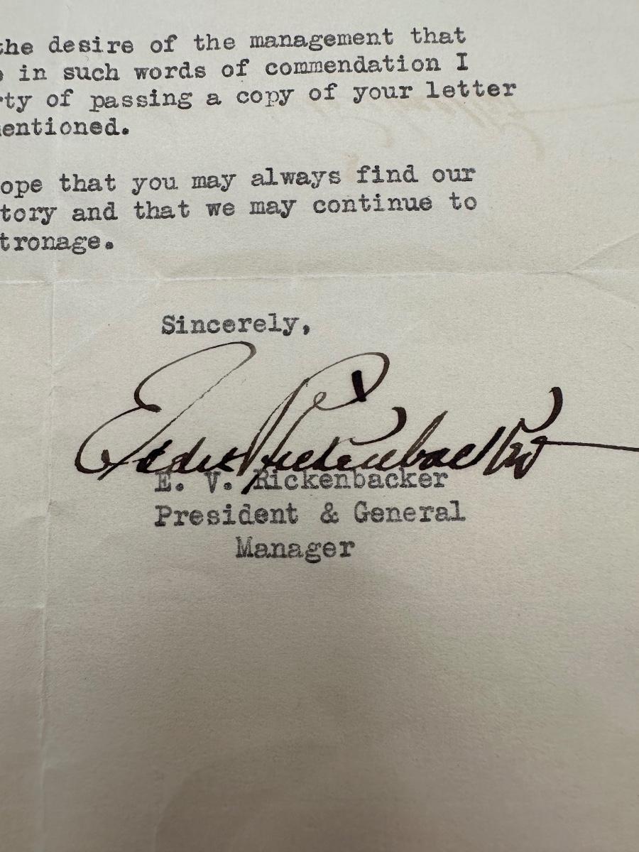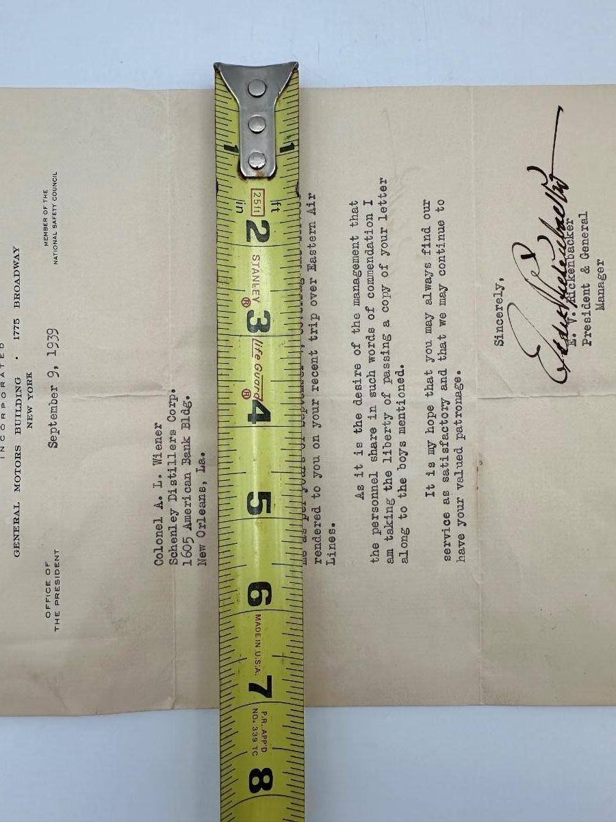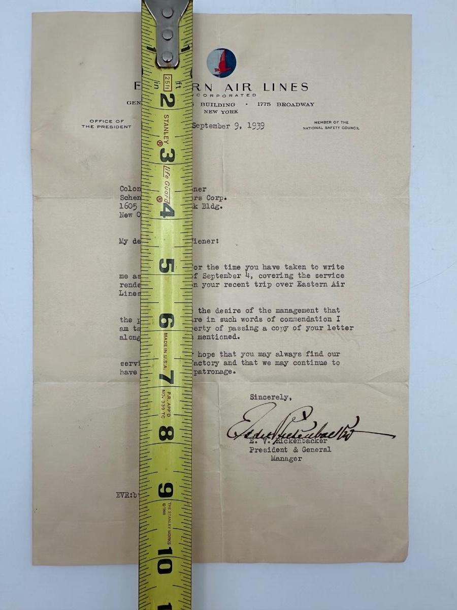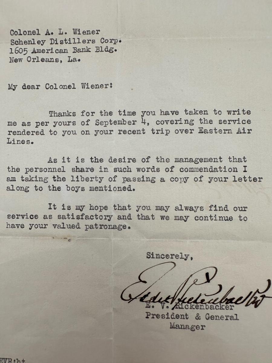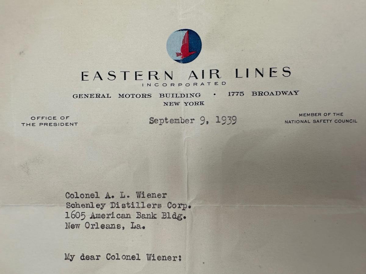 Rickenbacker Letter to Colonial Wiener, Eastern Airlines, 1939