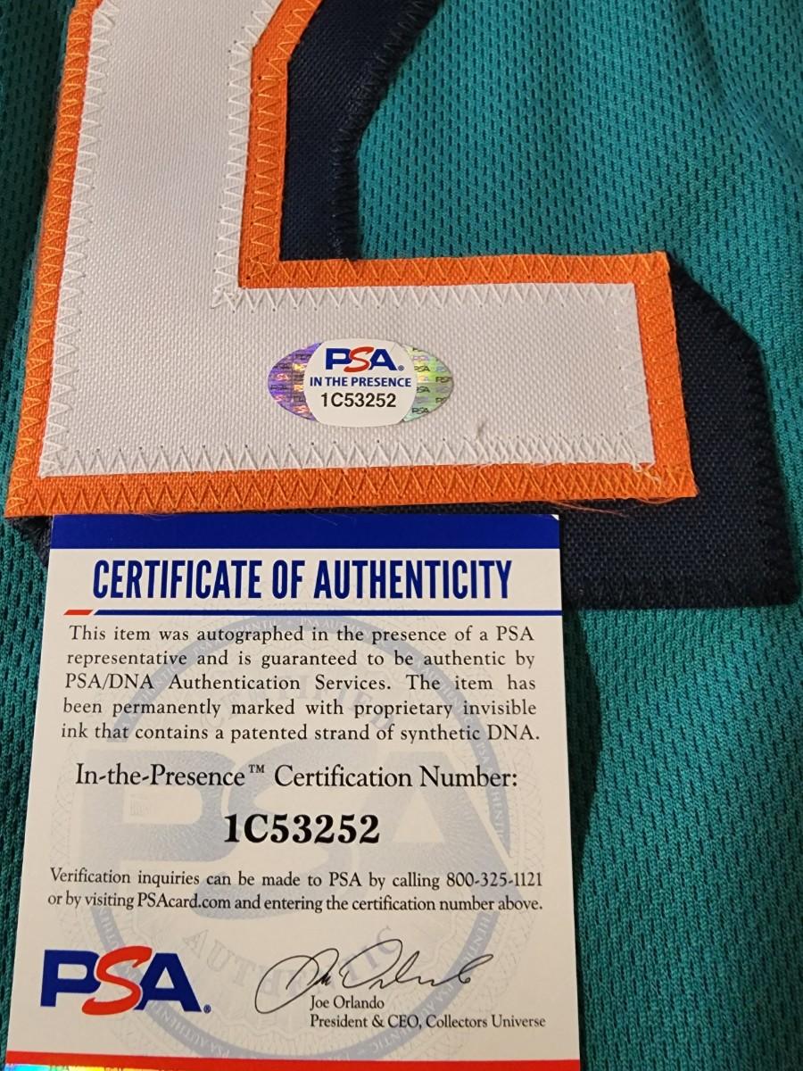 The product is a Ricky Williams signed Miami Dolphins football jersey with autograph authentication from Professional Sports Authenticator (PSA). This authentic original item is a must-have for any football fan or collector looking to add a unique piece to their collection. With the signature of the legendary player and the certification from PSA, this jersey holds value both for its historical significance and its rarity in the sports memorabilia market.