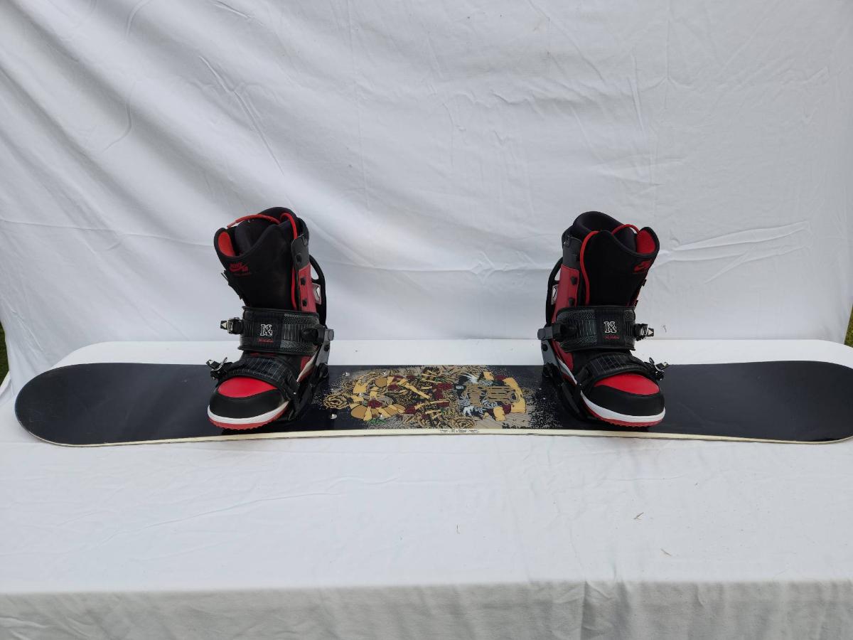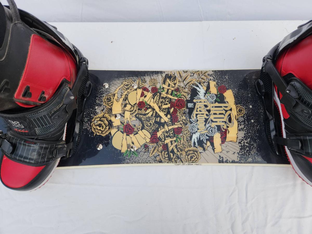 Ride snowboard featuring bold red and black graphics on both sides. Comes equipped with Nike SB Vapen snowboard boots in red and black colorway, size 13 (US), and matching bindings. The snowboard showcases an intricate skull and rose design on one side and Ride branding on the other. Appears in good condition, showing no major visible wear or damage.