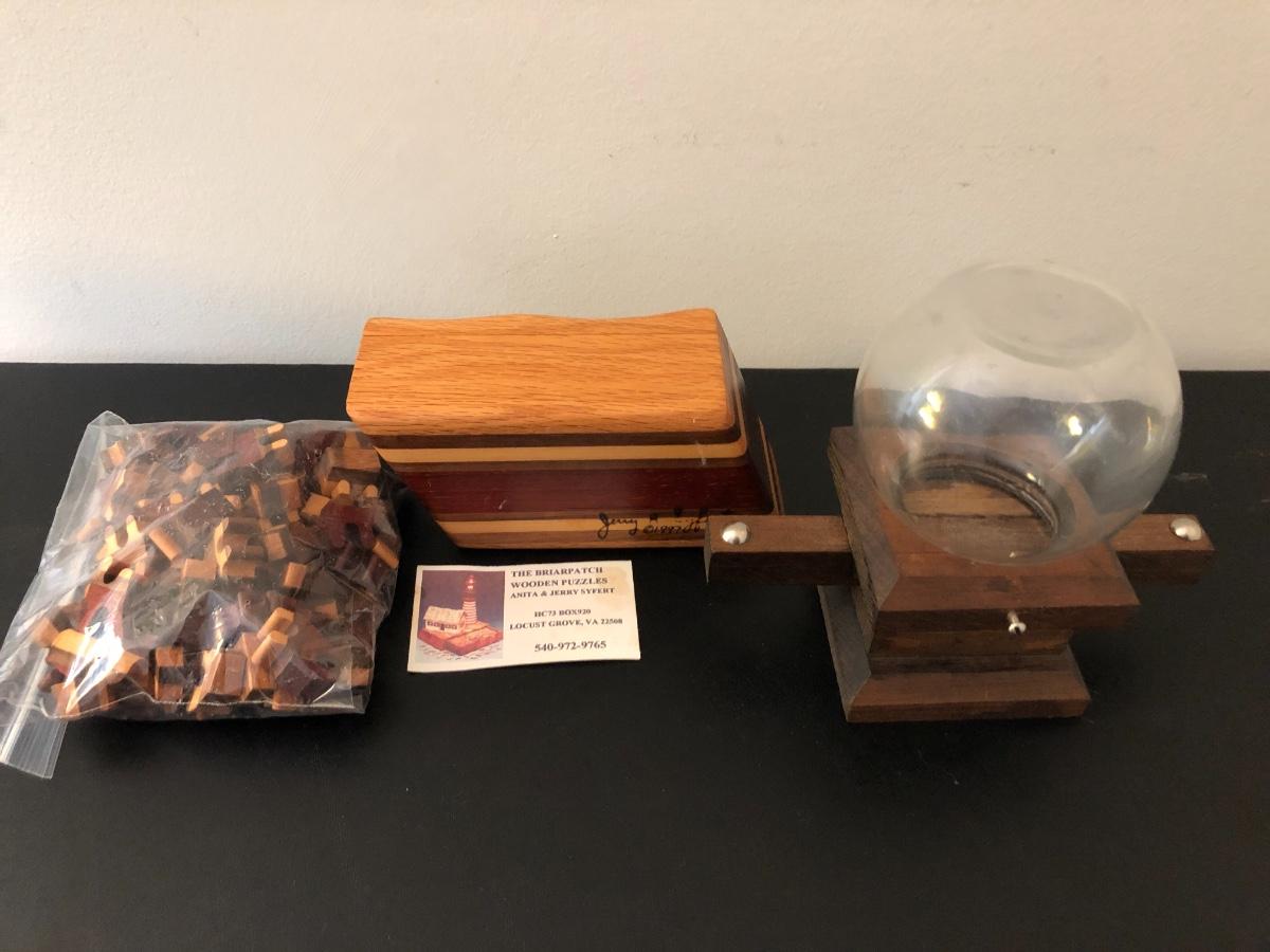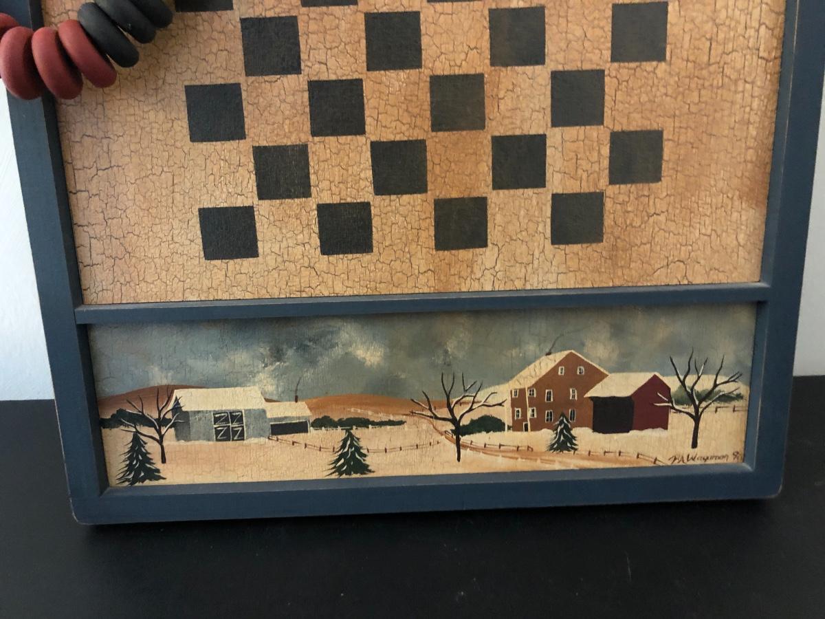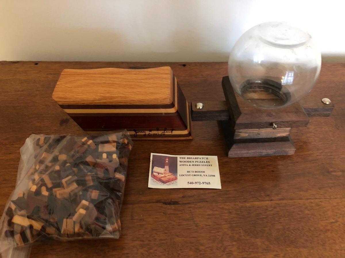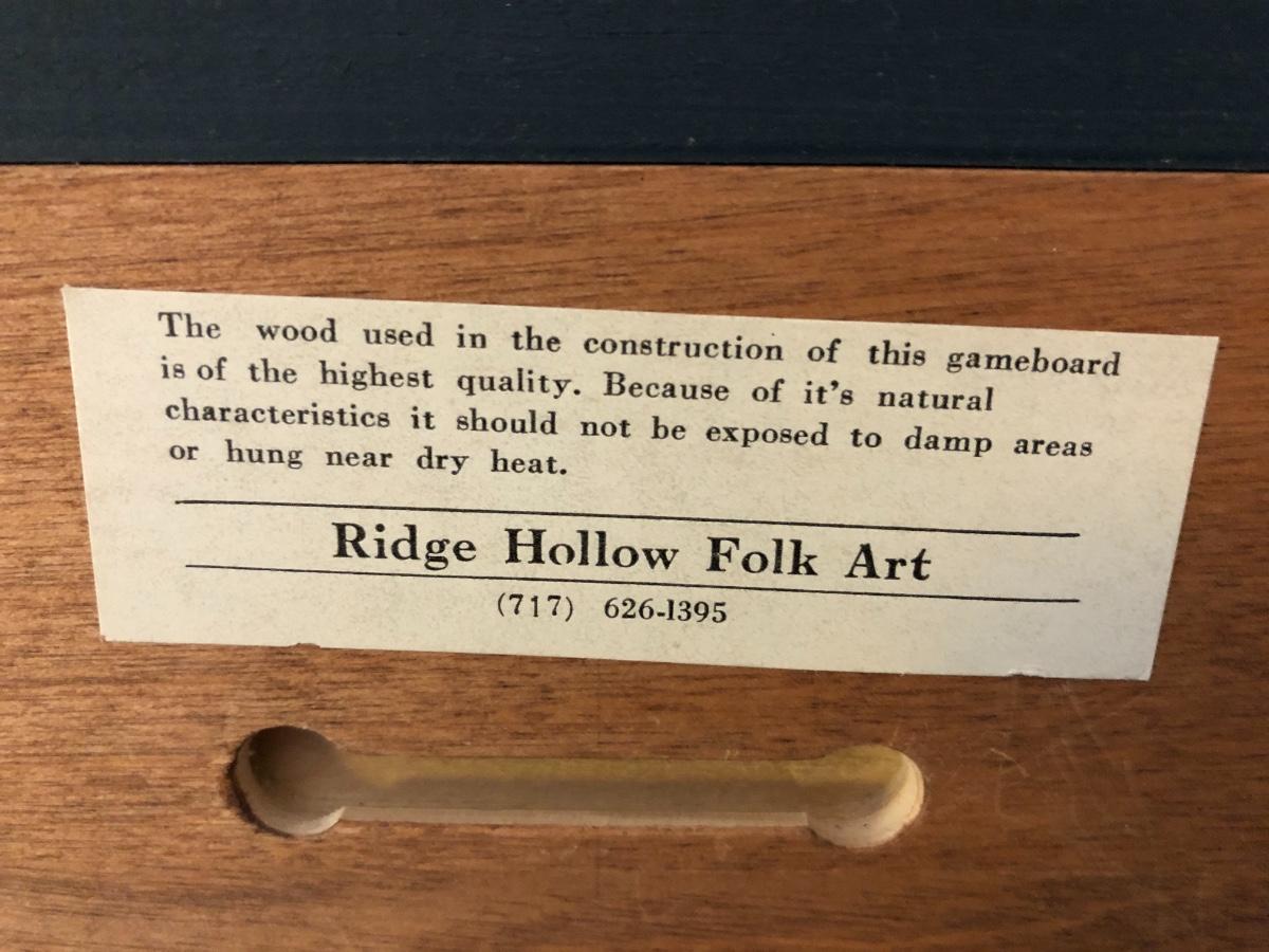 Ridge Hollow Folk Art Game Board, Briarpatch Wooden Puzzle Signed Box, & Glass Dispenser -Lot 121