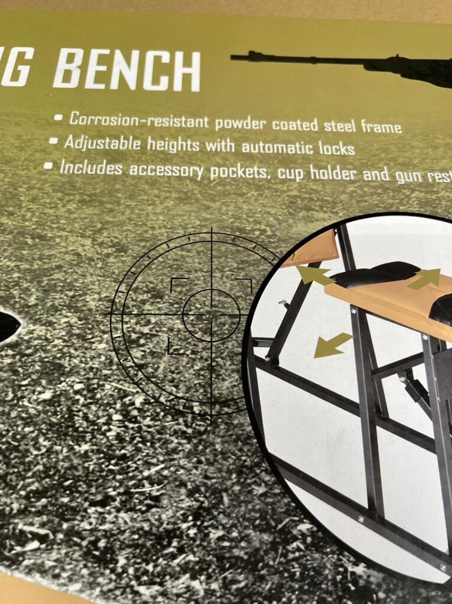 New in open box. This high quality shooting bench is ideal for hunting, target practice, sighting, and dialing in scopes.