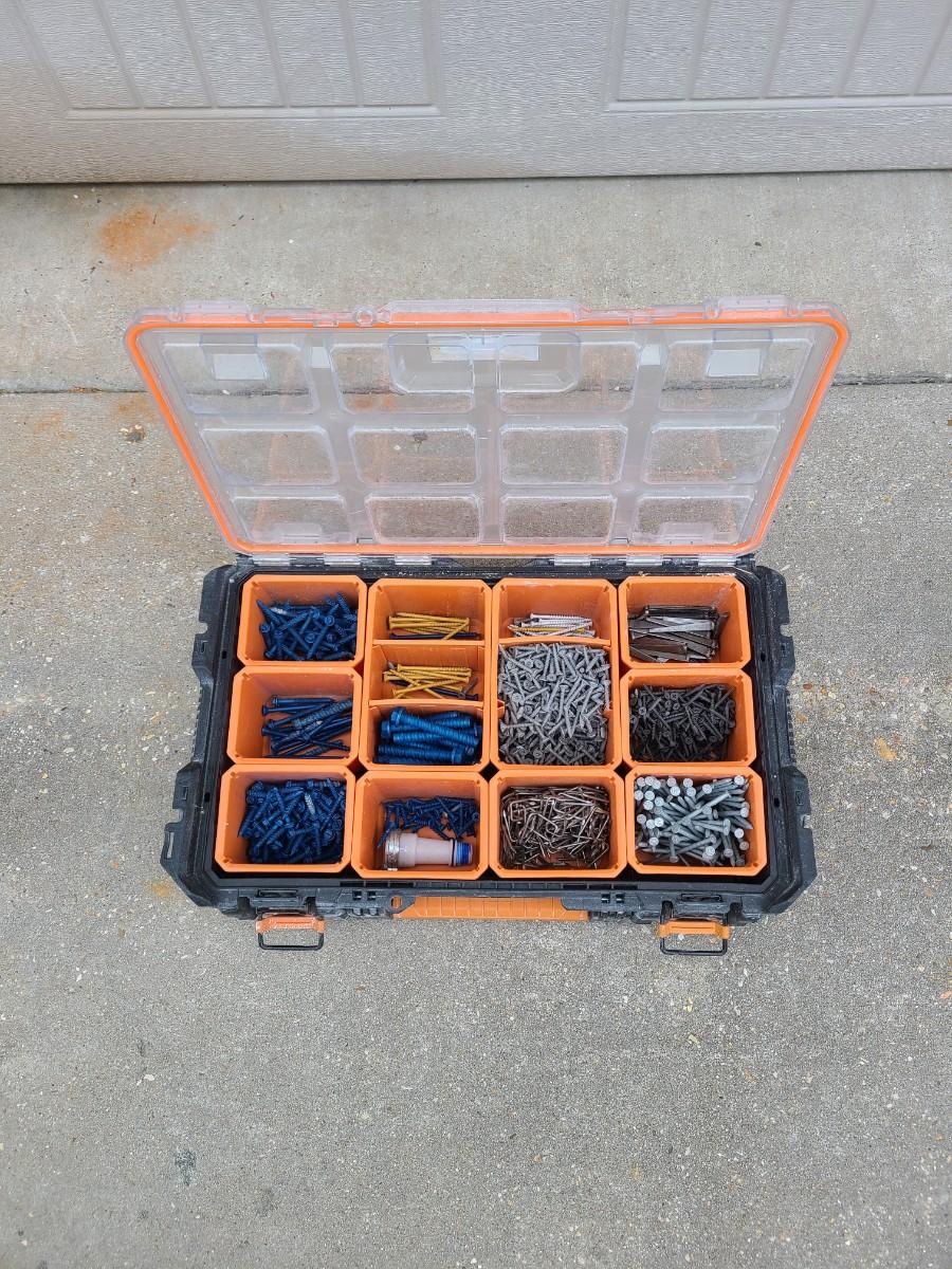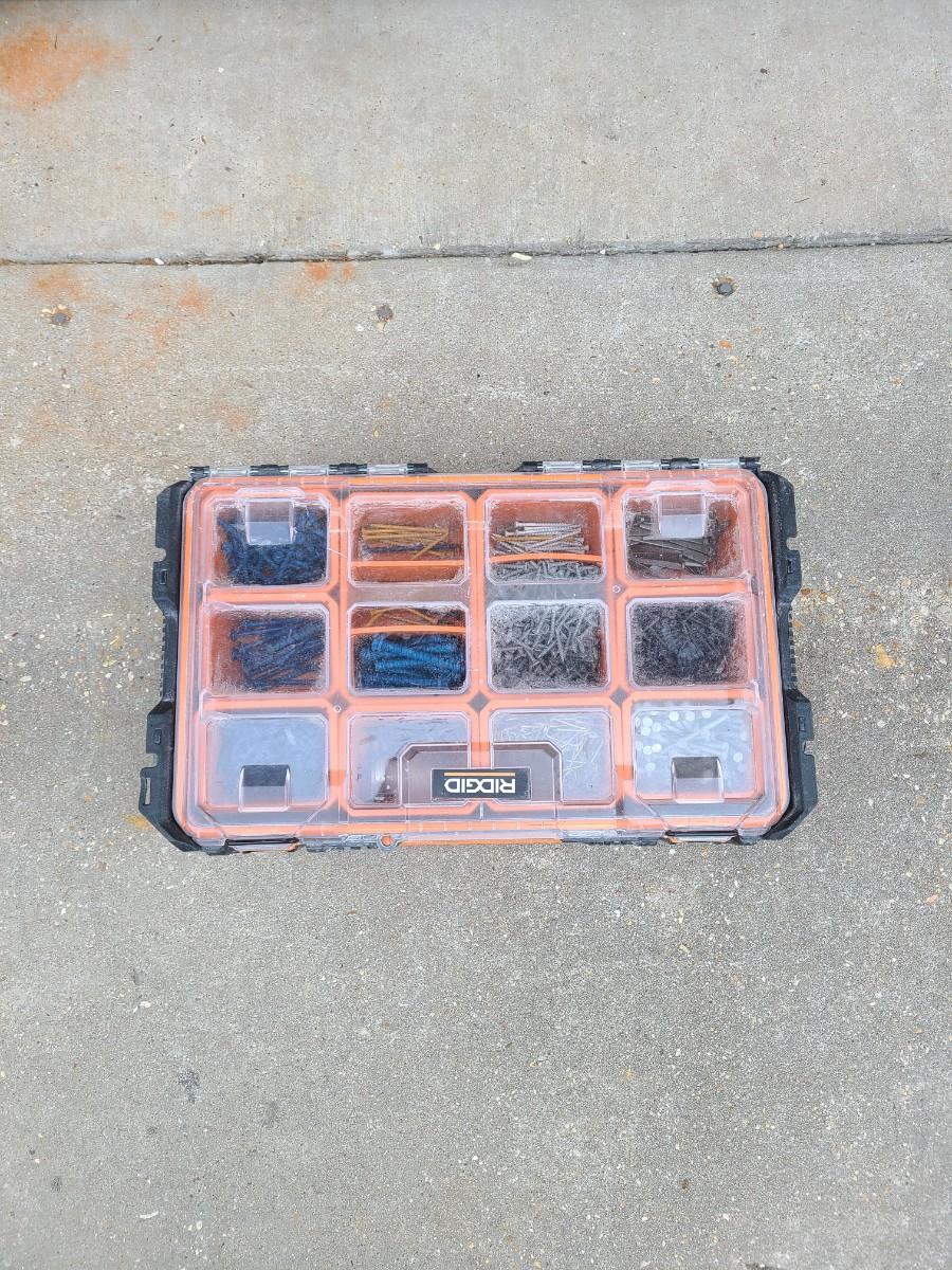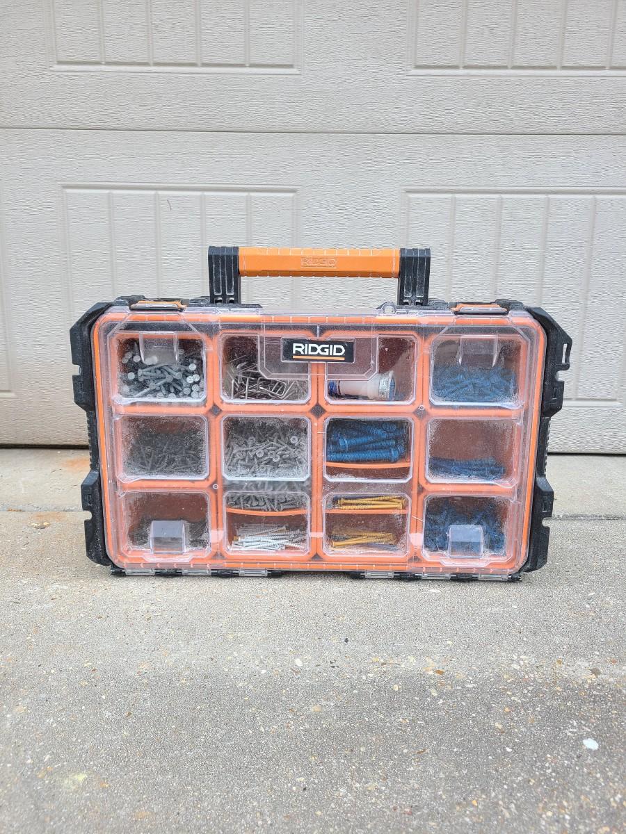 12-Bin Ridgid Carry Case w/ Screws. Comes with all screws and nails in pictures. 23" L x 13 1/2" W x 5" D