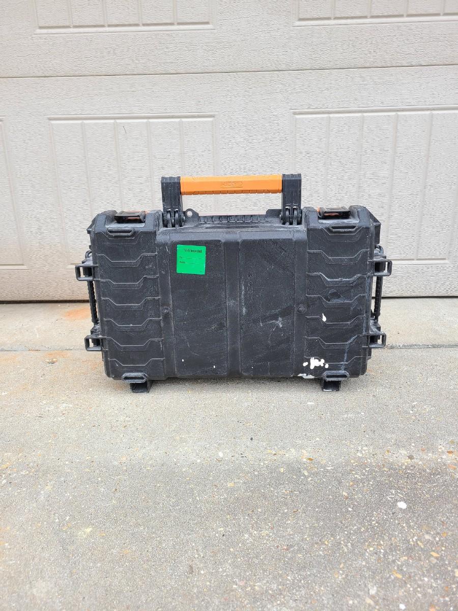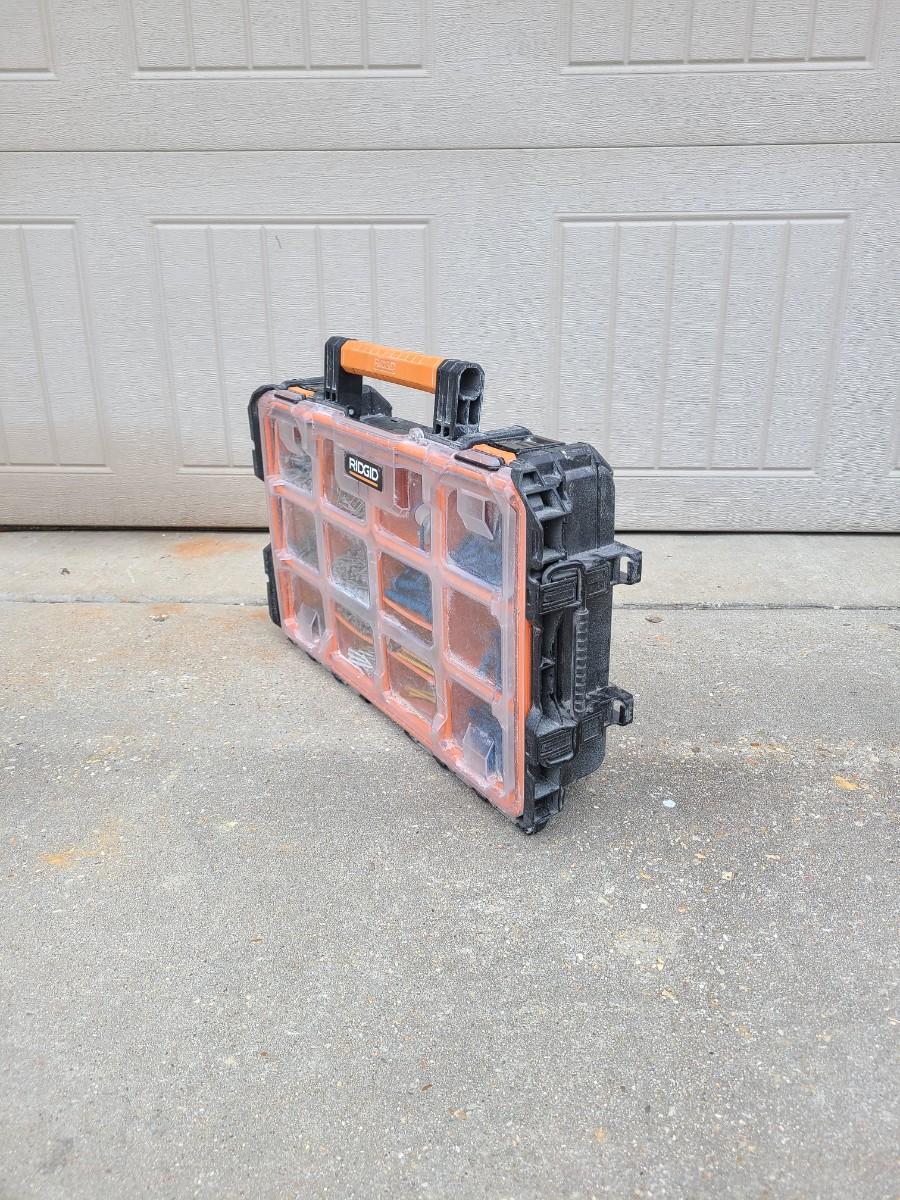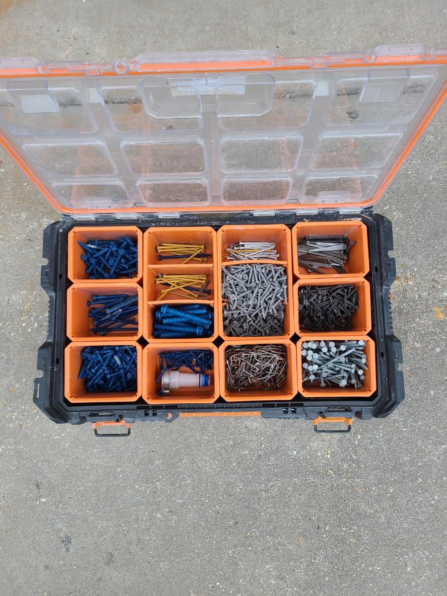 12-Bin Ridgid Carry Case w/ Screws. Comes with all screws and nails in pictures. 23" L x 13 1/2" W x 5" D