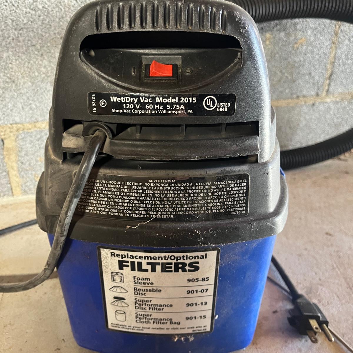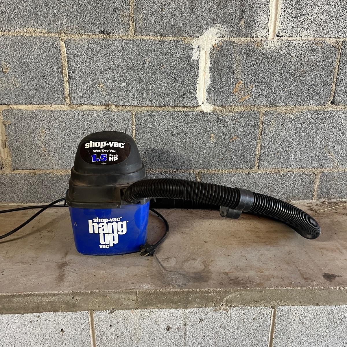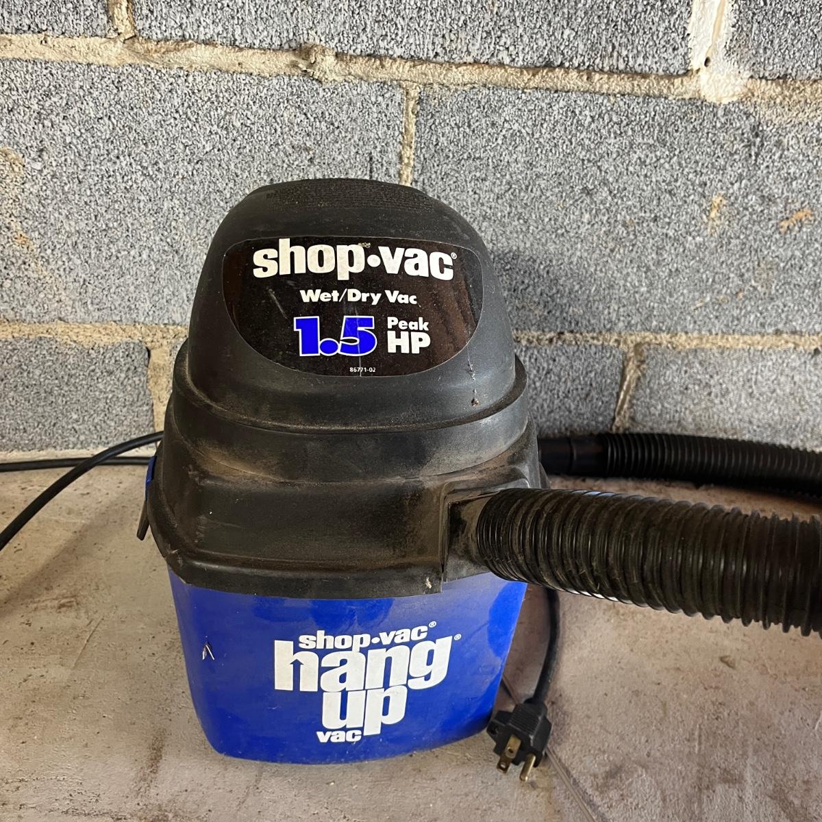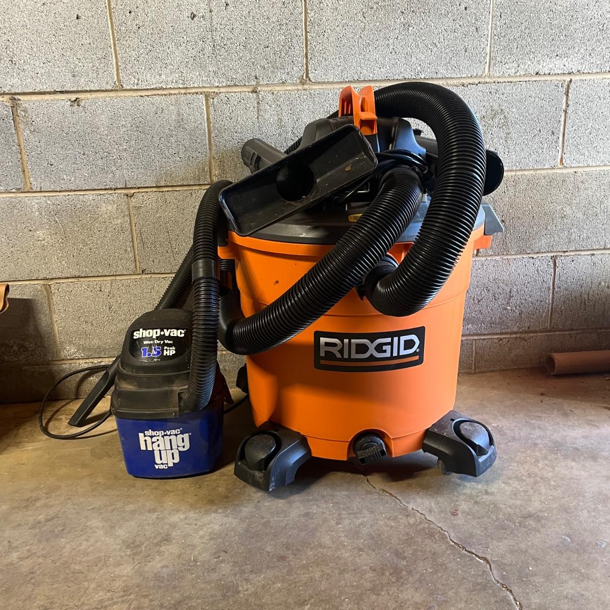 Lot includes a 16 gallon Ridgid wet dry vacuum and a 1 gallon Shop Vac. Both vacuums powered on when plugged in.