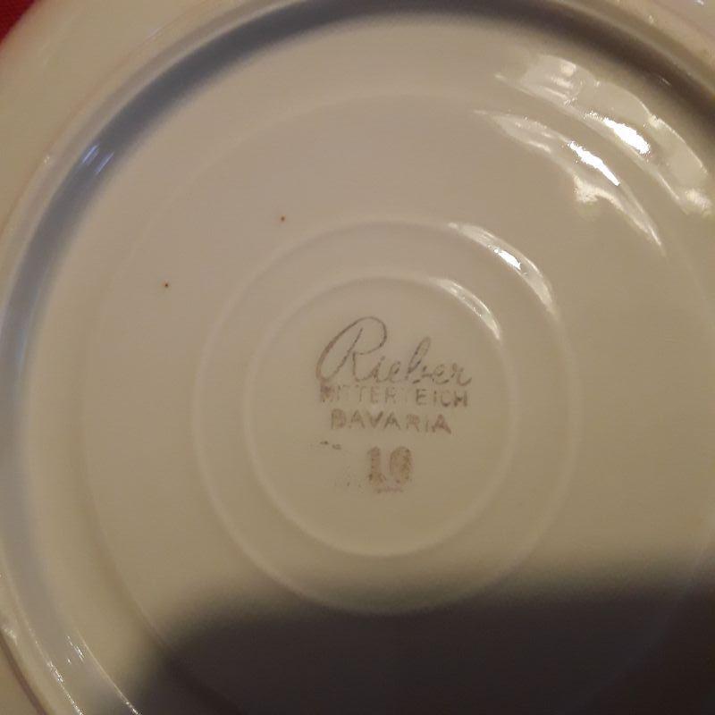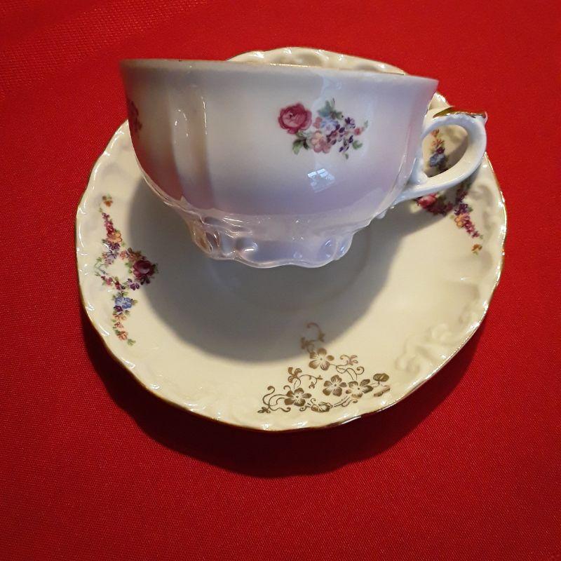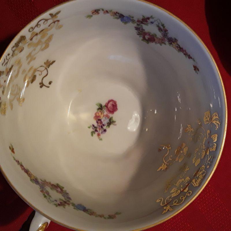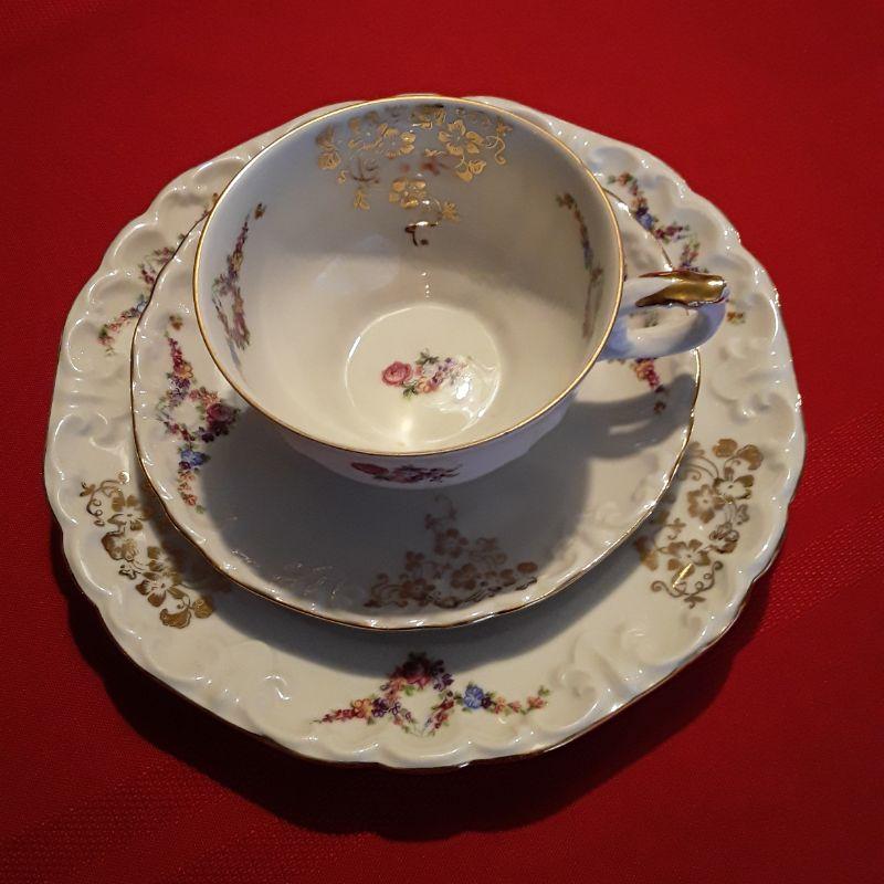 Rieber tea cup, saucer and dish small roses and flowered wreaths with gold overlay
