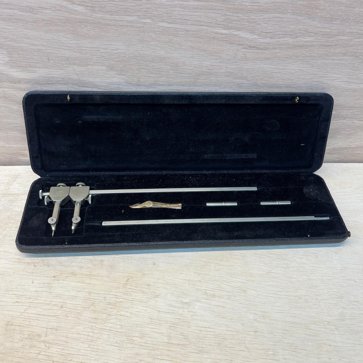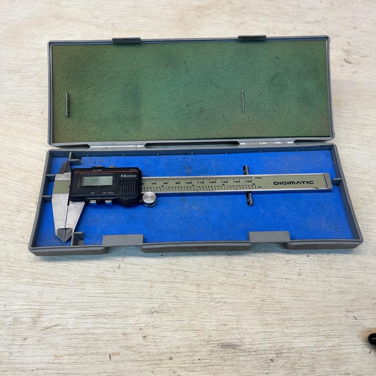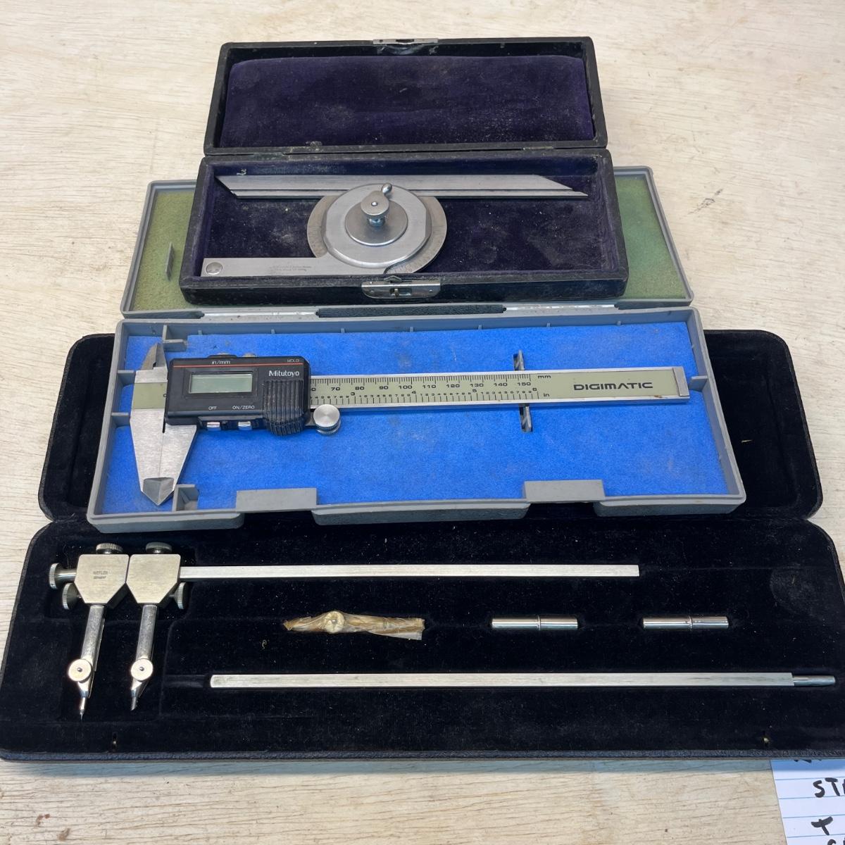 Lot includes a Mitutoyo digital caliper, Starrett bevel protractor and a Riefler compass. Largest box measures 12” x 3.5” x 1.5”H. Digital caliper appears to need new batteries.