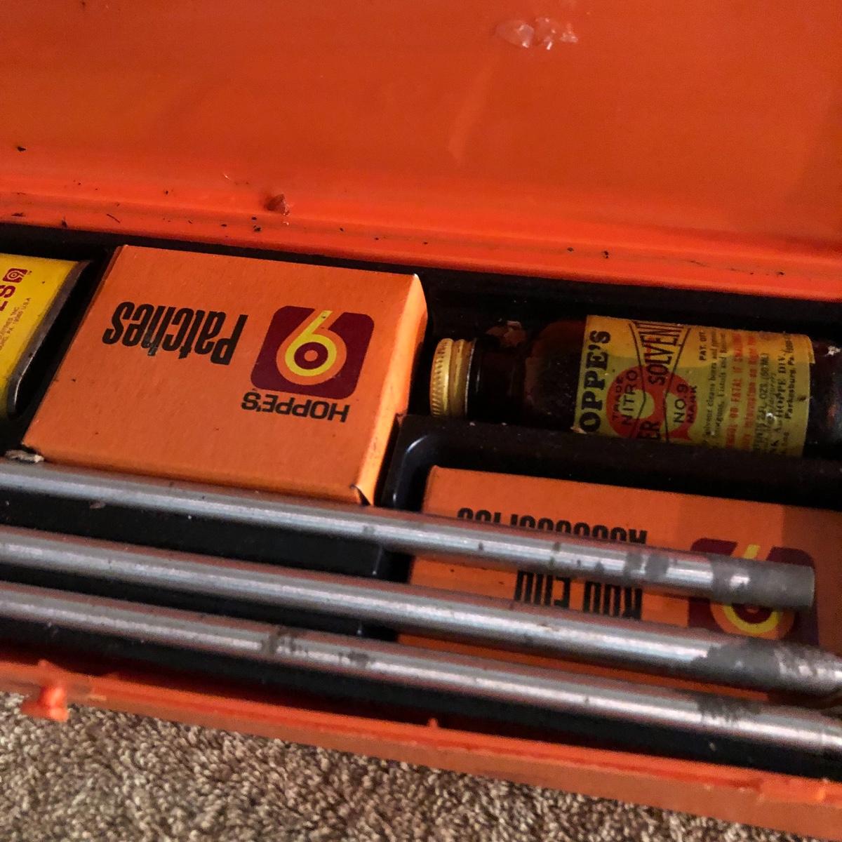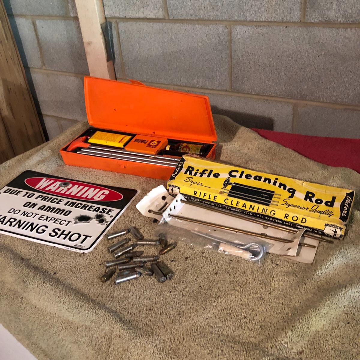 This lot has one complete Hoppes cleaning kit, a partial Outers cleaning kit, a handful of ammunition and a metal sign. Local pick up only.