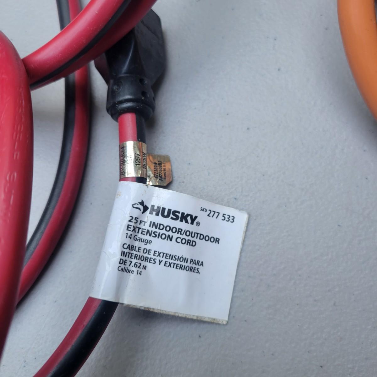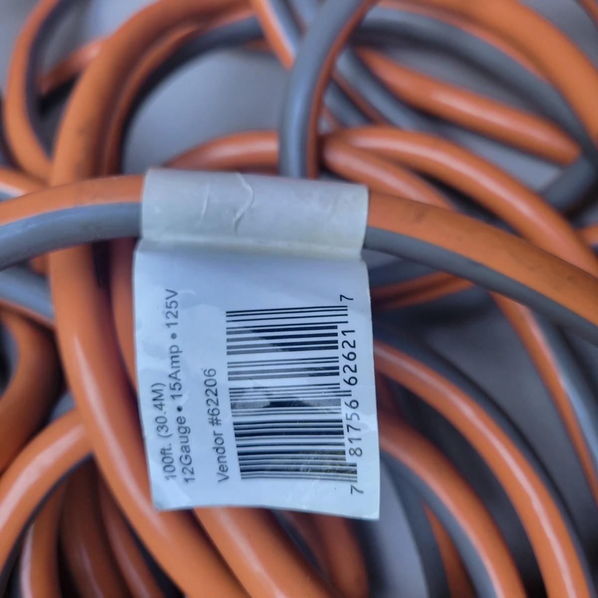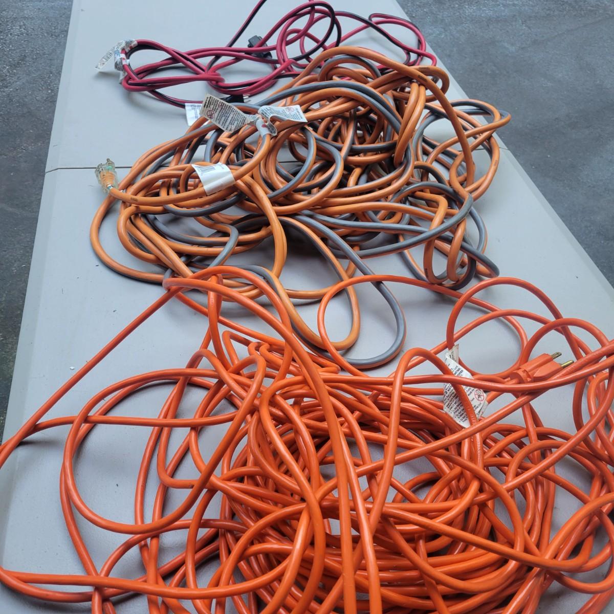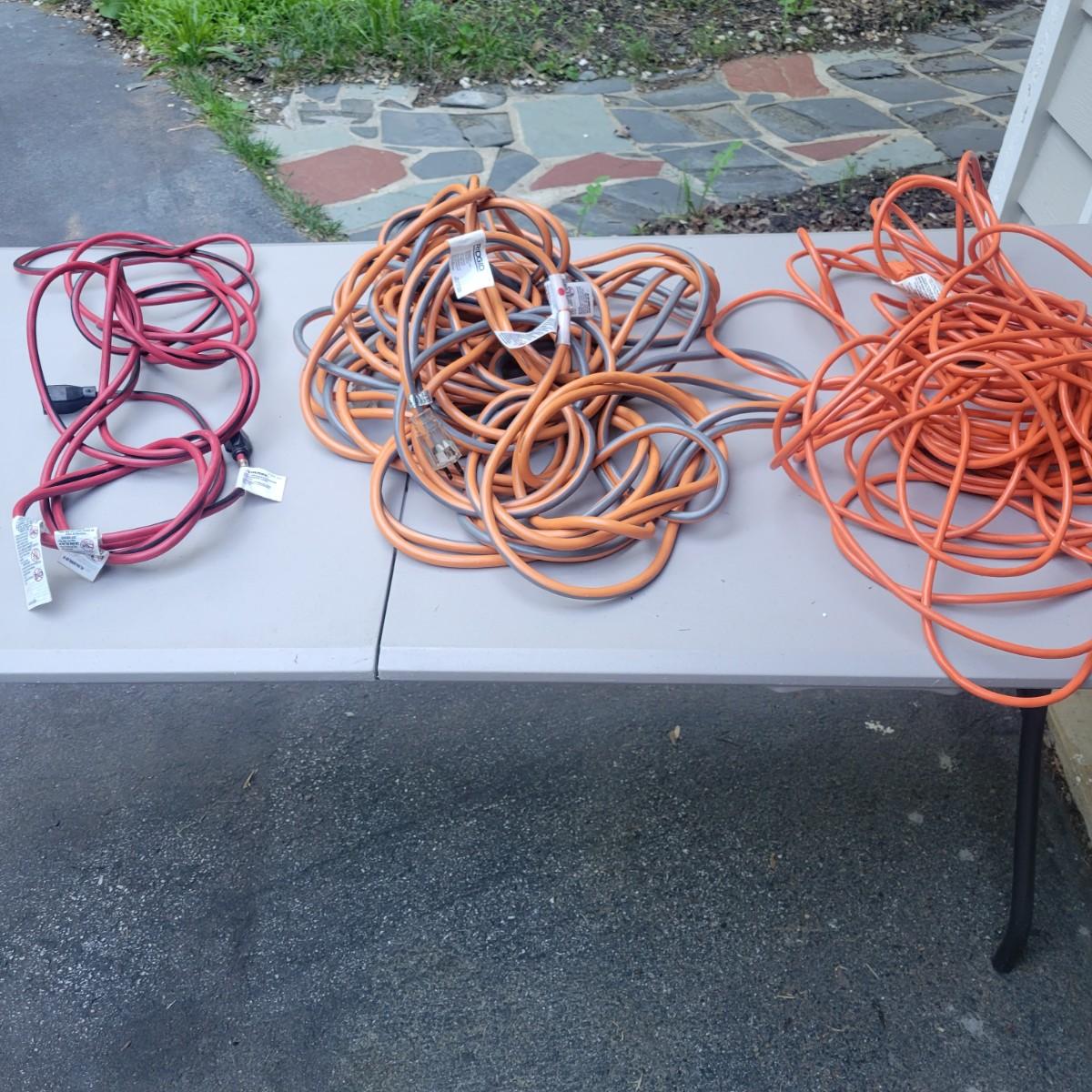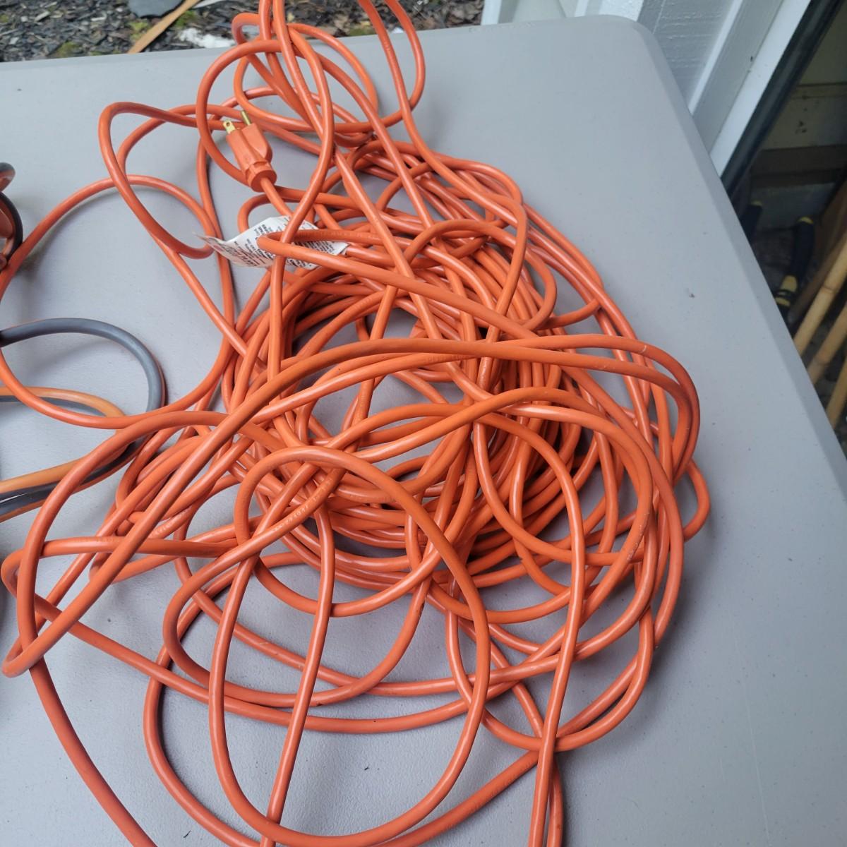 3 extension cords in good condition. Rigid 100' 12 Guage, 15 amp cord. Husky 25' 14 Guage cord and a outdoor 100' 16 Guage orange cord. Local pickup only