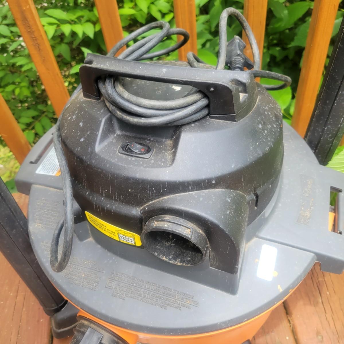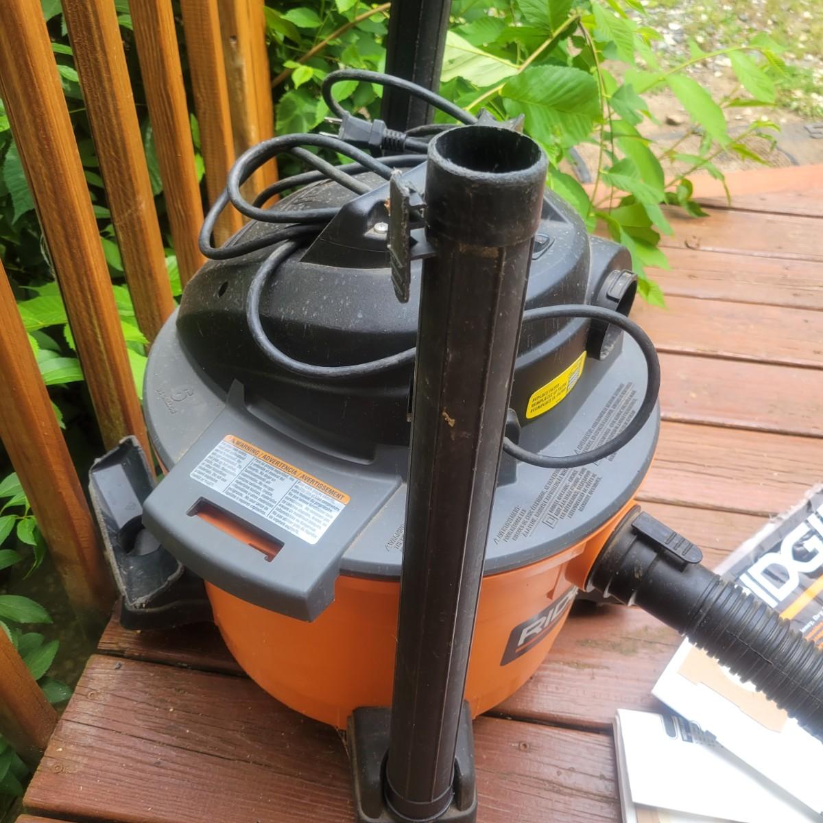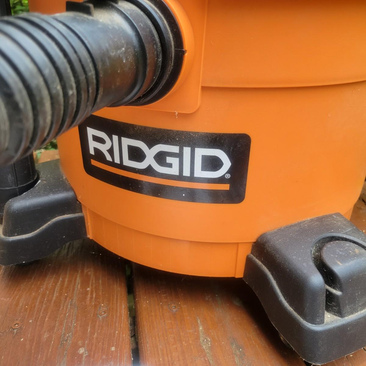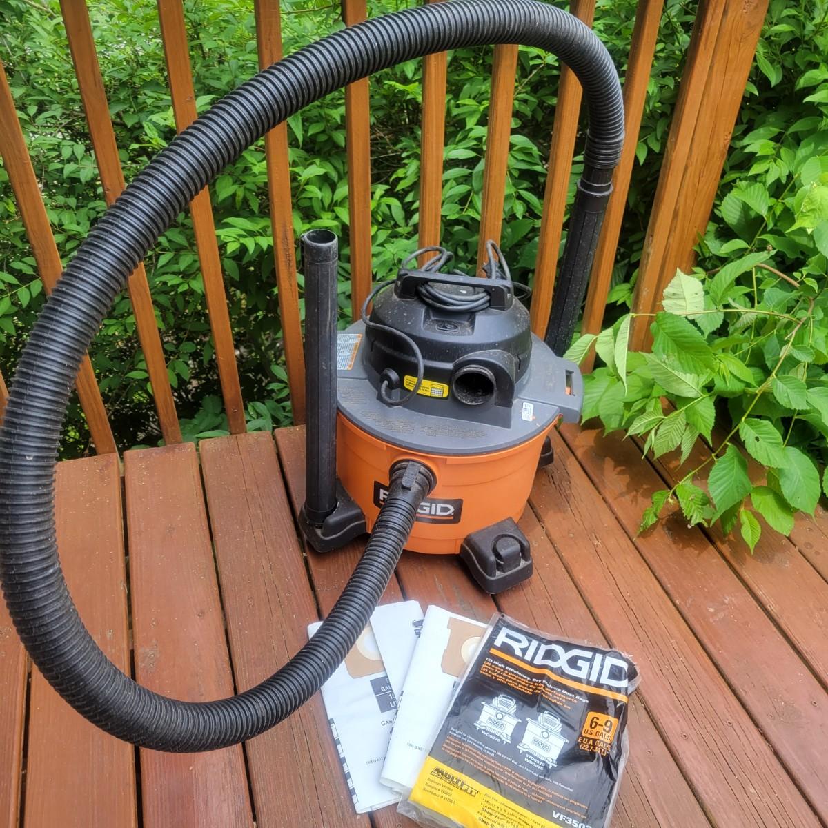 A Rigid 6gal wet/dry vac that powered on when plugged in. This vac comes with a hose extension, a head attachment and three extra bags. Measures approximately 20"D x 20"H. Local pickup only