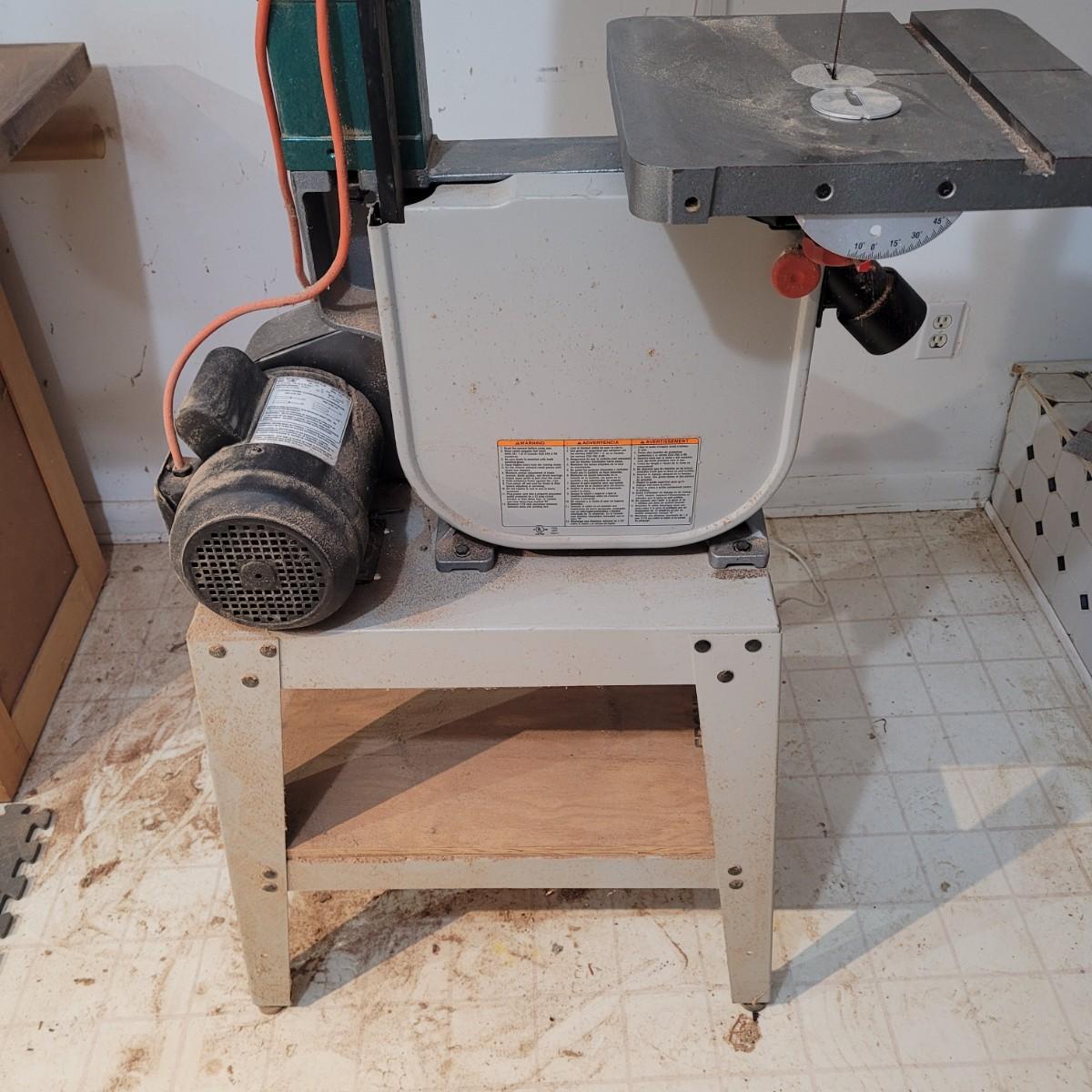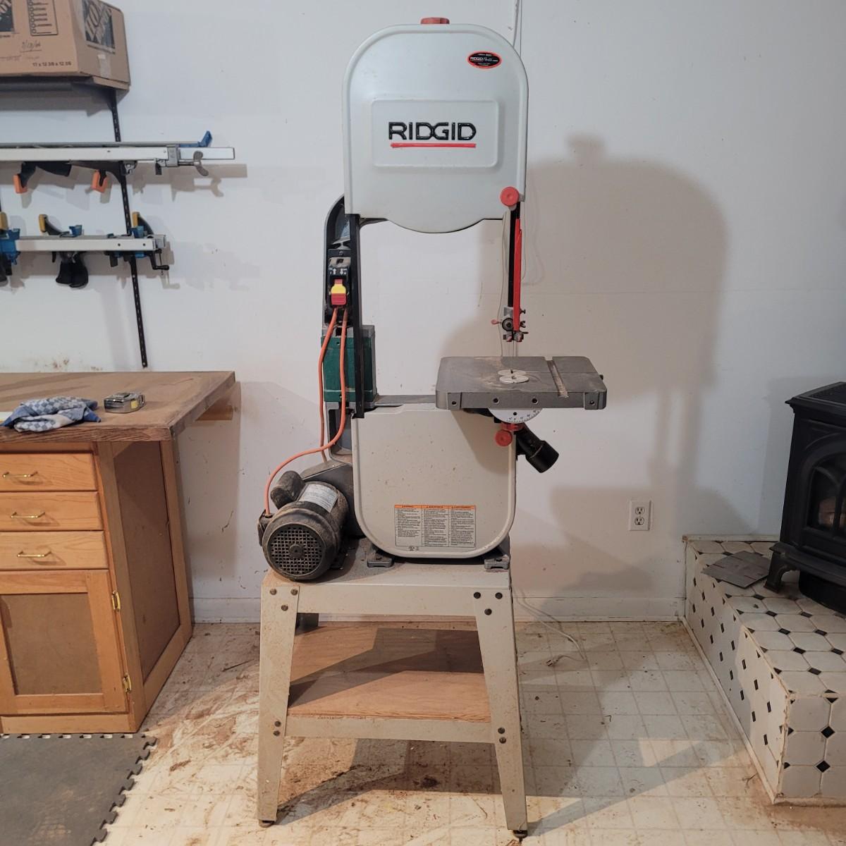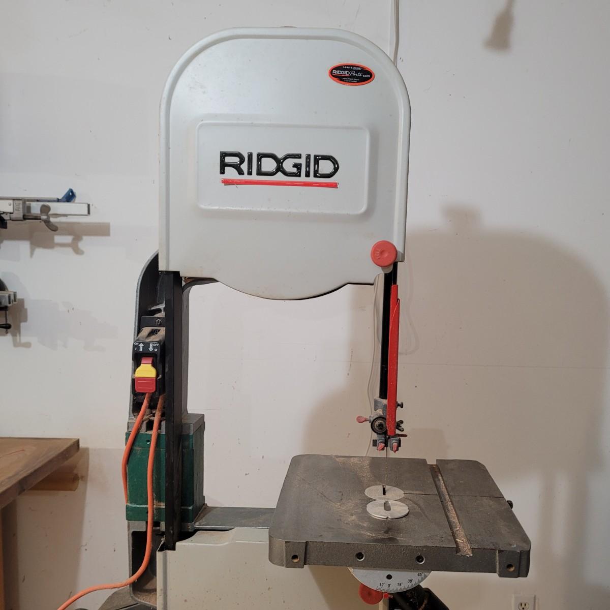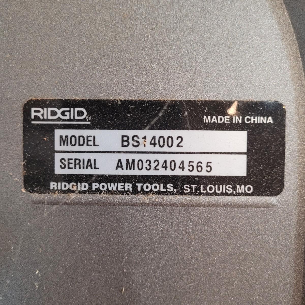 Ridgid brand band saw. Includes various extra blades and what appears to be a backup belt for the motor. Powers on and appears to be in working order. Attached table with shelf underneath. Operates at 3/4 horsepower. Item measures approximately 16" x 30" x 74"H.