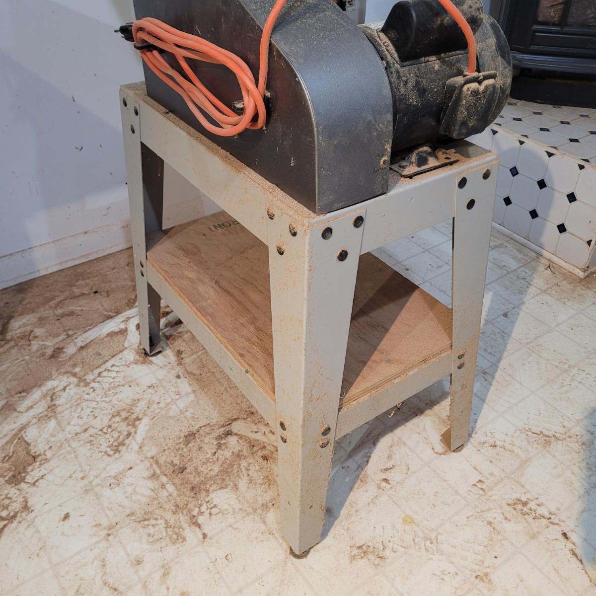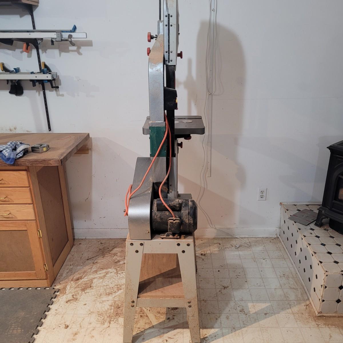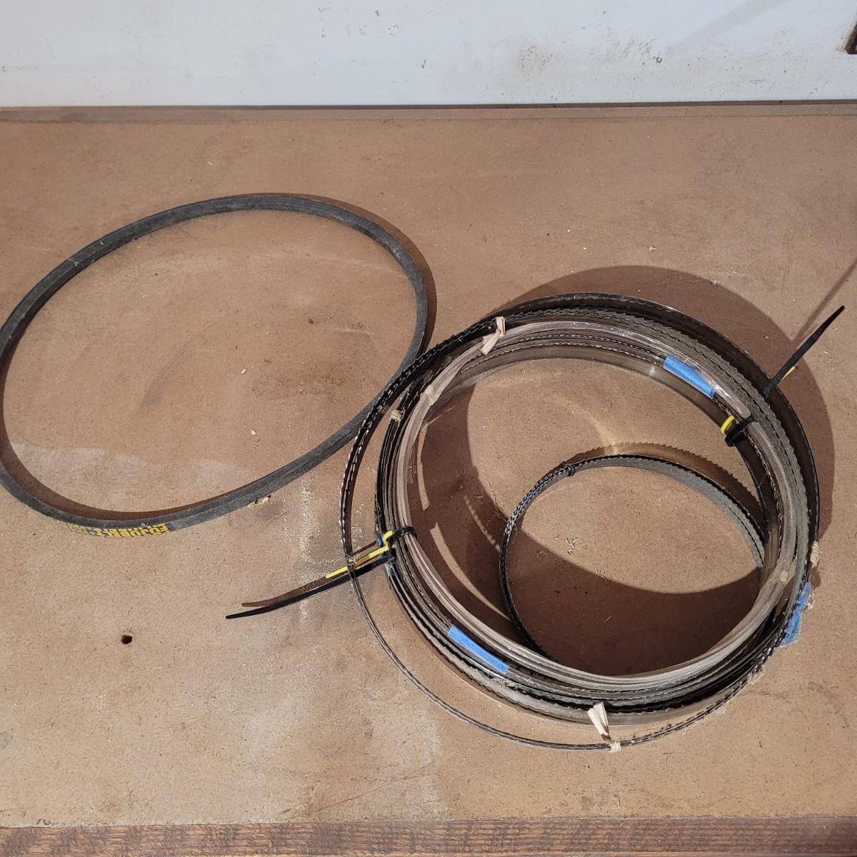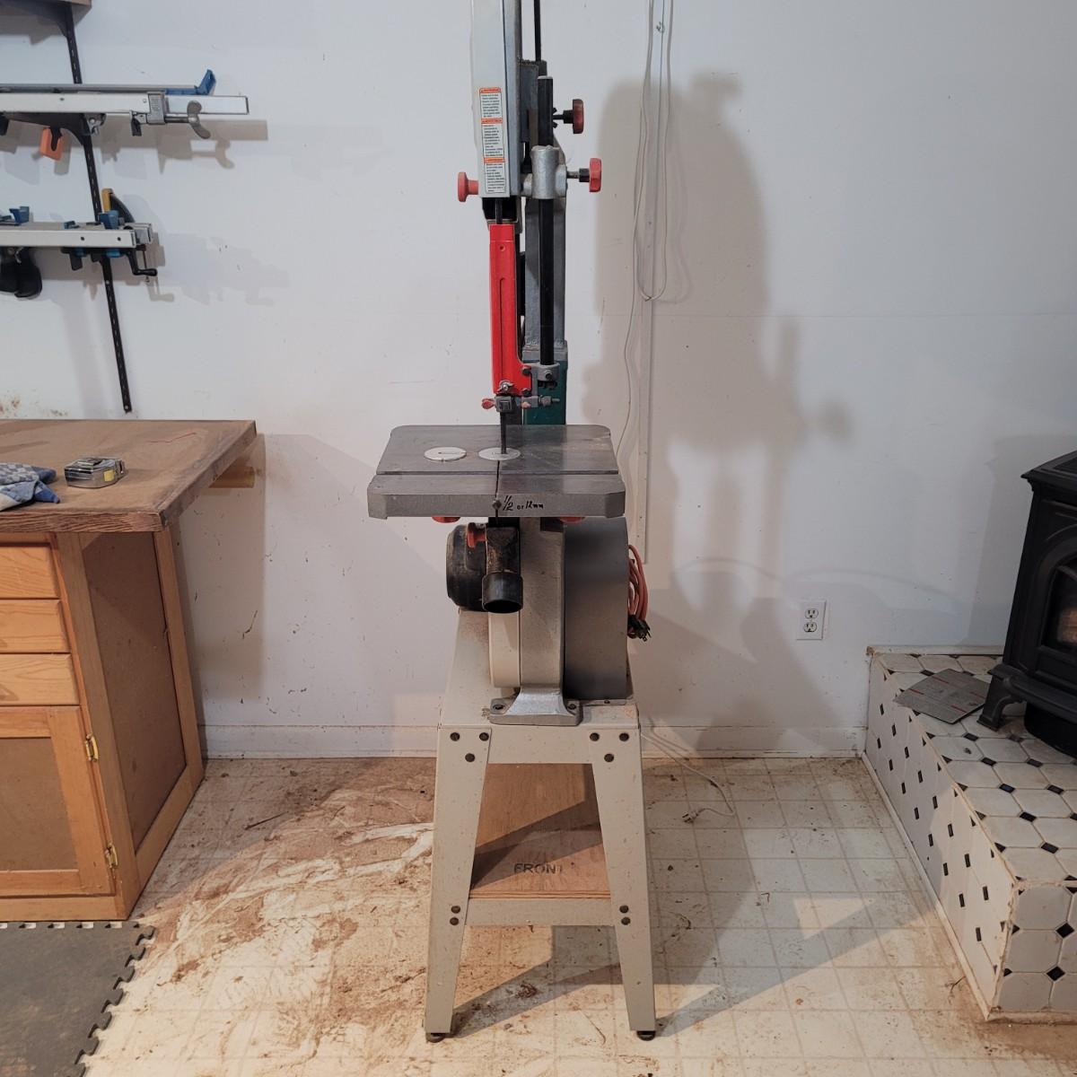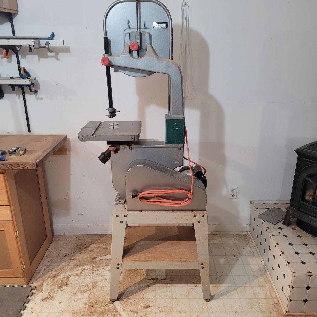 Ridgid brand band saw. Includes various extra blades and what appears to be a backup belt for the motor. Powers on and appears to be in working order. Attached table with shelf underneath. Operates at 3/4 horsepower. Item measures approximately 16" x 30" x 74"H.