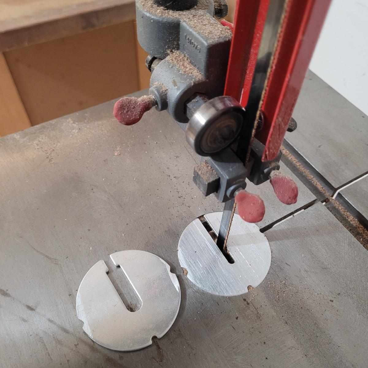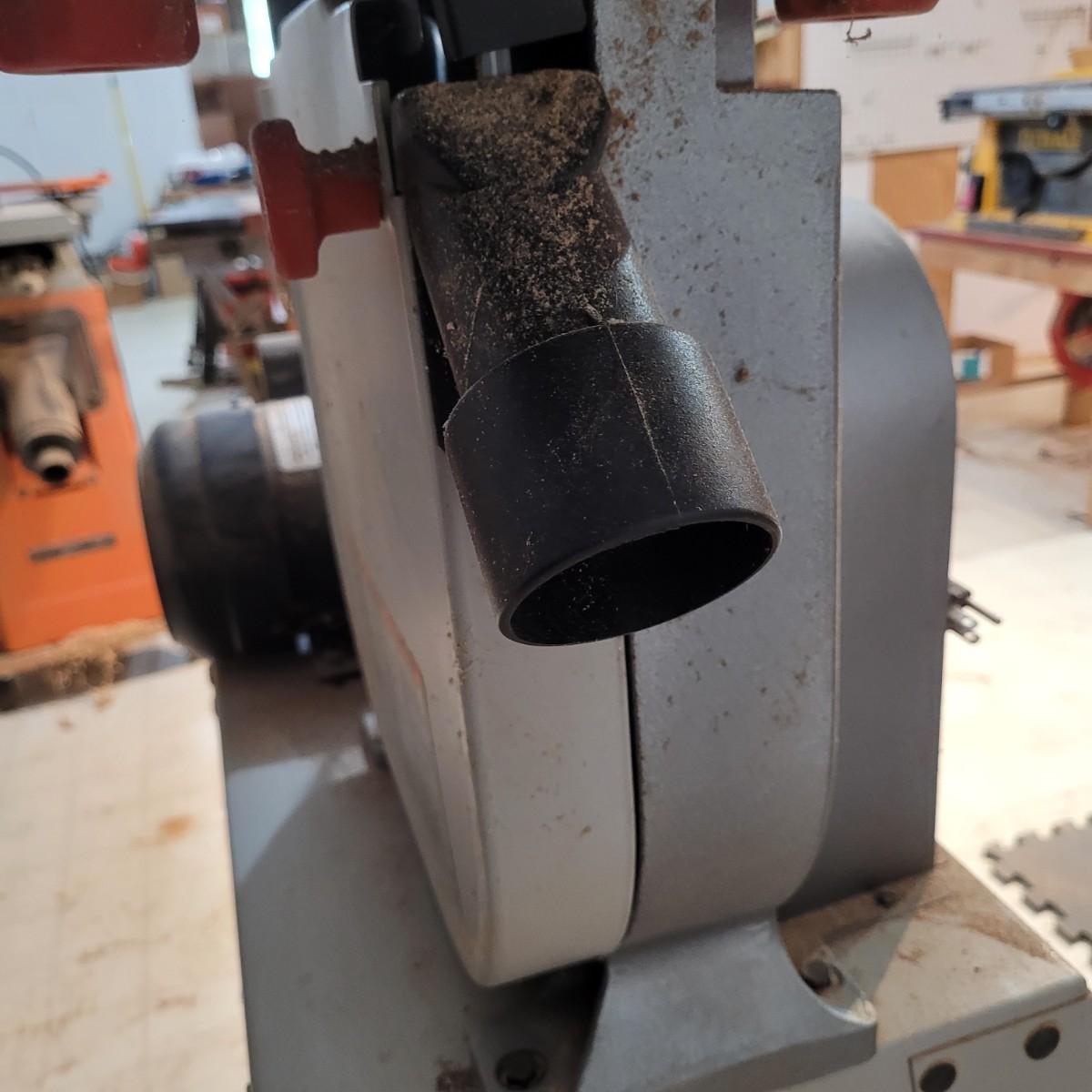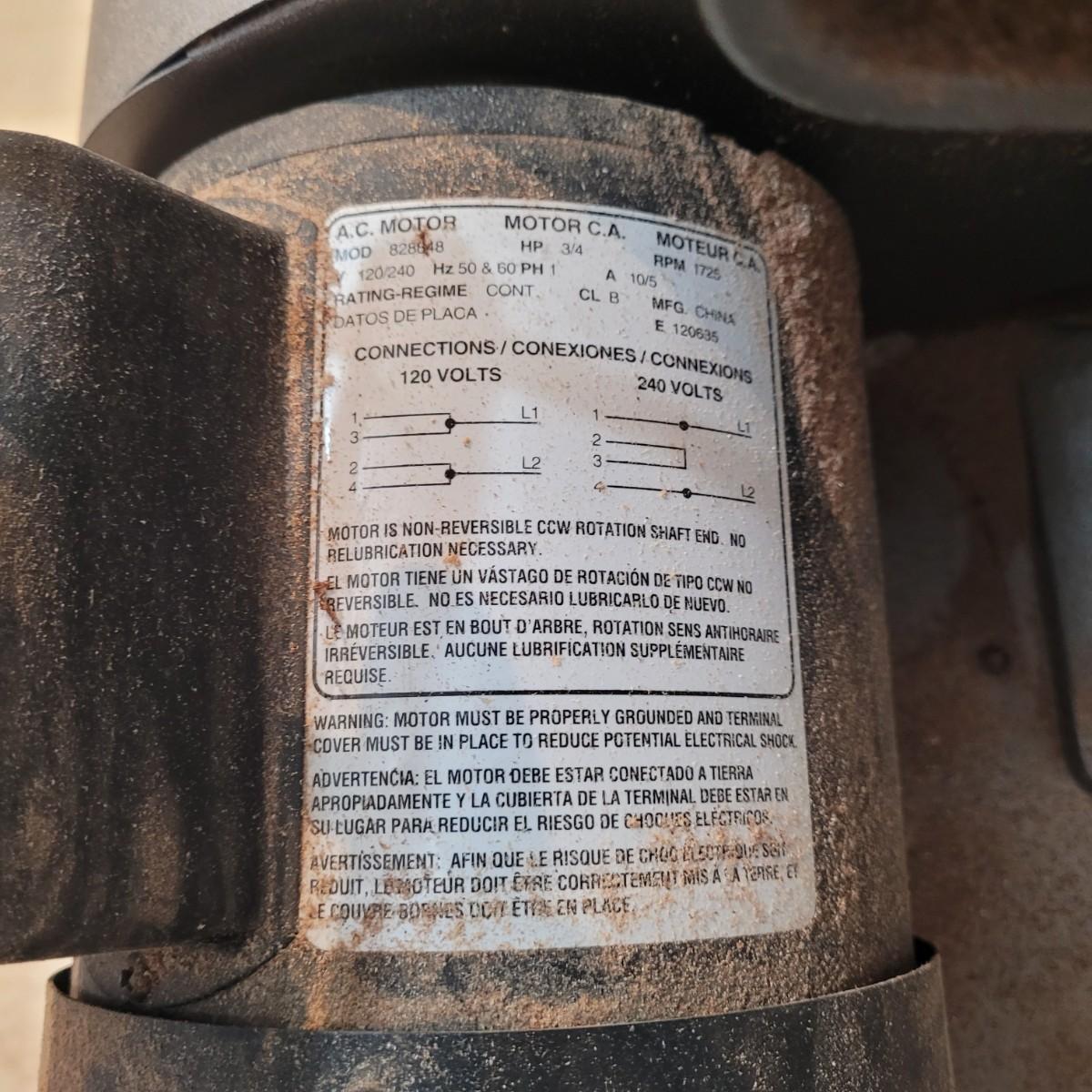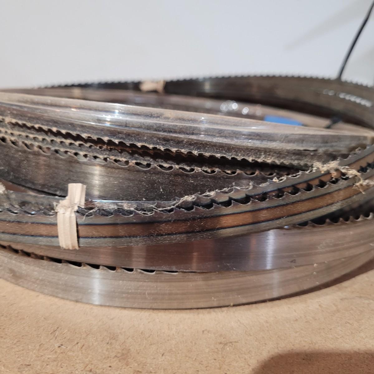 Ridgid brand band saw. Includes various extra blades and what appears to be a backup belt for the motor. Powers on and appears to be in working order. Attached table with shelf underneath. Operates at 3/4 horsepower. Item measures approximately 16" x 30" x 74"H.