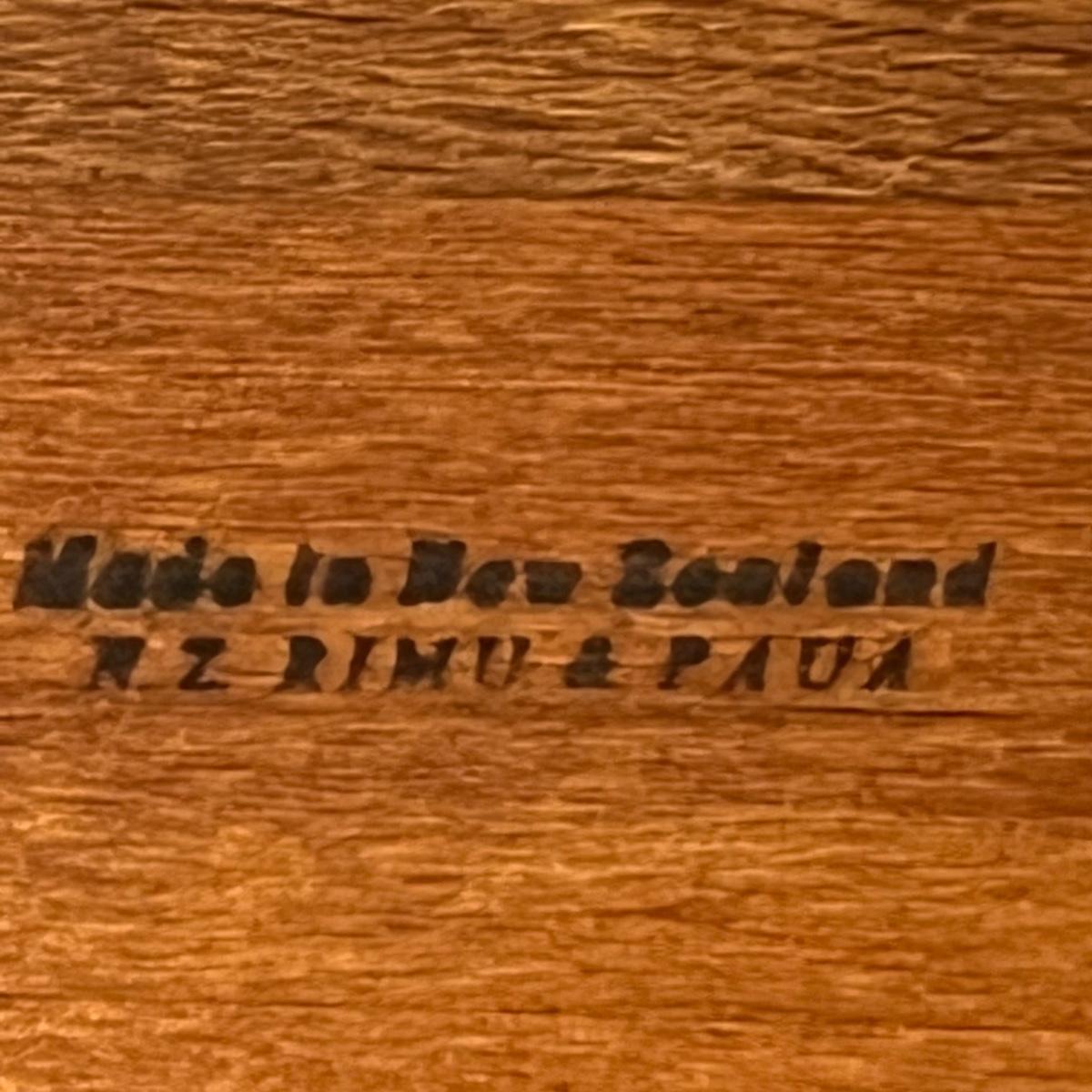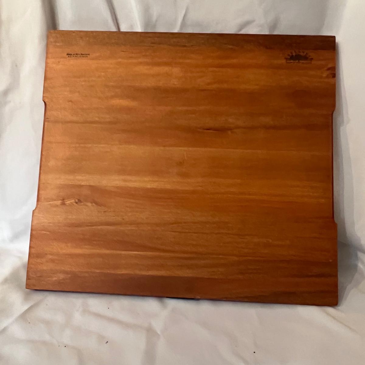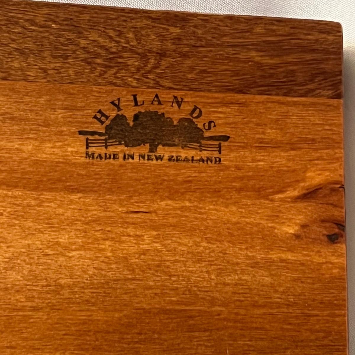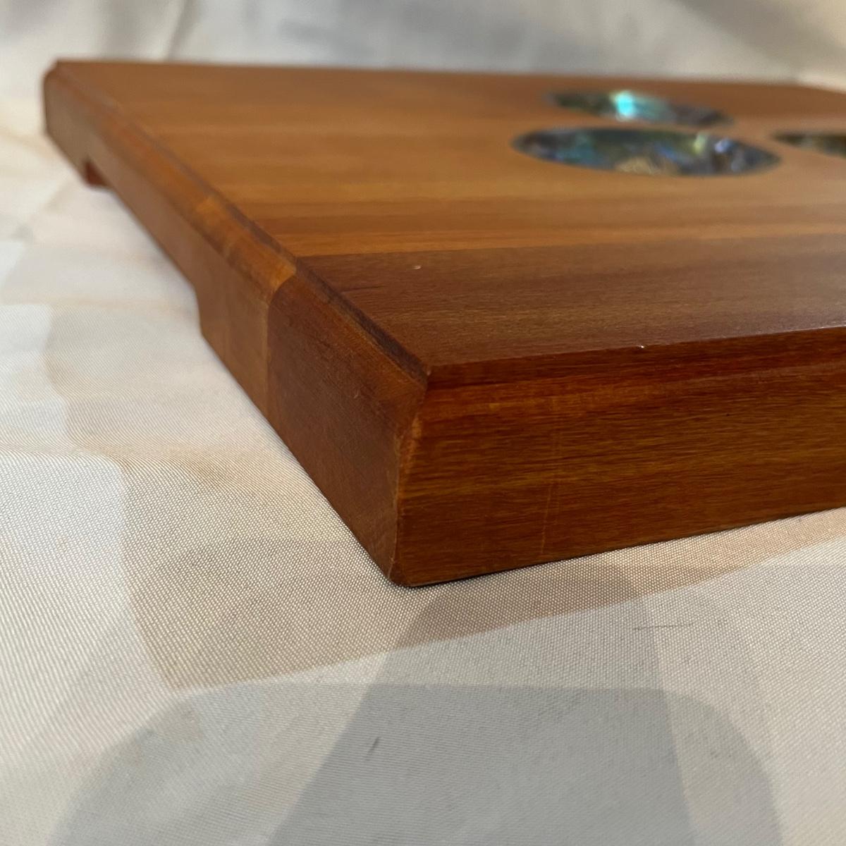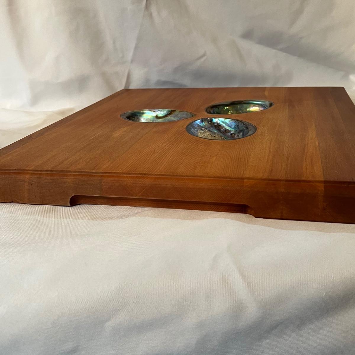 This solid Rimu wood cheeseboard is 1.5” thick and has three Paua shells sunken down into its center. There is a small dark stain shown in images. Board measures 17” x 19.5”.